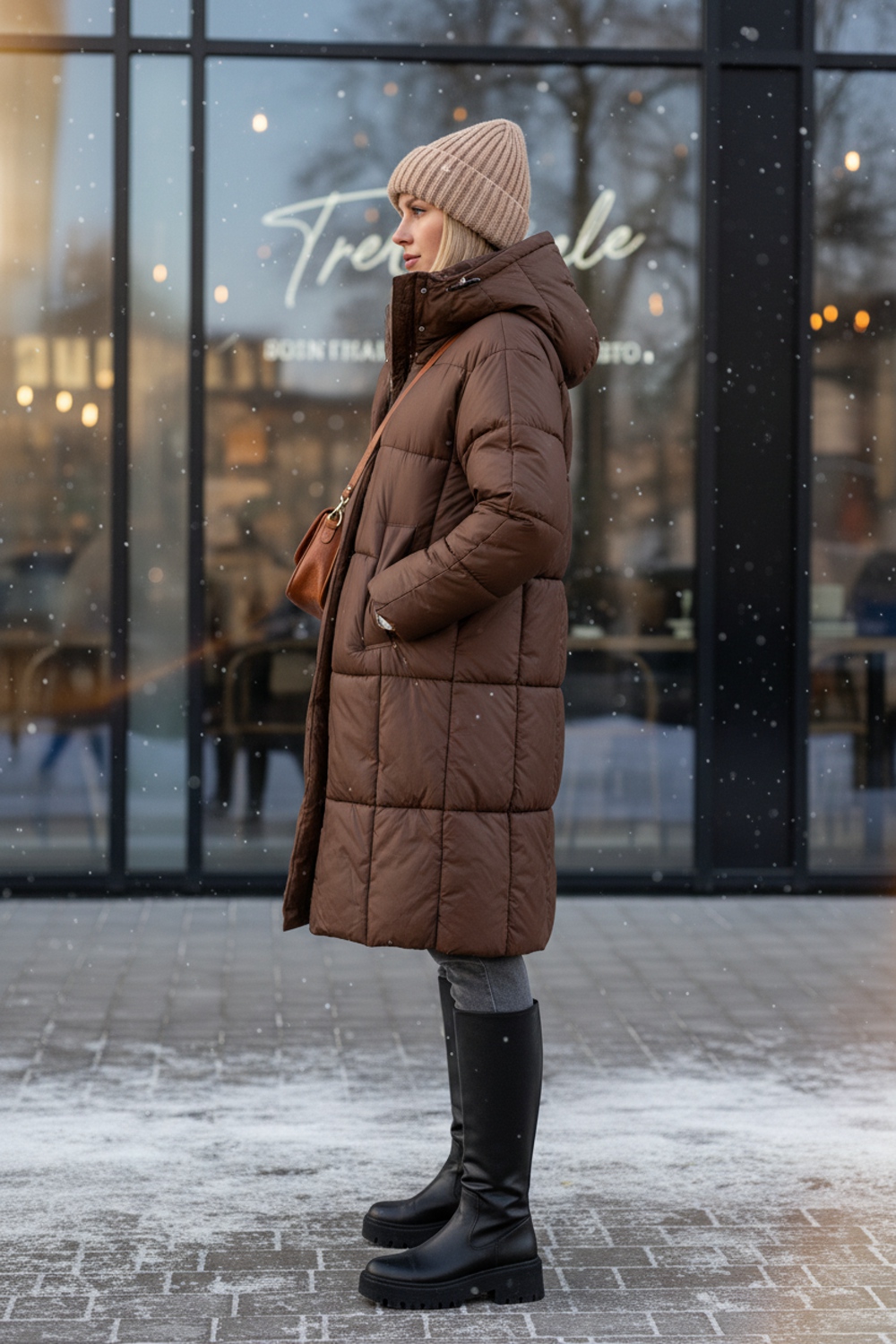Важнейшая особенность — качественный утеплитель файбер. Он равномерно распределён благодаря простеганной крупными квадратами конструкции, что исключает скапливание наполнителя в отдельных местах и сохраняет постоянное тепло по всей поверхности. Такая строчка гарантирует комфорт и защиту от холода без потери легкости и объема. Внутренний чёрный фирменный подклад износостоек и выглядит стильно.