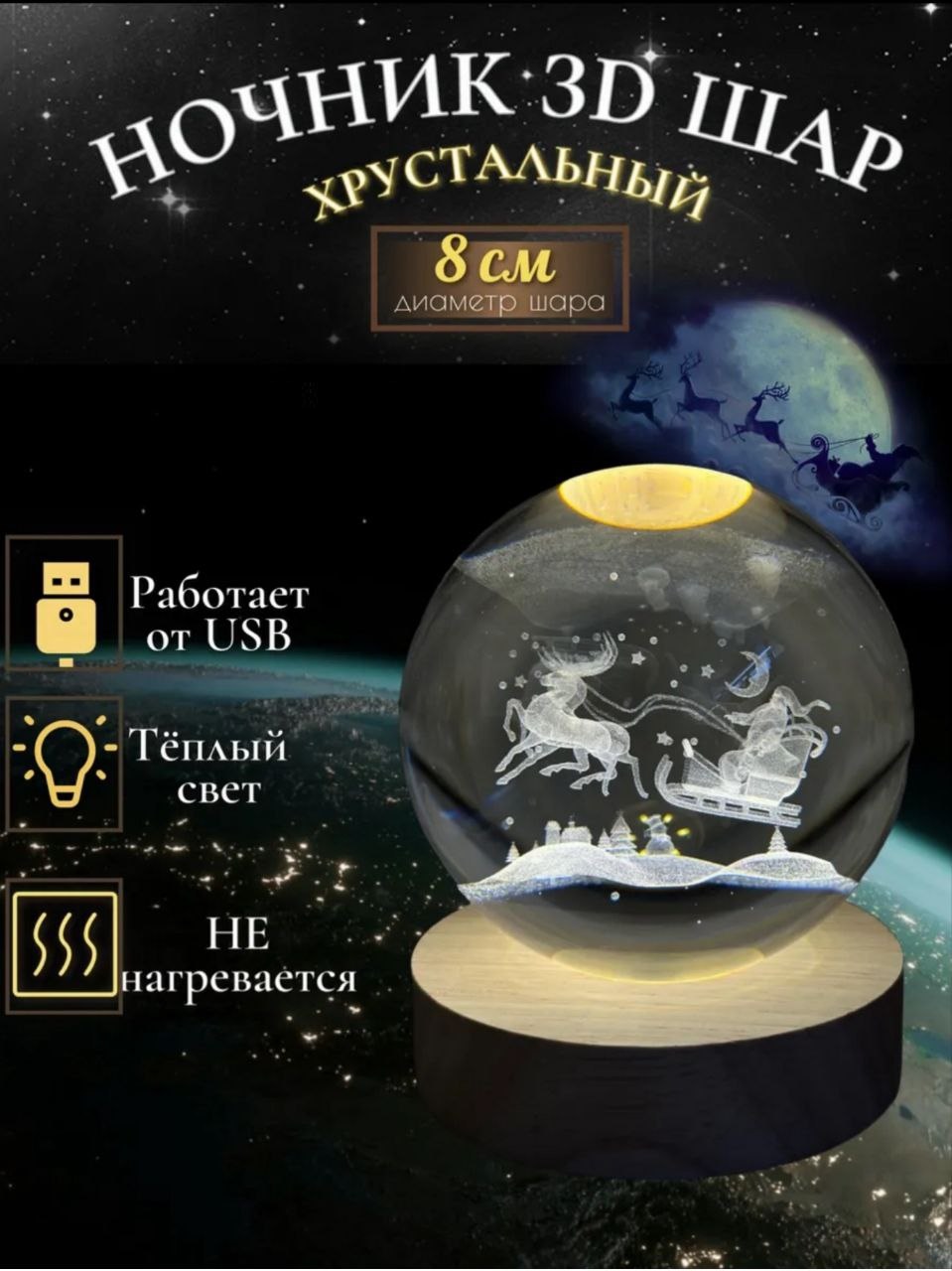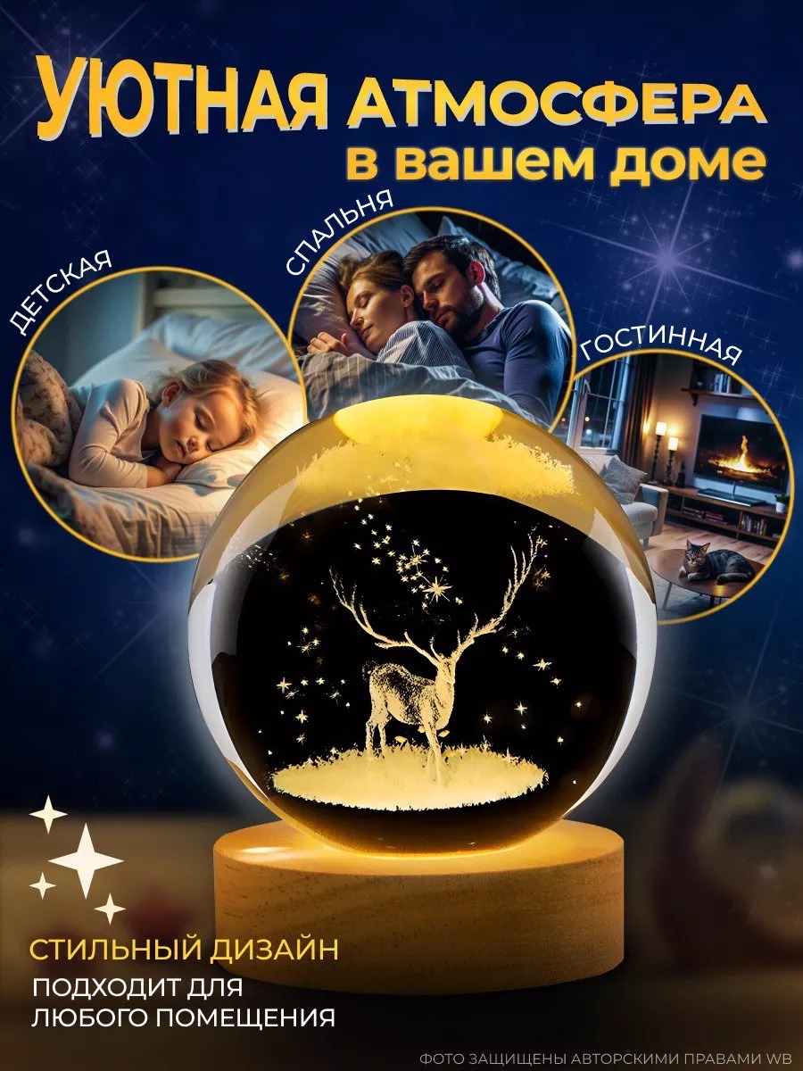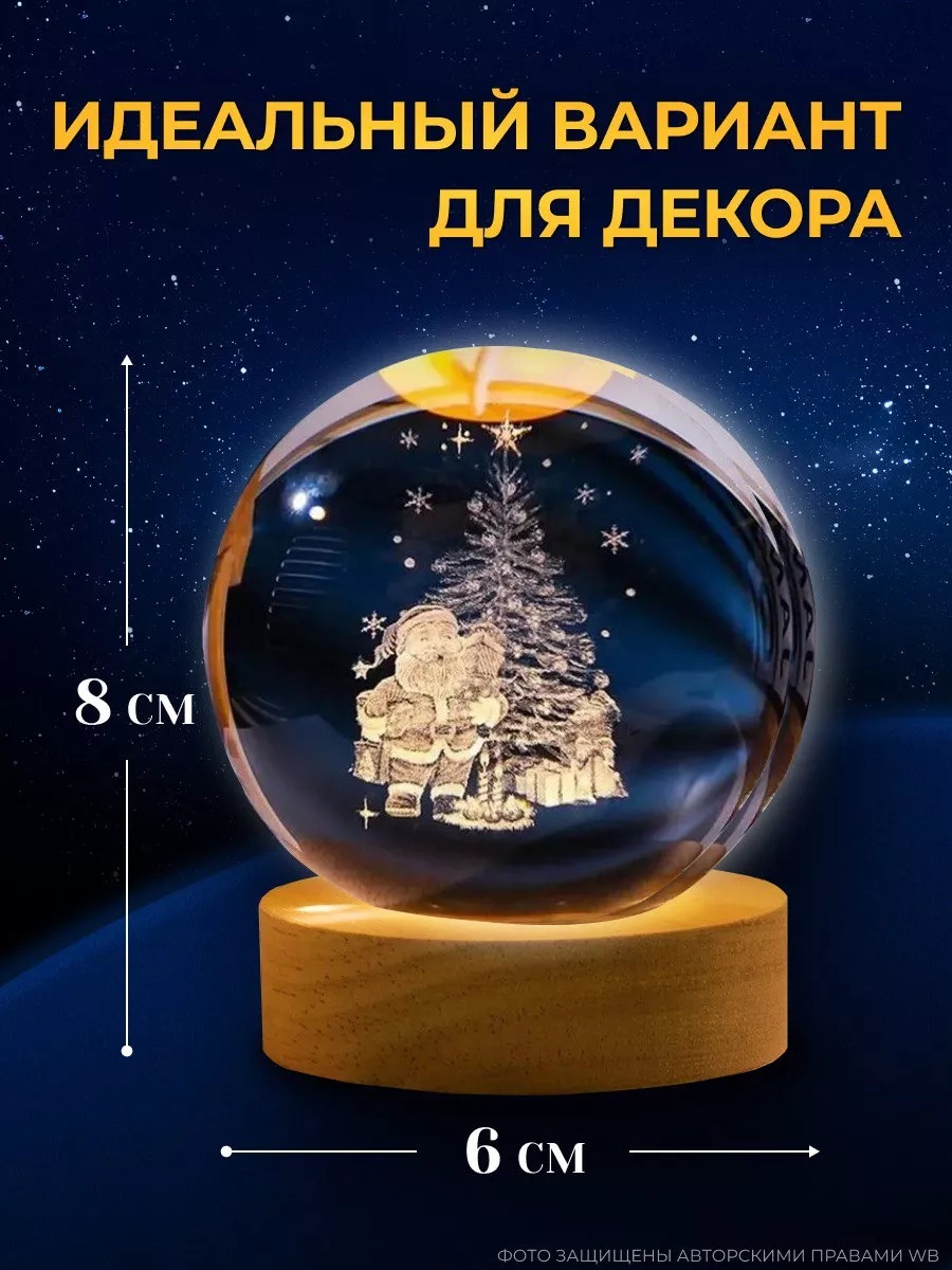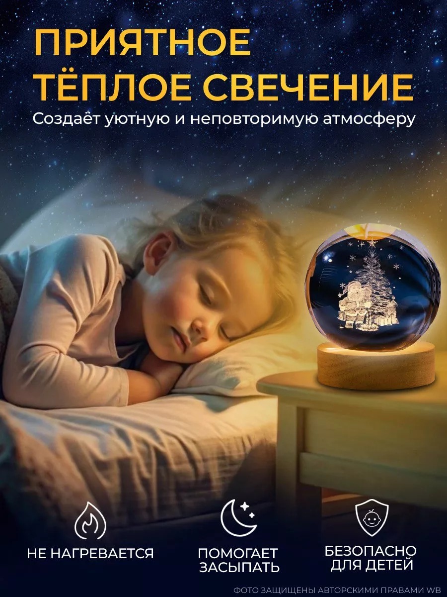 Светильник "Стеклянный Шар" без музыки - это не просто ночник, а настольная лампа, которая создает атмосферу спокойствия и уюта. Детский ночник идеально подходит для тех, кто хочет расслабиться и настроиться на сон. Ночник станет отличным дополнением для вашего дома или дачи. Он оснащен деревянным основанием, из которого исходит свет, подсвечивая узоры на стеклянном шаре. В темноте он выглядит волшебно и очень красиво, создавая уютную атмосферу в комнате и становясь прекрасным декором для интерьера. ночник луна шар изготовлен из экологически чистых и гипоаллергенных материалов - дерева и стекла, а его декор выполнен в виде лазерной гравировки внутри стеклянного шара. Благодаря своим миниатюрным размерам, этот 3D светильник идеально подойдет для украшения детской комнаты, спальни или кабинета. Ночник луна левитирующая выполняет свою основную функцию, создавая мягкий рассеянный свет, который не раздражает глаза и помогает расслабиться перед сном. Благодаря современной технологии, светильник не имеет пульсаций света, а его освещение является ровным и приглушенным, что идеально подходит для комфортного сна или ночной подсветки. Подключение светильник к питанию осуществляется через USB-кабель, который идет в комплекте (длиной 100 см). !Важно отметить, что адаптер с USB-разъемом в розетку не входит в комплект! Диаметр шара составляет 6 см, а сам светильник не нагревается во время работы. В комплекте вы получите один шар и одну подставку с подсветкой. В ассортименте новогодние варианты светильников.