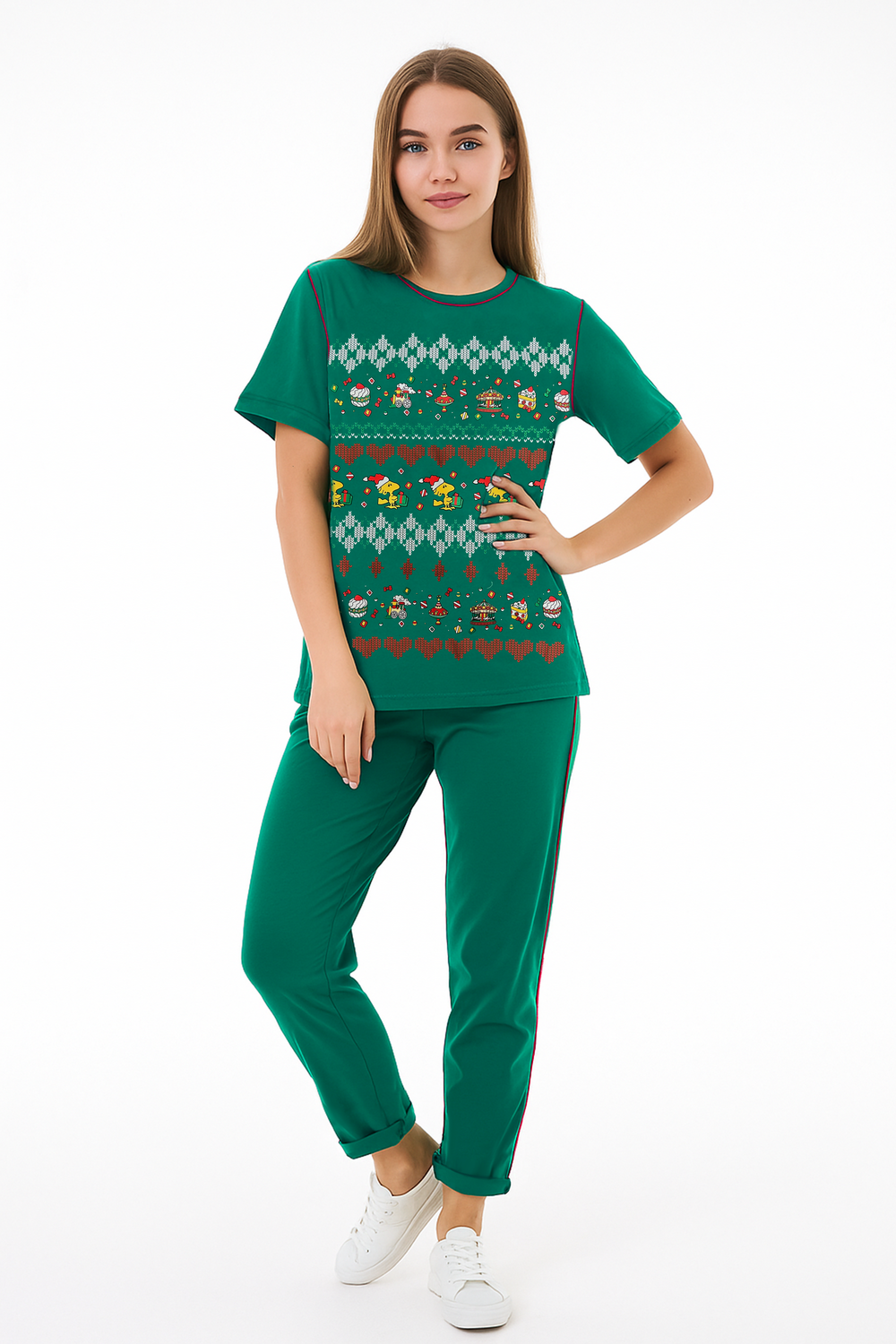 Домашний костюм с удобными брюками с подворотами и контрастной красной полоской по бокам. Футболка с праздничным качественным принтом. Шикарный образ для дома и отдыха. Эта модель выполнена из премиального интерлока.