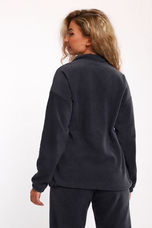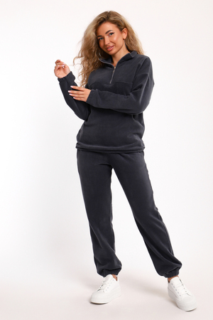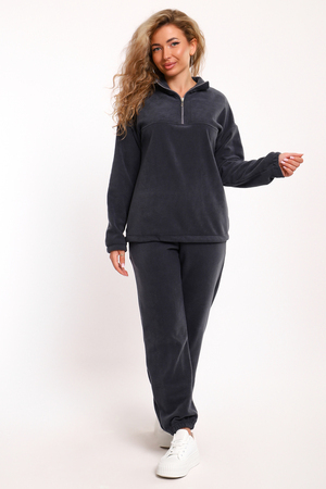 Костюм женский флисовый состоит из толстовки и брюк. Толстовка с кокеткой, на молнии, с воротником-стойкой, рукав спущенный внизу на резинке. Брюки с карманами, внизу на резинке. Костюм мягкий, теплый, удобный, идеально подойдет для прогулок и отдыха в прохладное время года. Молния может отличаться по цвету.