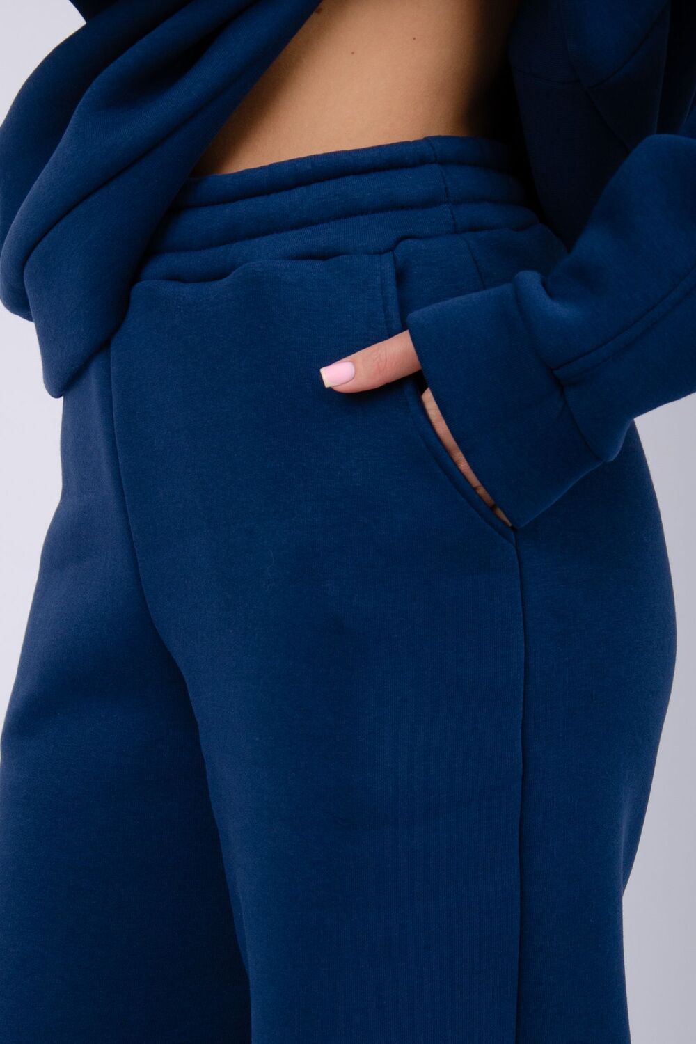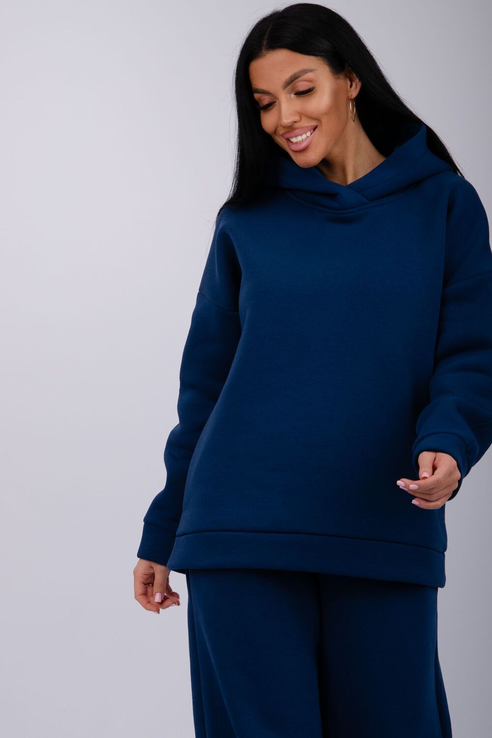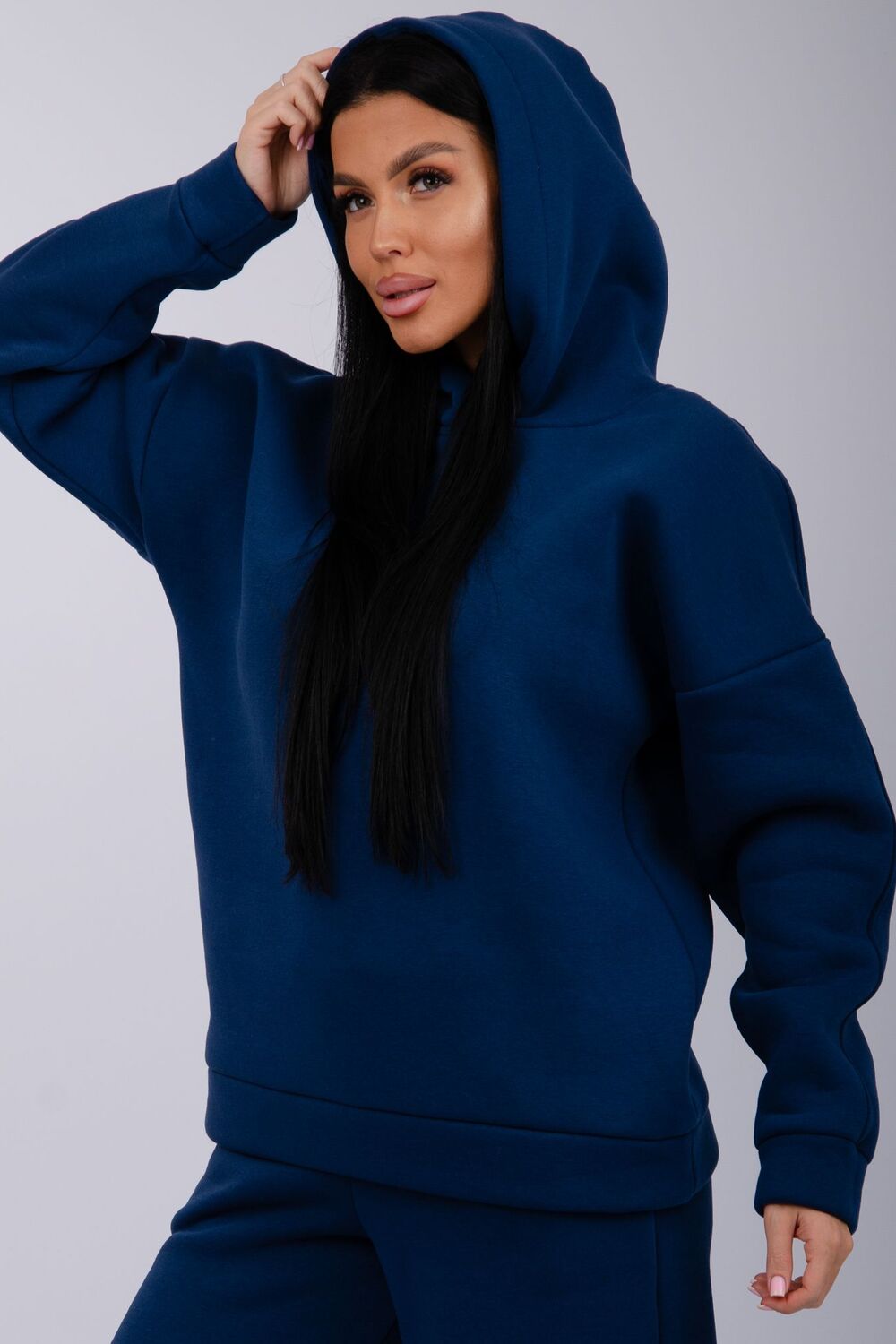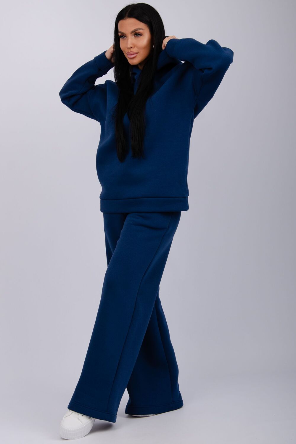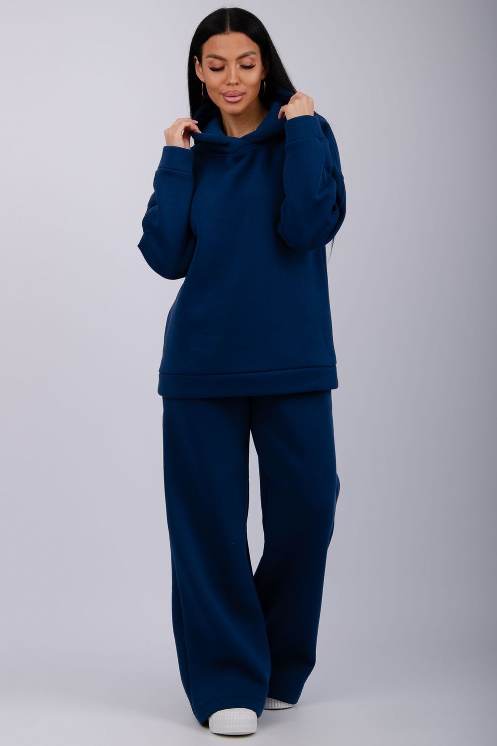 Теплый женский спортивный костюм из плотного футера, который выполнен из 3-х ниточного трикотажного полотна с начесом. Утепленное худи прямого силуэта с втачным спущенным рукавом и капюшоном, брюки палаццо на резинке свободного кроя подходит для прогулок и занятия спортом в прохладную погоду. Благодаря натуральному составу ткани, костюм прекрасно подходит для прохладной погоды, он выполнен из мягкого хлопка с лицевой стороны и с начесом внутри.