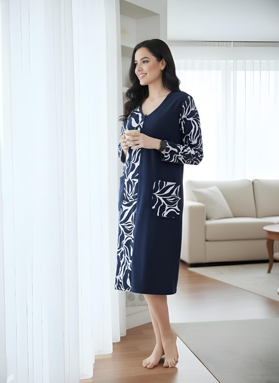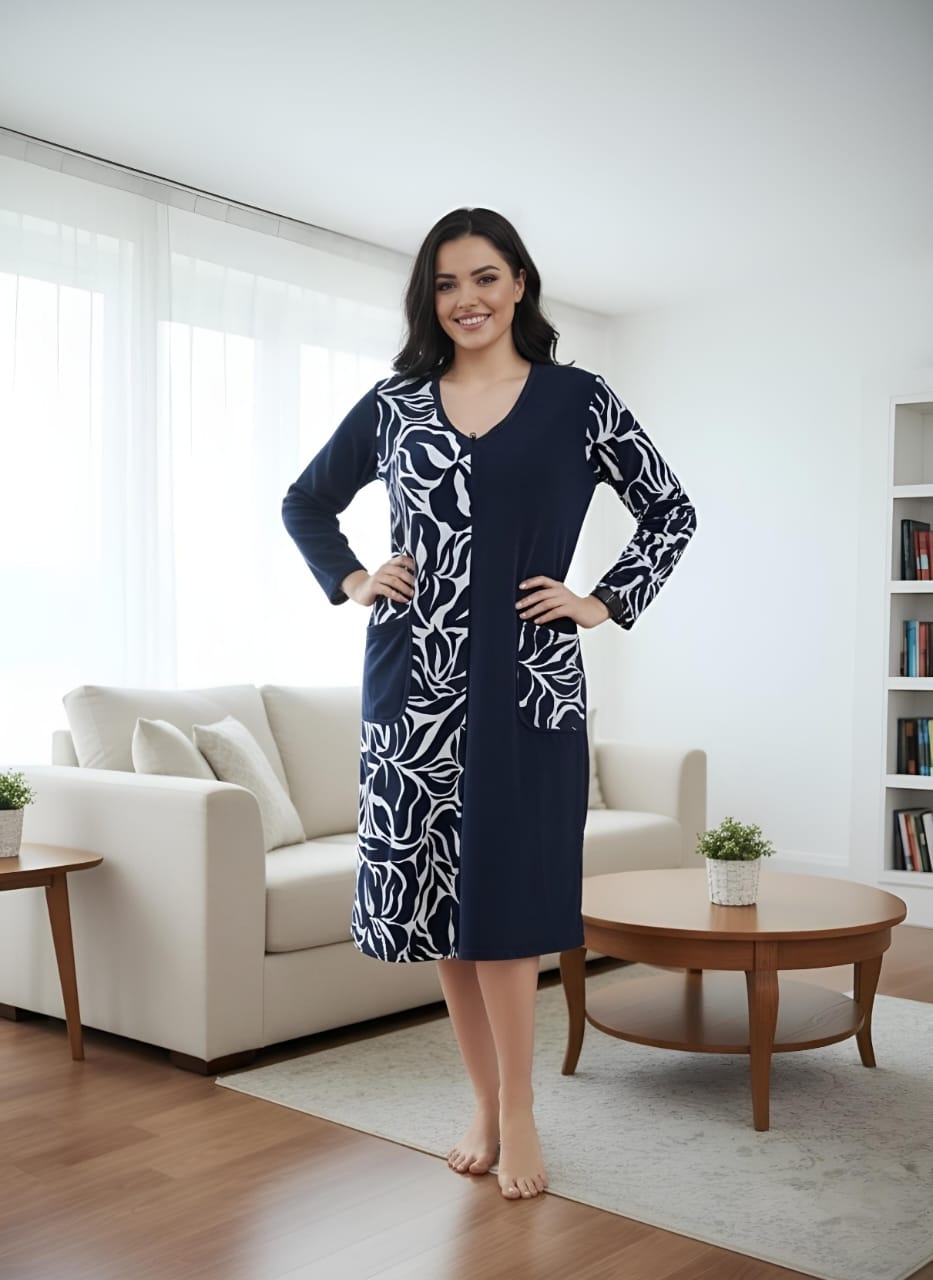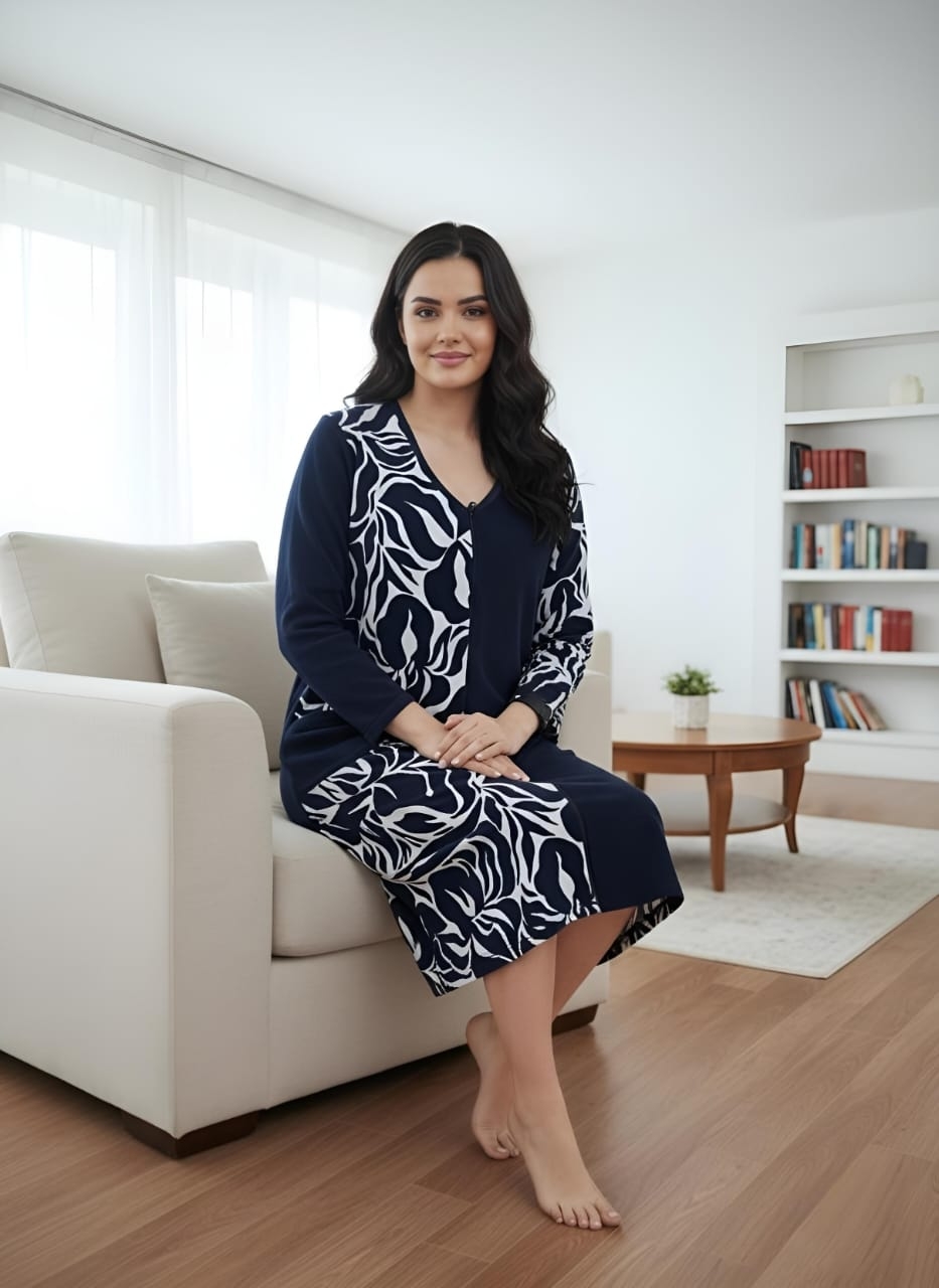 Элегантный женский халат на молнии, выполненный в стиле домашнего платья. Глубокий темно-синий цвет гармонично сочетается с контрастным бело-черным растительным или абстрактным принтом, расположенным вертикальной вставкой спереди и на рукавах. Удобная длина миди, V-образный вырез и практичные карманы делают его идеальным для стильного и комфортного отдыха дома.