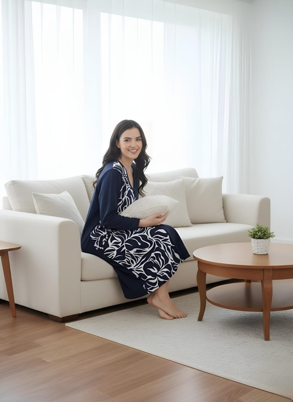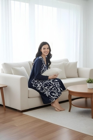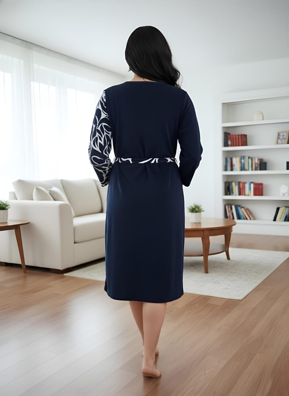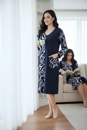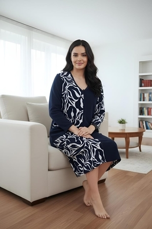 Элегантный женский халат на молнии, выполненный в стиле домашнего платья. Глубокий темно-синий цвет гармонично сочетается с контрастным бело-черным растительным или абстрактным принтом, расположенным вертикальной вставкой спереди и на рукавах. Удобная длина миди, V-образный вырез и практичные карманы делают его идеальным для стильного и комфортного отдыха дома.