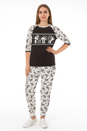 Домашний костюм с брюками и свитшотом с рукавом 3/4 выполнен их мягкого трикотажа на основе 100% хлопка. Материал не теряет форму после стирки и долго сохраняет яркость рисунка. Футболка с рукавом 3/4, брюки прямого кроя на манжетах.