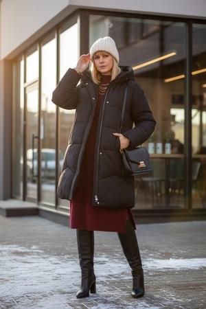 Продуманная функциональность: два боковых кармана на молниях аккуратно вписаны и дополнены минималистичными декоративными вставками под лёгким углом, что визуально удлиняет фигуру. Эластичные трикотажные манжеты на рукавах плотно облегают запястья и не пропускают холод, а внутренний карман — надёжное место для хранения смартфона, ключей или проездного.