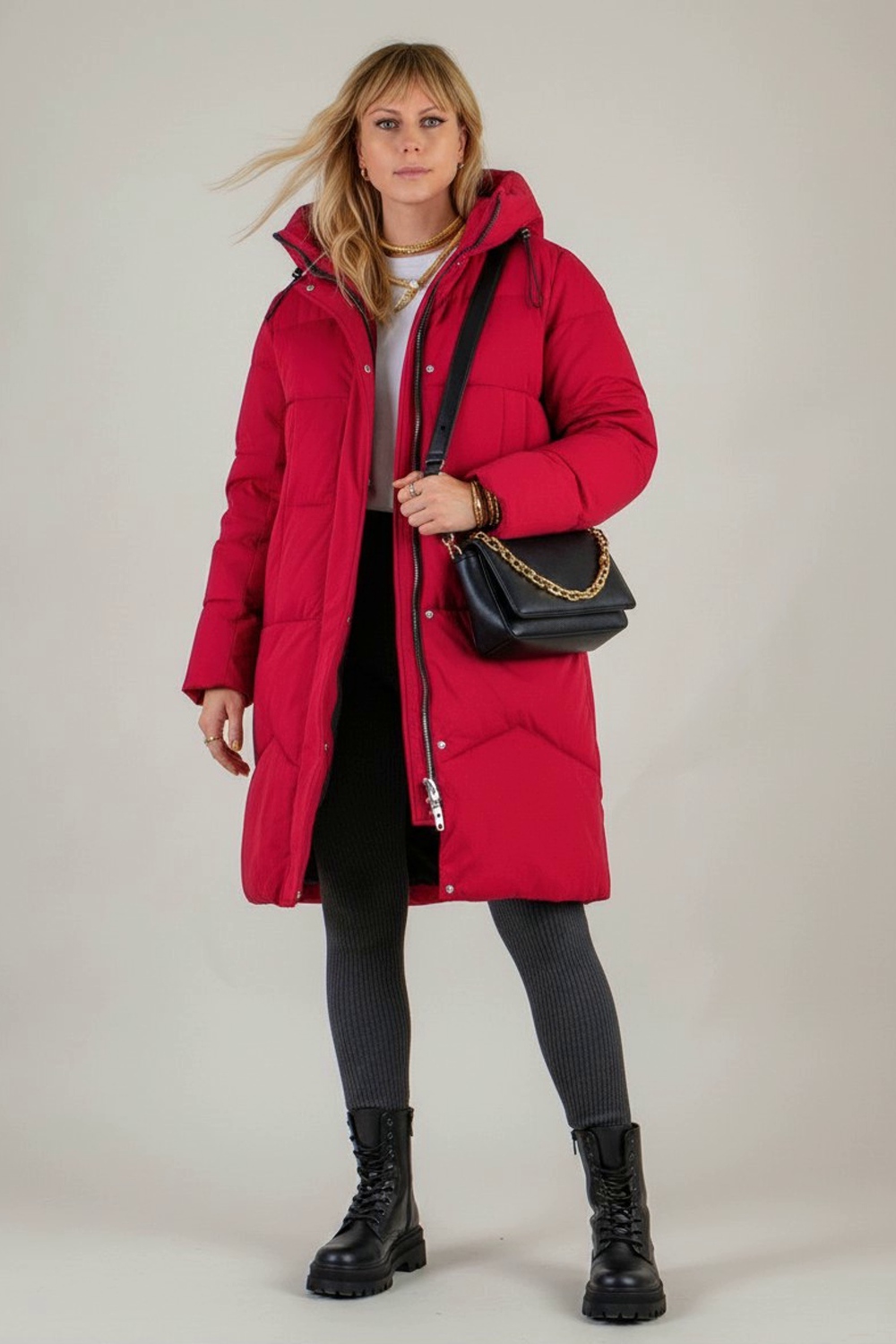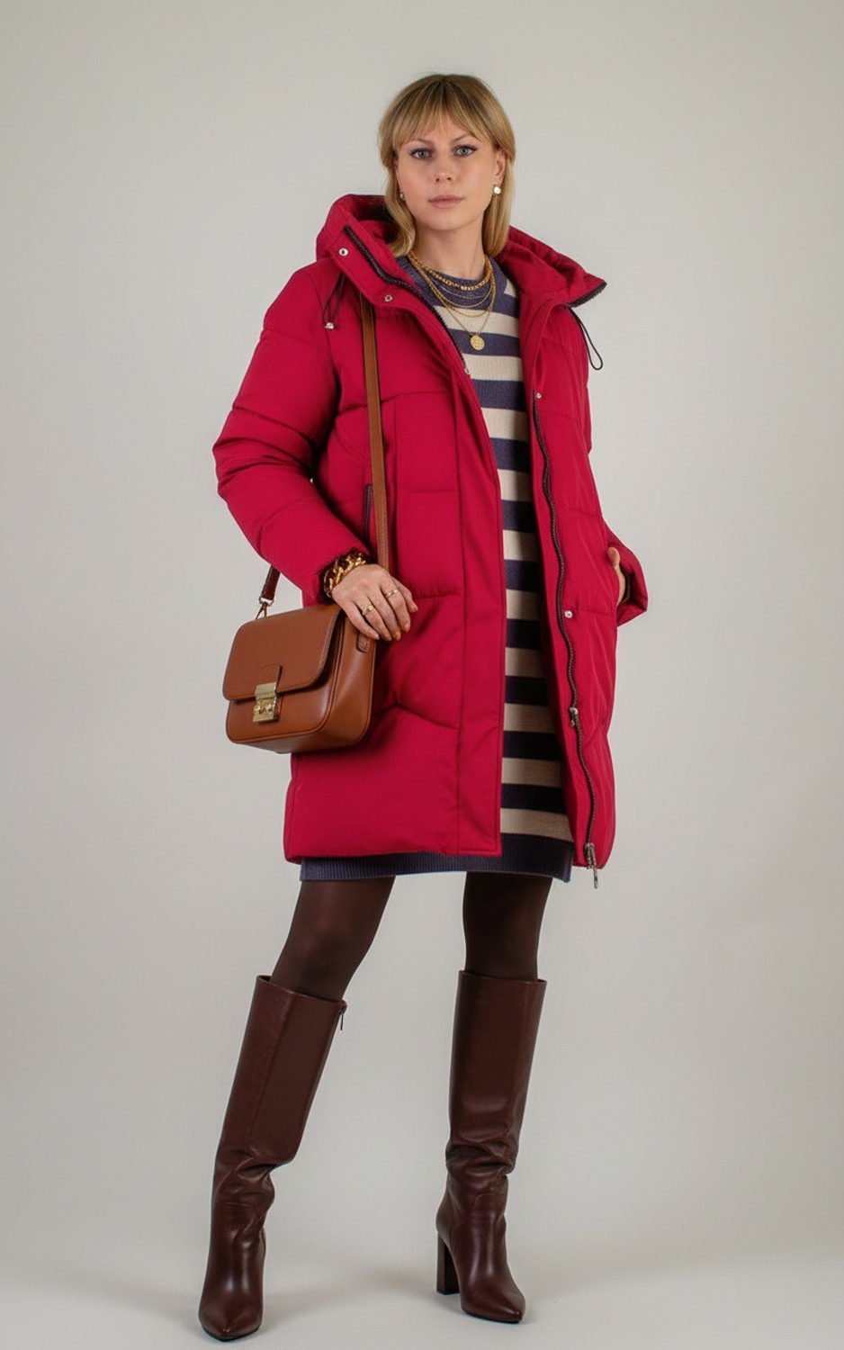 • Тёплый поясной ремень поверх куртки для подчёркивания талии.