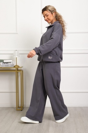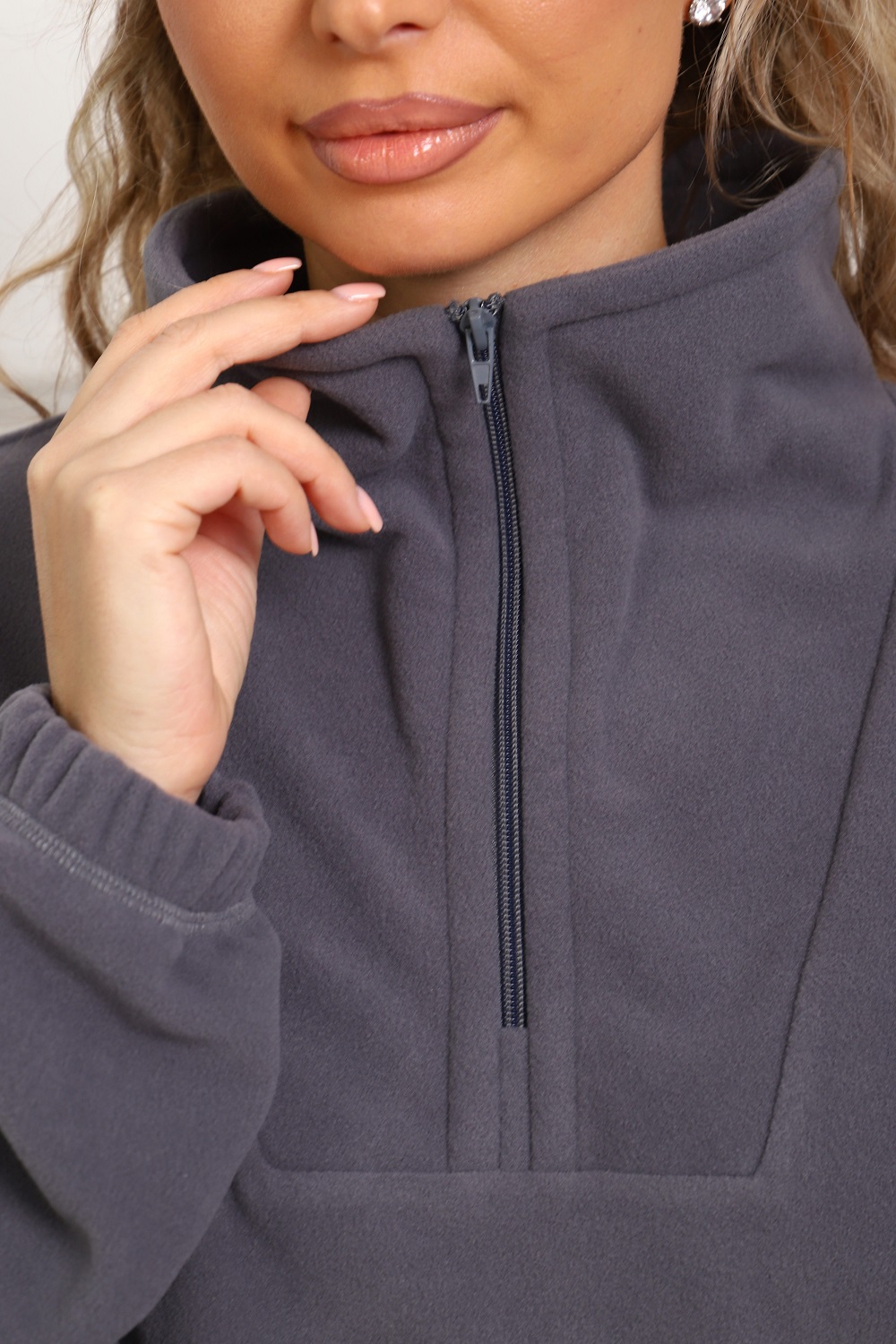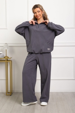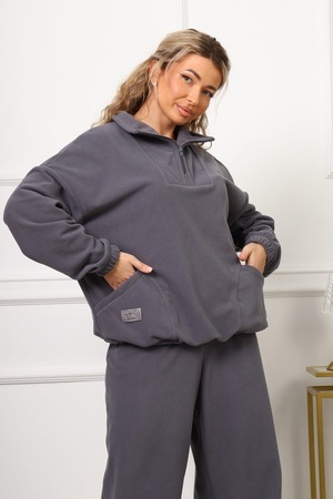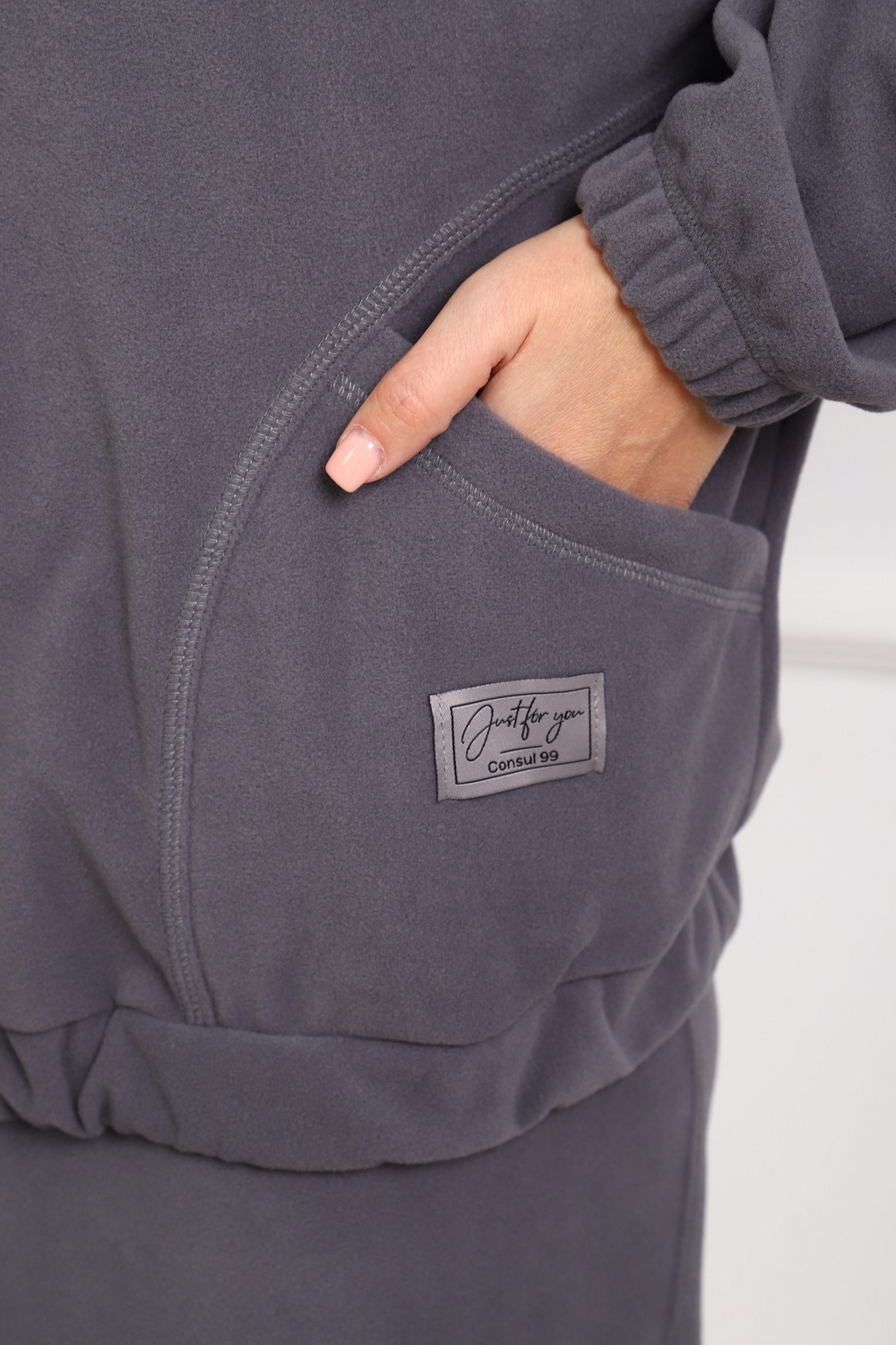 Костюм женский свободного силуэта: брюки широкие на эластичном поясе, с боковыми карманами; толстовка с воротником-стойкой на молнии, с оригинальными карманами, манжеты на резинке. Комфорт и тепло 100% флиса.