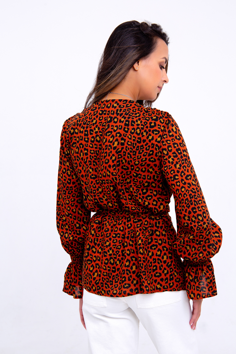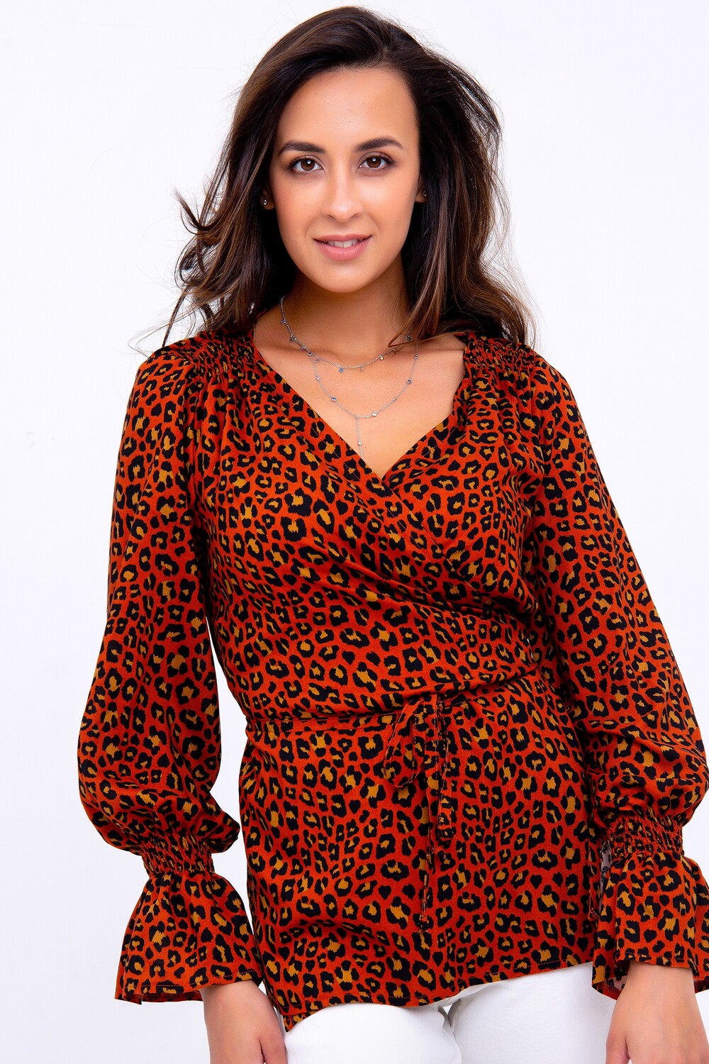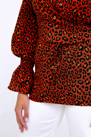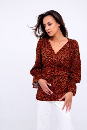 Пояс леопардовой блузки регулируется завязкой, которая позволяет подчеркнуть талию и создать акцент на своих преимуществах. Этот элемент декора придаст изюминку вашему образу и сделает его незабываемым.
