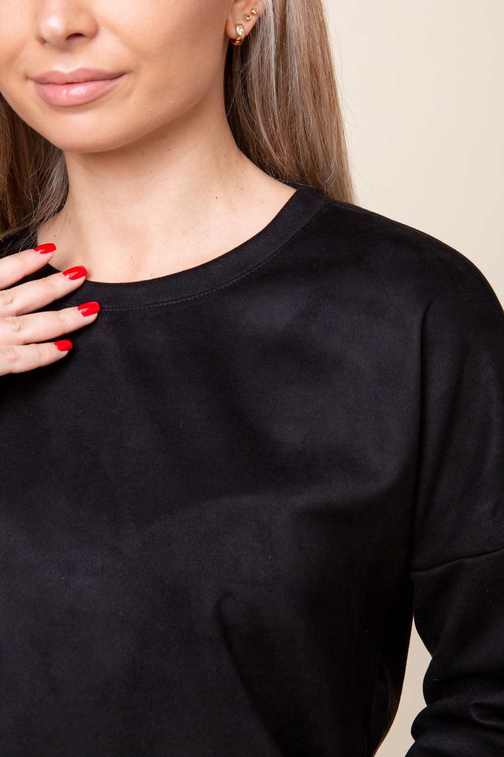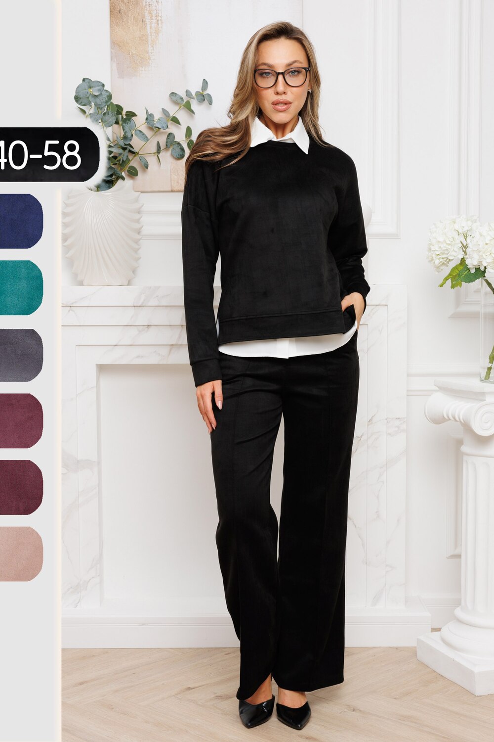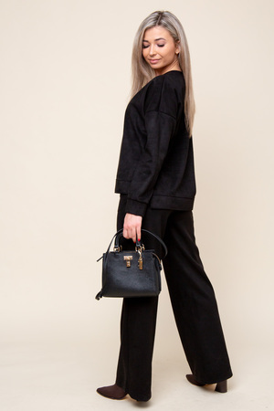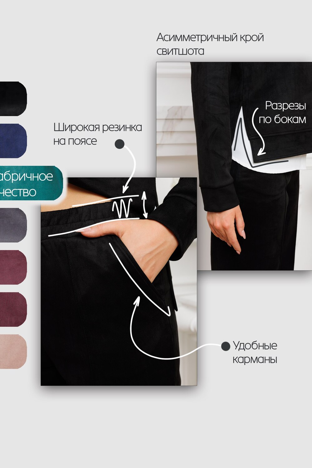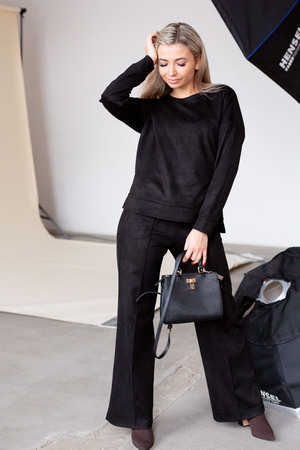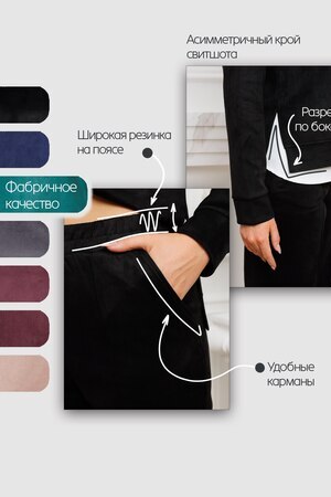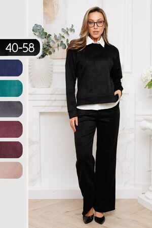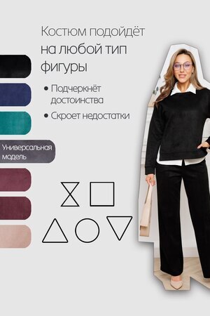 Женский брючный замшевый костюм от российского производителя бренда женской одежды. Невероятно мягкий, удобный теплый комплект из замшевого материала приятного к телу в составе лонгслива и свободных брюк палаццо. Свитшот с длинным рукавом, округлым вырезом горловины. Разрезы по боковым швам кофты и асимметричный крой верха с удлиненной спинкой. Прямые брюки с широкой резинкой на поясе, карманами с отрезным бочком и эффектными отстроченными стрелками по фасаду изделия стойнят силуэт. Необычное дизайнерское решение позволило совместить элегантную классику и эффектный стиль.