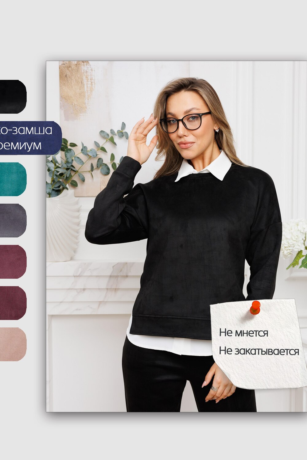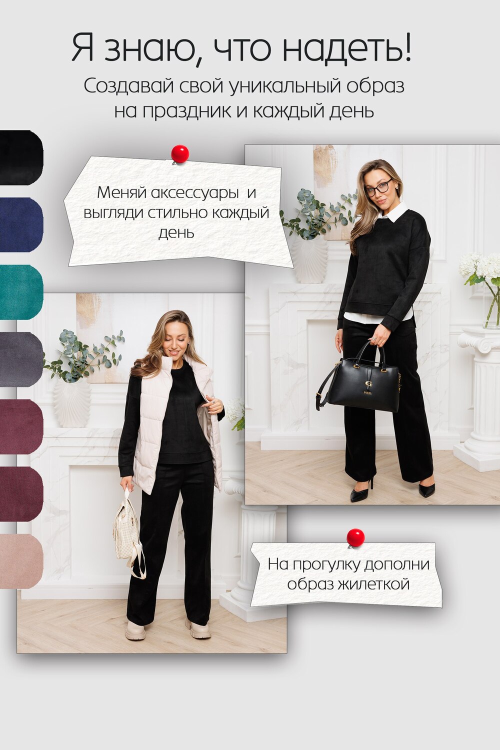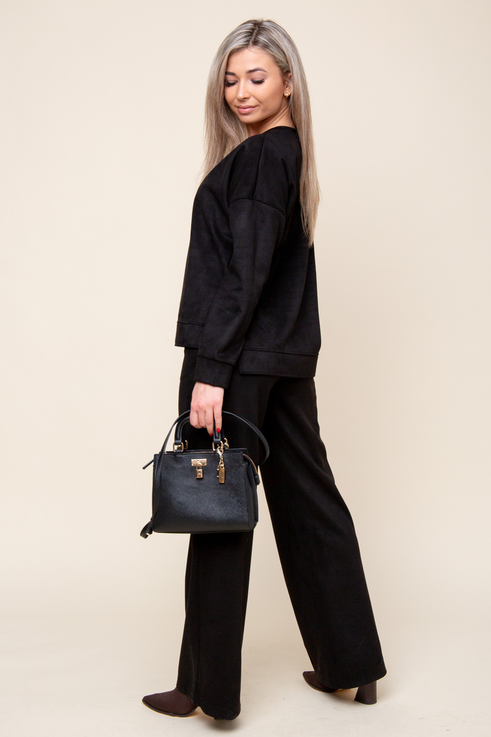 Женский брючный замшевый костюм от российского производителя бренда женской одежды. Невероятно мягкий, удобный теплый комплект из замшевого материала приятного к телу в составе лонгслива и свободных брюк палаццо. Свитшот с длинным рукавом, округлым вырезом горловины. Разрезы по боковым швам кофты и асимметричный крой верха с удлиненной спинкой. Прямые брюки с широкой резинкой на поясе, карманами с отрезным бочком и эффектными отстроченными стрелками по фасаду изделия стойнят силуэт. Необычное дизайнерское решение позволило совместить элегантную классику и эффектный стиль.