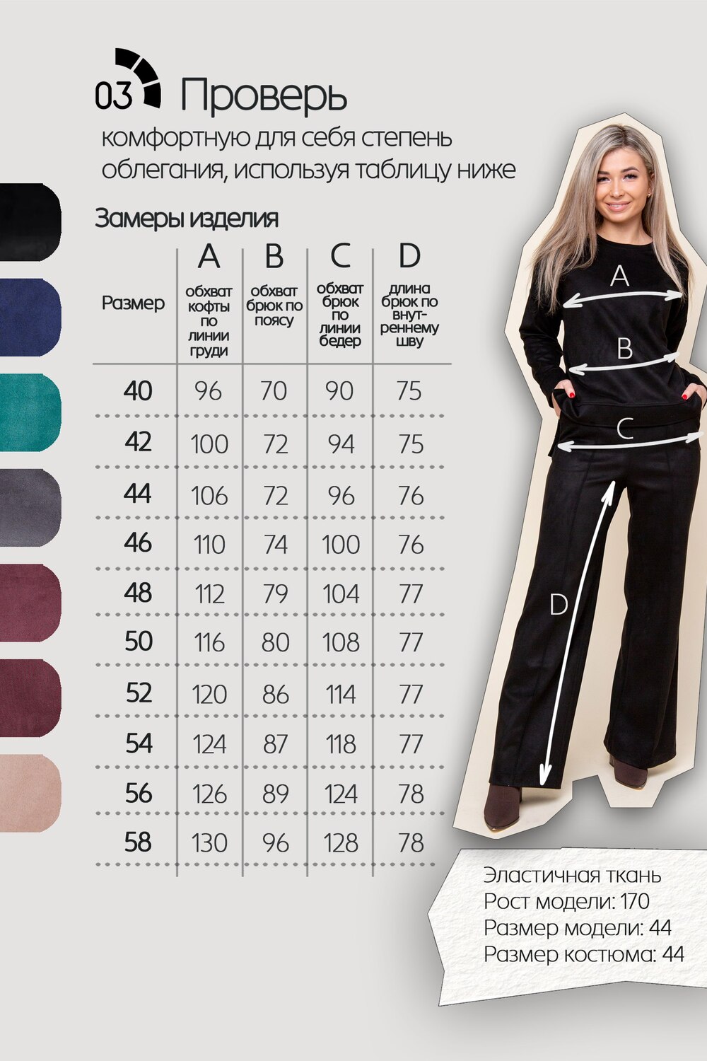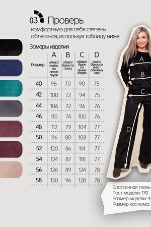 Каждый элемент костюма может носиться отдельно в сочетании с другими элементами гардероба, создавая модные образы. Трендовый костюм позволит подчеркнуть стройность Вашей фигуры. Модель доступна в больших размерах плюс сайз - 50, 52 и 54, будет шикарно смотреться в любом возрасте, подойдет для полных девушек и беременных женщин. Перед использованием рекомендуется предварительная стирка отдельно от других вещей.