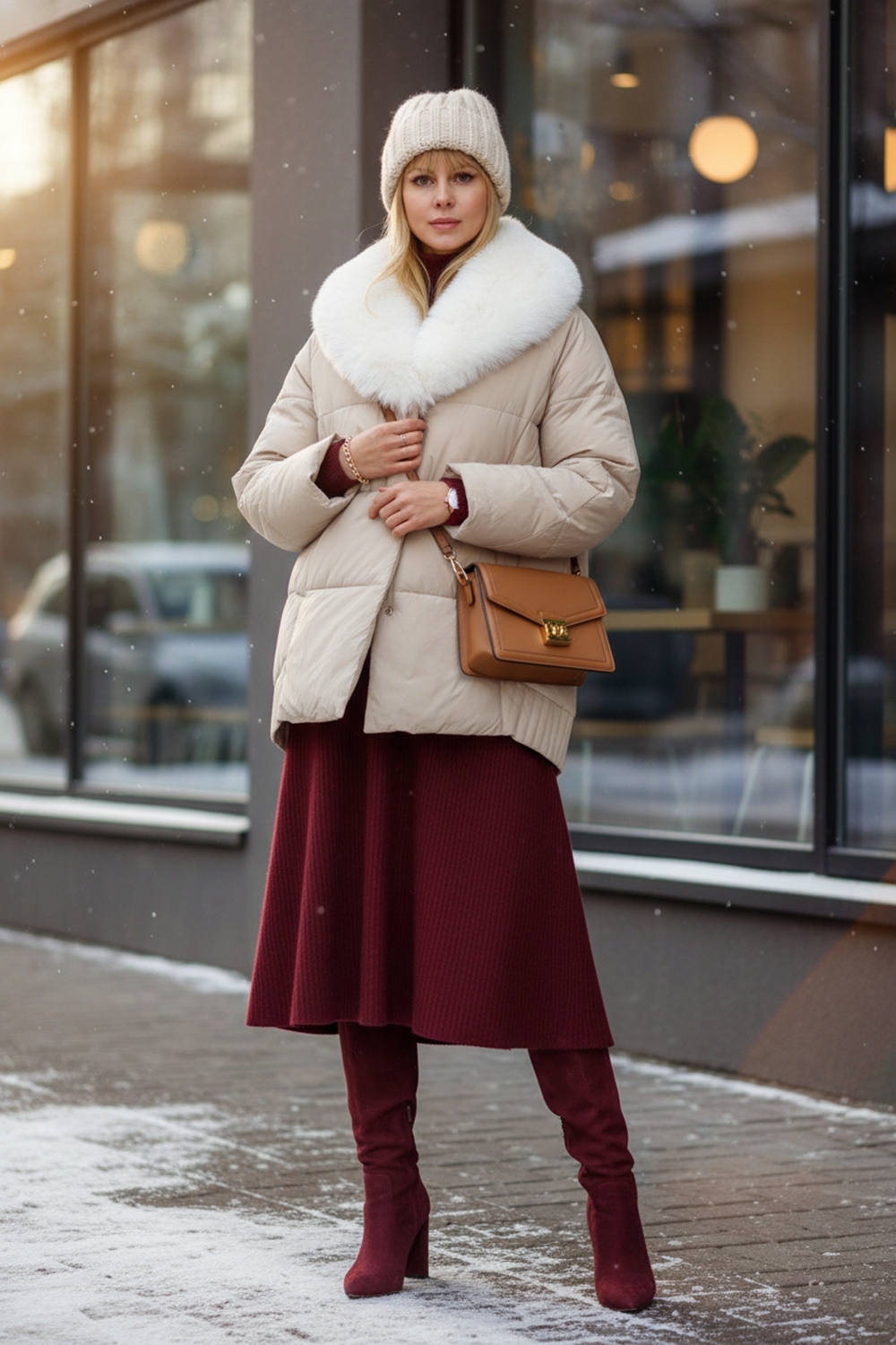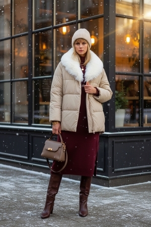 Ключевая деталь – съёмный воротник из качественного искусственного меха белого контрастного цвета. Он придаёт образу нотку элегантности и роскоши. Воротник легко снимается, позволяя видоизменять образ под настроение. Застёжка-молния дополняется скрытой утеплённой планкой на кнопках, что препятствует проникновению холода внутрь. Внутренняя отделка оснащена файбер-наполнителем: продуманная простёжка исключает сминание и скопление утеплителя в отдельных зонах, обеспечивая равномерное тепло по всему объёму куртки.
