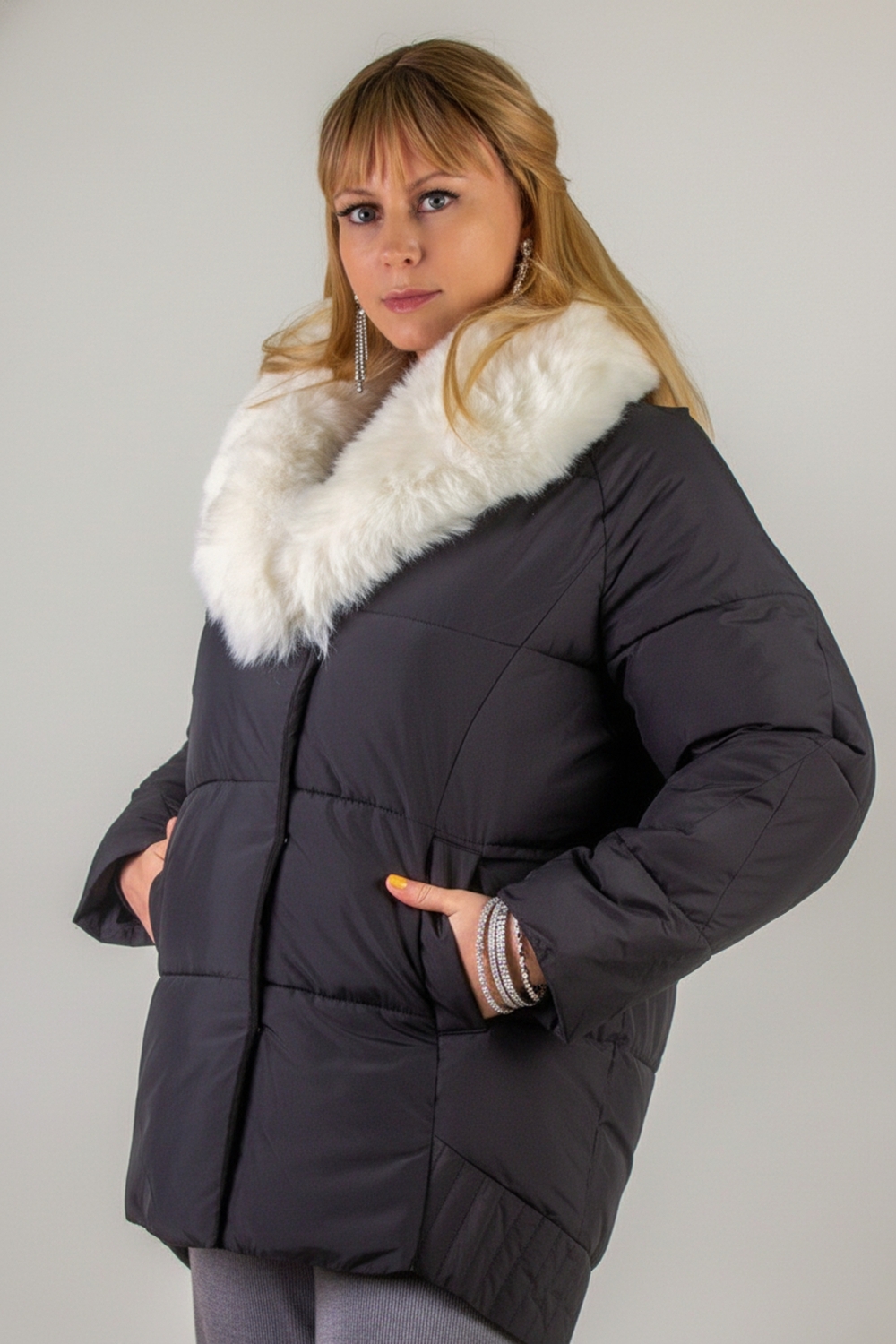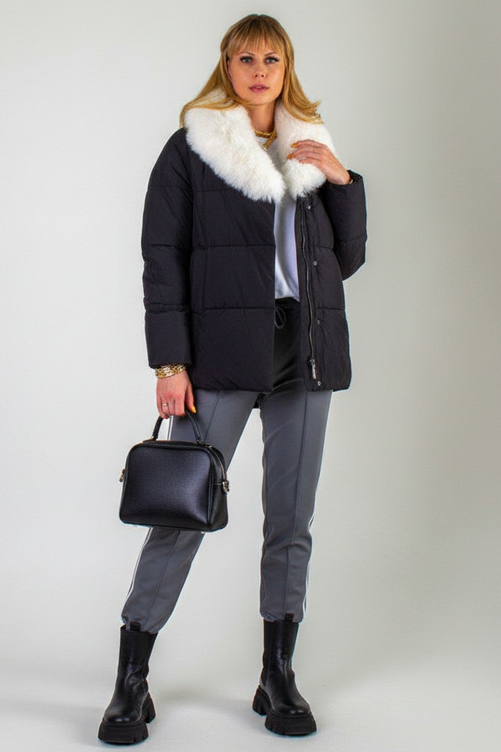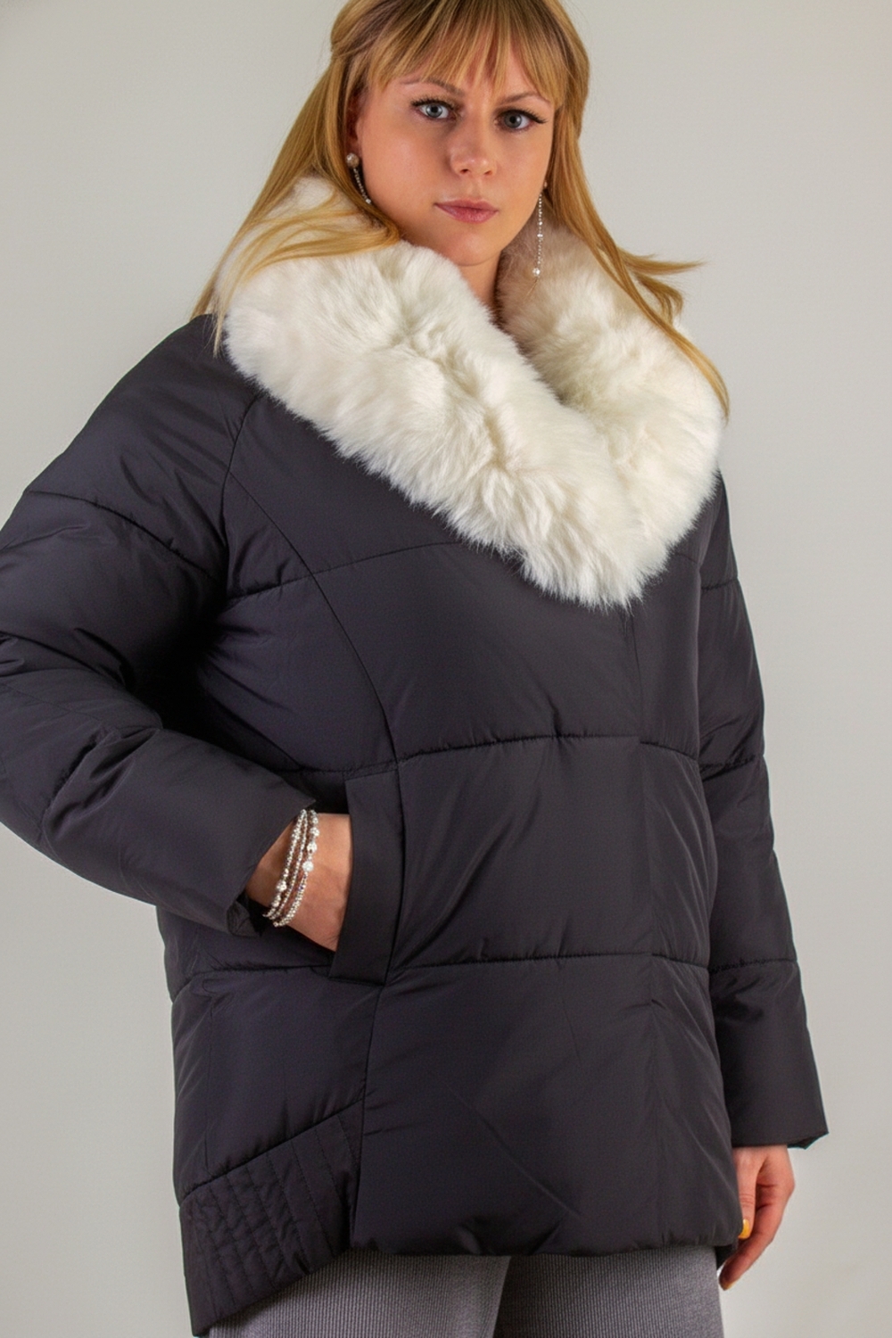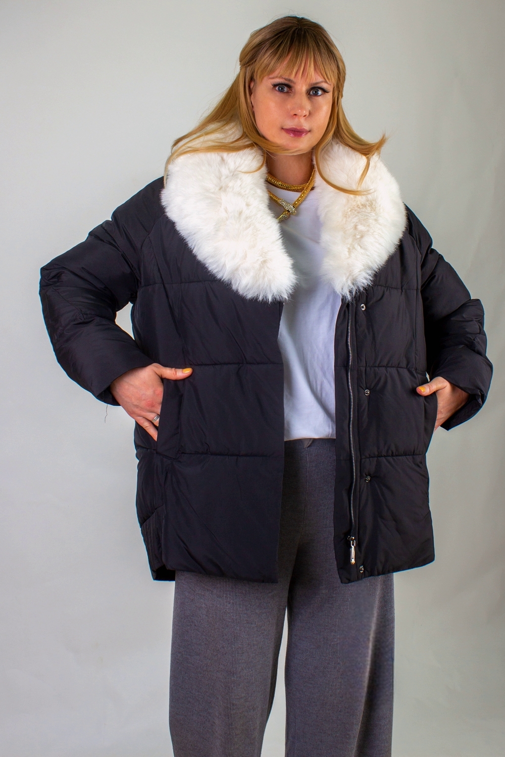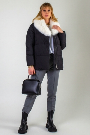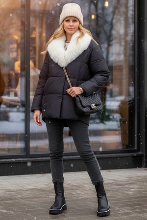 Ключевая деталь – съёмный воротник из качественного искусственного меха белого контрастного цвета. Он придаёт образу нотку элегантности и роскоши. Воротник легко снимается, позволяя видоизменять образ под настроение. Застёжка-молния дополняется скрытой утеплённой планкой на кнопках, что препятствует проникновению холода внутрь. Внутренняя отделка оснащена файбер-наполнителем: продуманная простёжка исключает сминание и скопление утеплителя в отдельных зонах, обеспечивая равномерное тепло по всему объёму куртки.