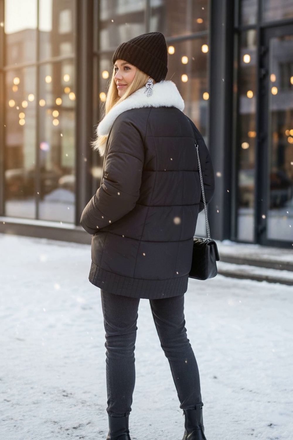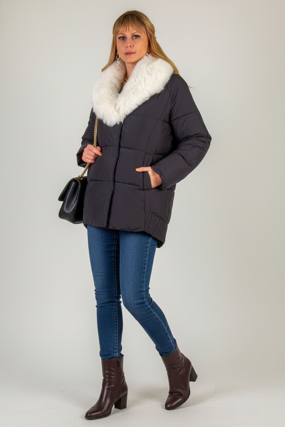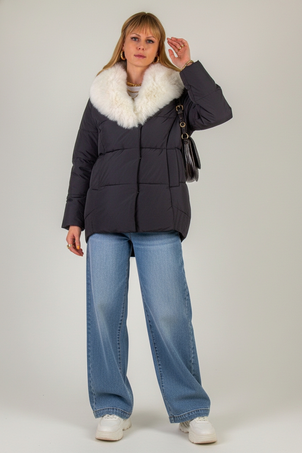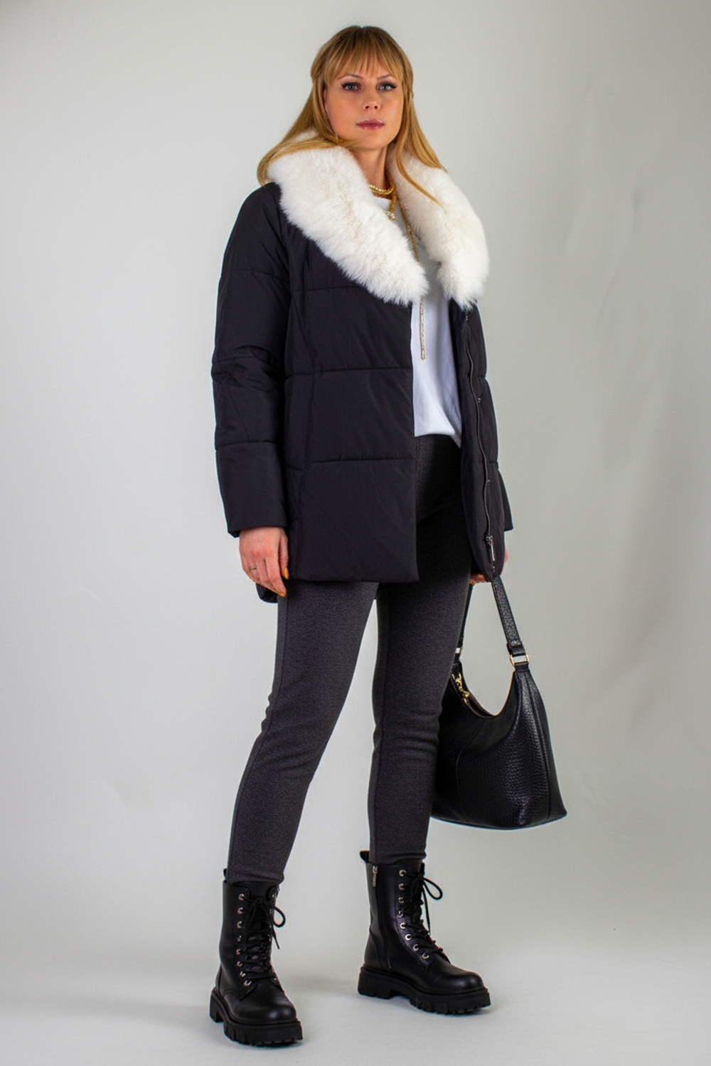Ключевая деталь – съёмный воротник из качественного искусственного меха белого контрастного цвета. Он придаёт образу нотку элегантности и роскоши. Воротник легко снимается, позволяя видоизменять образ под настроение. Застёжка-молния дополняется скрытой утеплённой планкой на кнопках, что препятствует проникновению холода внутрь. Внутренняя отделка оснащена файбер-наполнителем: продуманная простёжка исключает сминание и скопление утеплителя в отдельных зонах, обеспечивая равномерное тепло по всему объёму куртки.