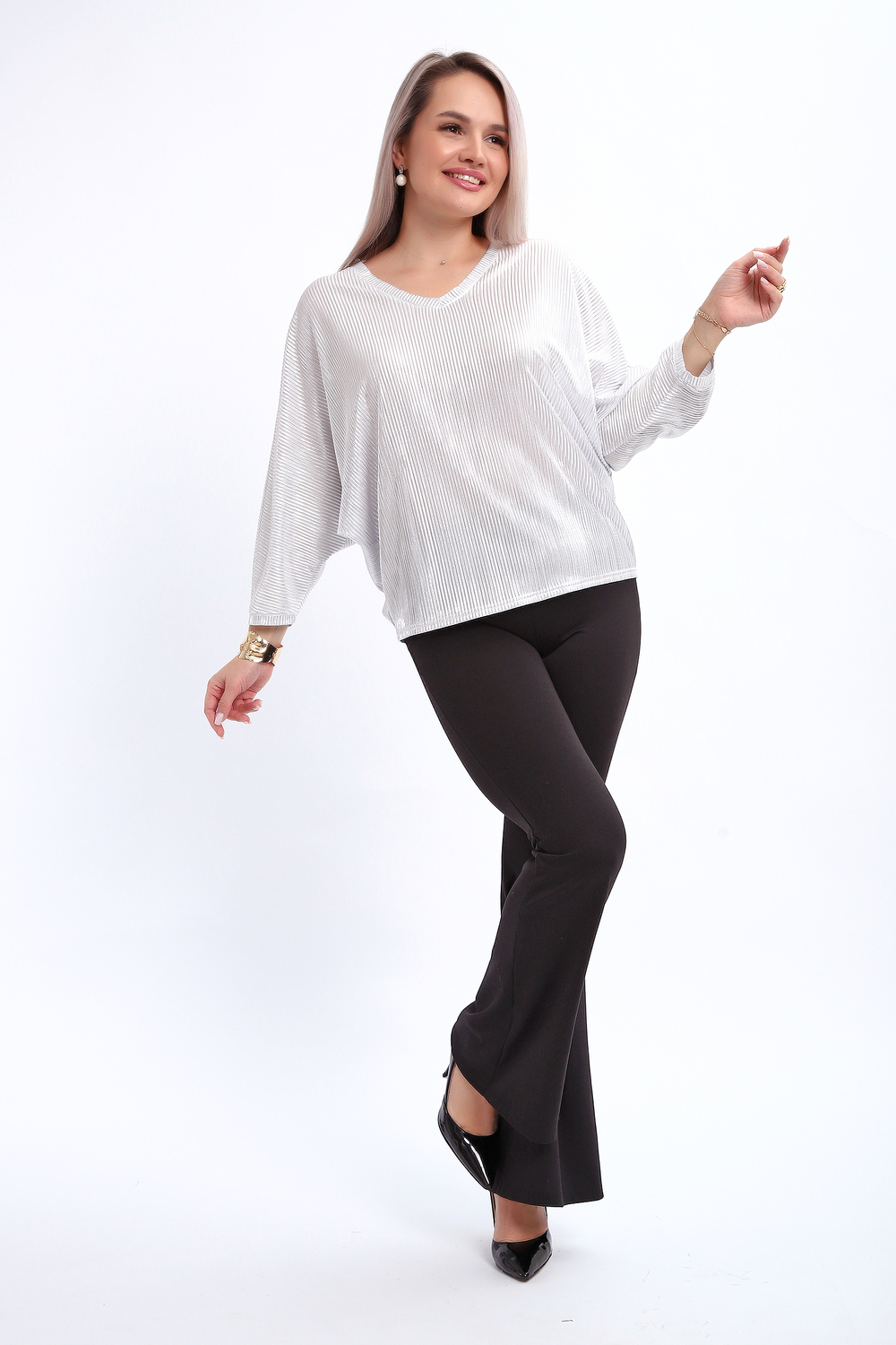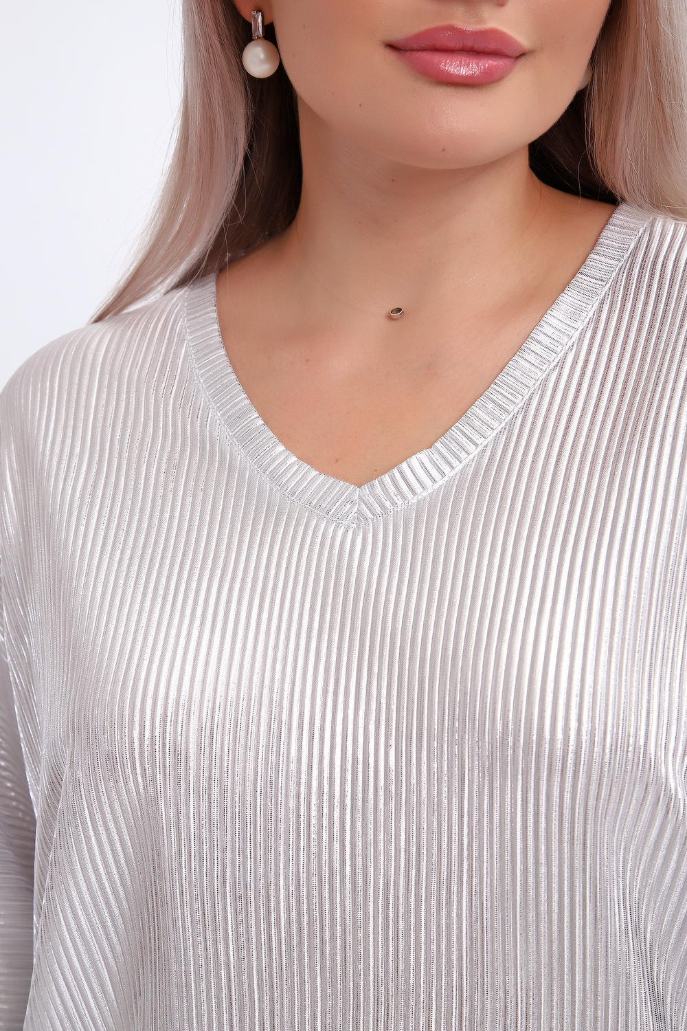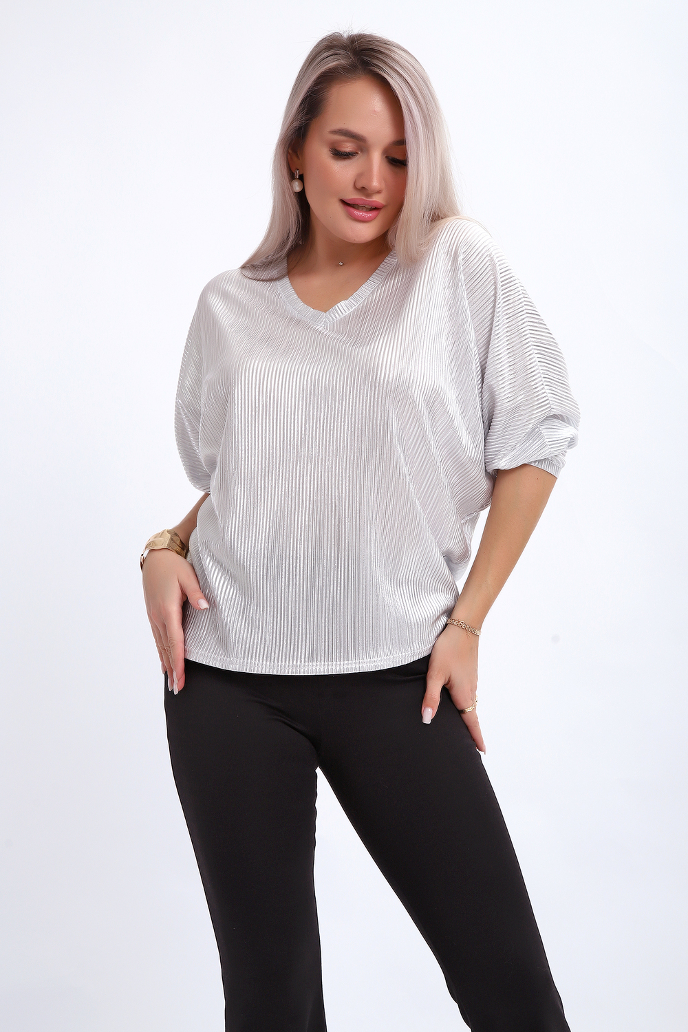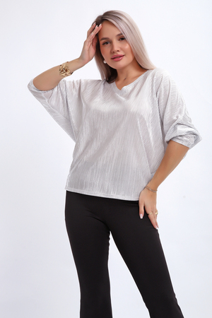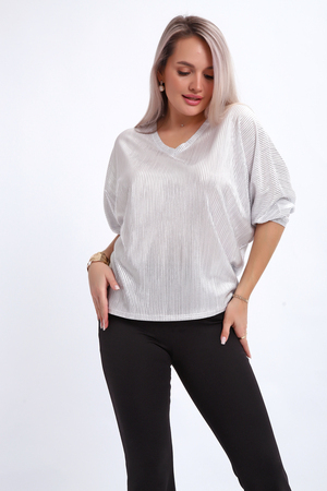Сделайте акцент на вашем стиле с помощью комфортной и изысканной блузки. Нарядная кофта - это необходимый предмет в любом гардеробе. Благодаря свободному крою, она идеально садится на любую фигуру, скрывая то, что хотелось бы спрятать и подчеркивая достоинства. Блузка выигрышно смотрится за счет ткани атлас гофре со стойким напылением фойл, которое не осыпается в процессе носки и после стирки. Ткань атлас гофре хорошо тянется и драпируется, имеет мягкий благородный блеск и совершенно не мнется. Крой блузки лаконичен, без лишних деталей, рукав "летучая мышь" не сковывает движений, имеет длину 3/4 и оканчивается небольшим манжетом. V-образный воротник зрительно удлиняет шею, обработан обтачкой,  длина блузки до линии бедра. Легкая изящная блузка отлично впишется в вечерний наряд, а также будет блестящим дополнением к деловому и повседневному образу.