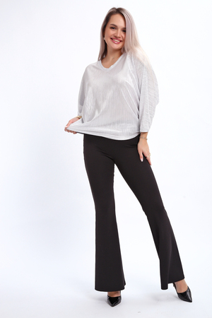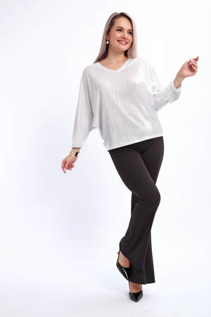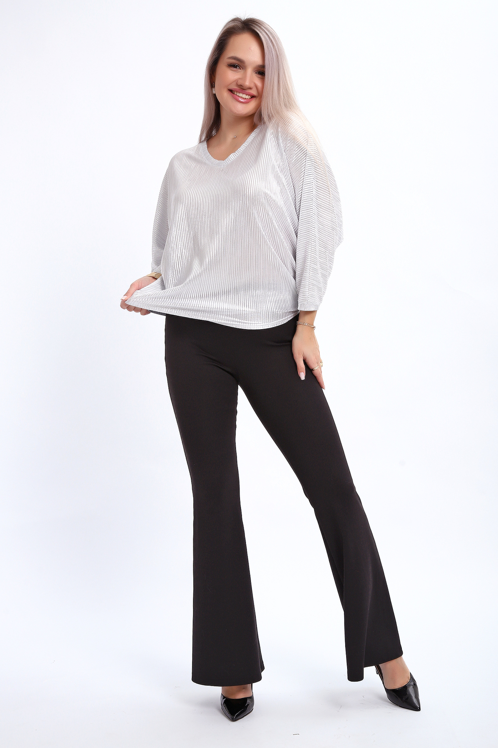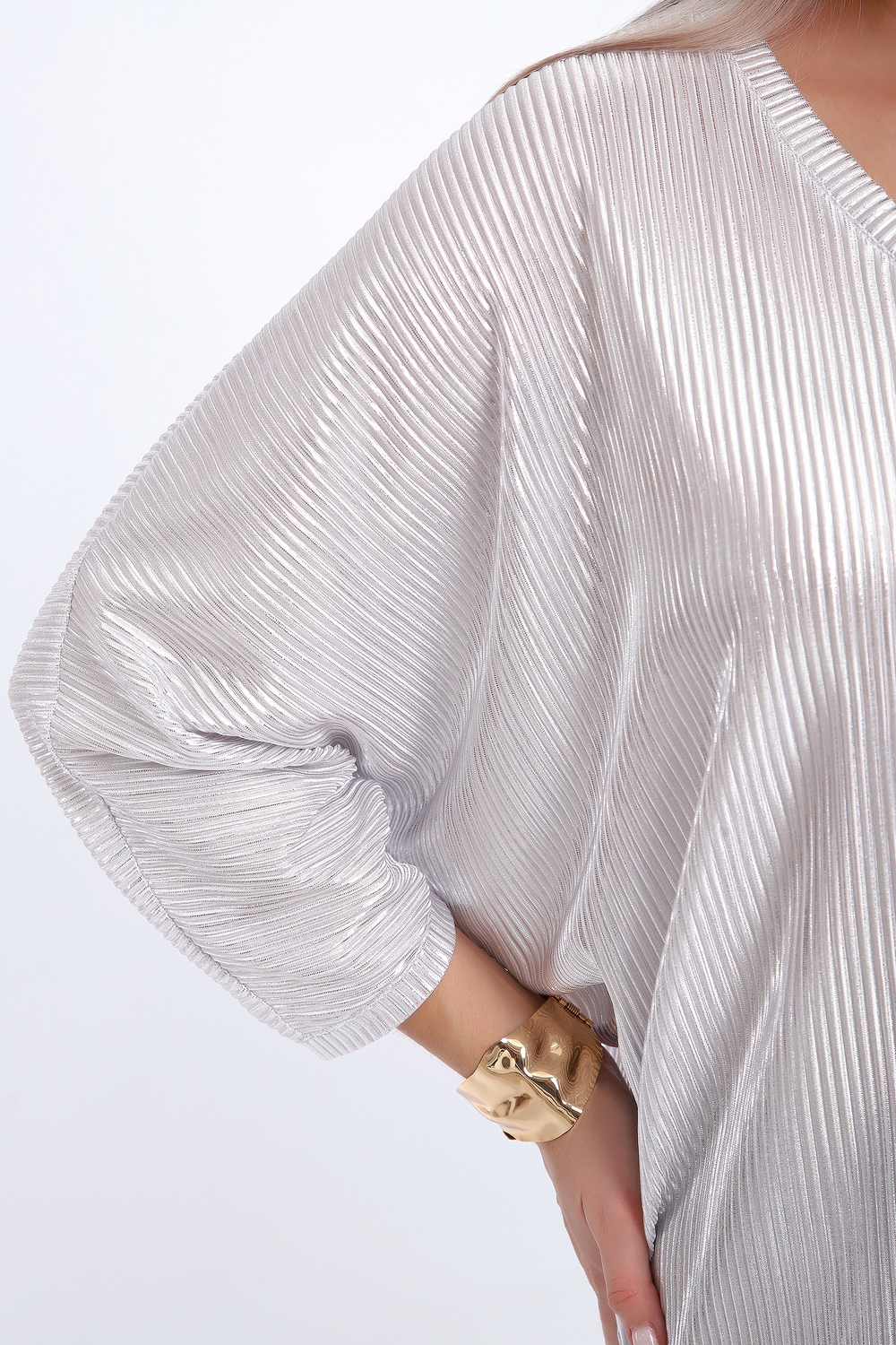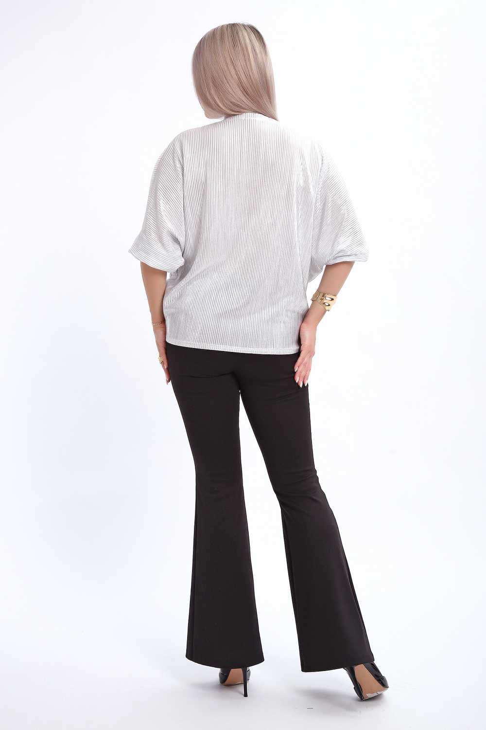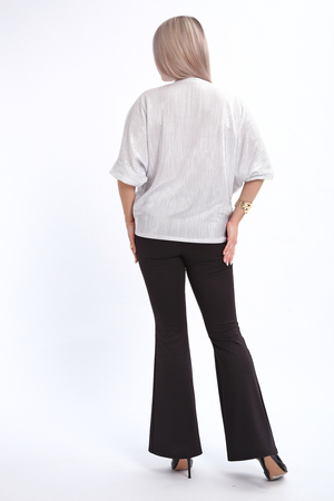 Сделайте акцент на вашем стиле с помощью комфортной и изысканной блузки. Нарядная кофта - это необходимый предмет в любом гардеробе. Благодаря свободному крою, она идеально садится на любую фигуру, скрывая то, что хотелось бы спрятать и подчеркивая достоинства. Блузка выигрышно смотрится за счет ткани атлас гофре со стойким напылением фойл, которое не осыпается в процессе носки и после стирки. Ткань атлас гофре хорошо тянется и драпируется, имеет мягкий благородный блеск и совершенно не мнется. Крой блузки лаконичен, без лишних деталей, рукав "летучая мышь" не сковывает движений, имеет длину 3/4 и оканчивается небольшим манжетом. V-образный воротник зрительно удлиняет шею, обработан обтачкой,  длина блузки до линии бедра. Легкая изящная блузка отлично впишется в вечерний наряд, а также будет блестящим дополнением к деловому и повседневному образу.