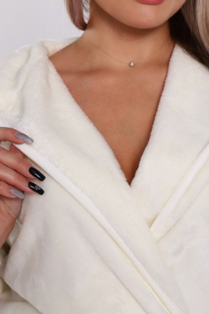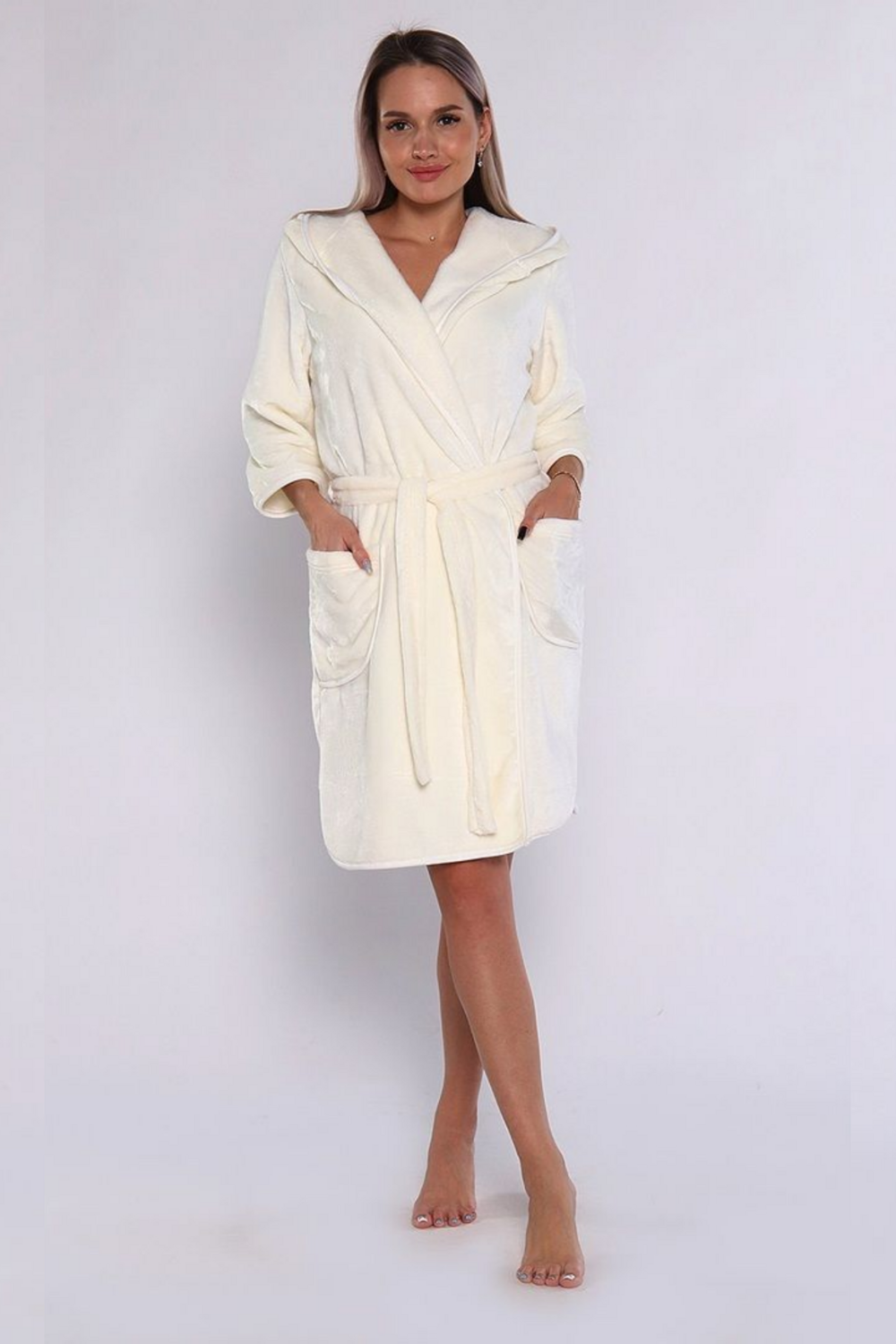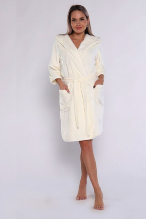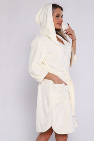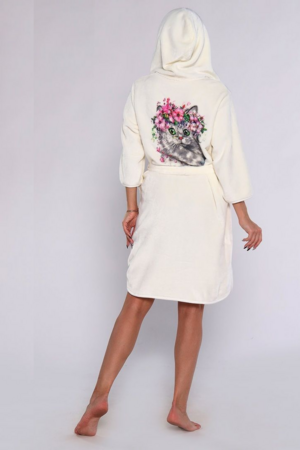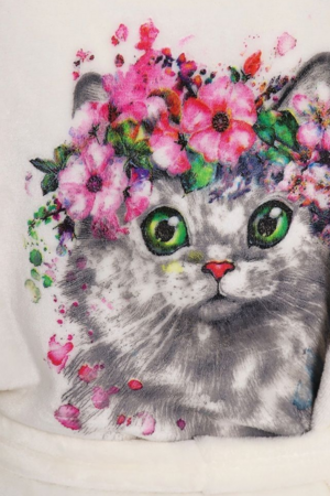 Теплый халат запашной с капюшоном, имеет два кармана и принт "Котенок" на спине.