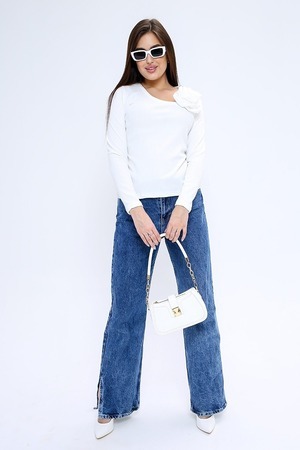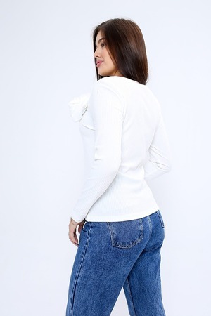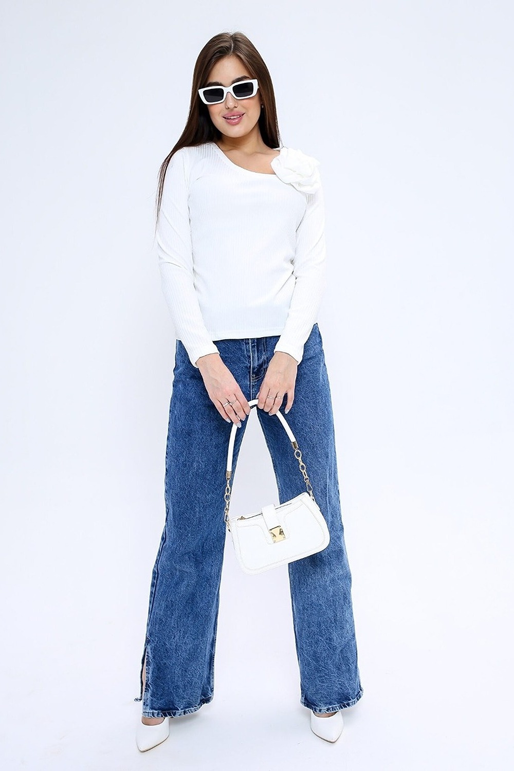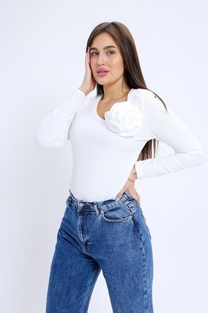 Модель лонгслива, украшенная эффектной объемной аппликацией в виде цветка. Этот предмет гардероба станет настоящим украшением вашего образа и привлечет восхищенные взгляды!