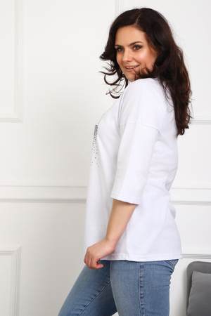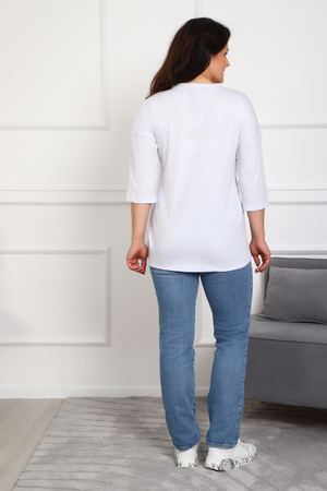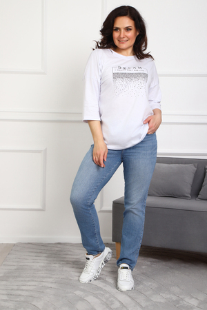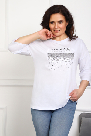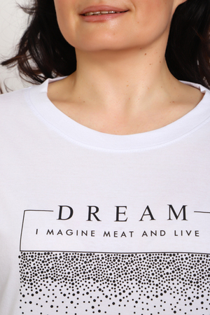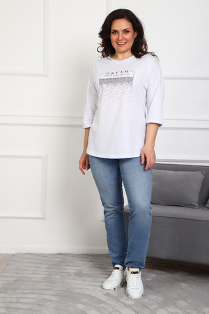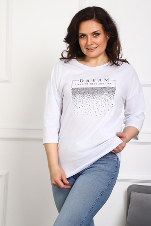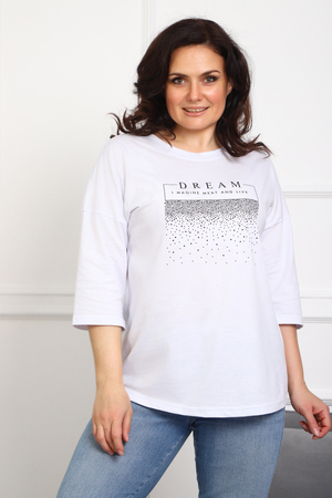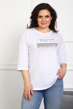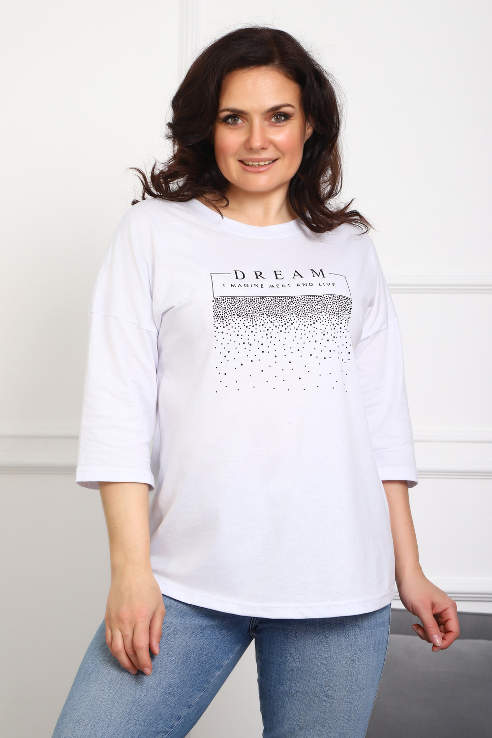 (туника женская дрим) Женская туника из мягкой и приятной к телу кулирки, выполненная из натурального хлопка (100%). Эта модель идеально подчеркнет вашу фигуру благодаря элегантному приталенному силуэту и слегка приспущенной линии плеча. Рукава длиной 3/4 делают образ комфортным и универсальным, а круглый вырез горловины добавляет легкости и нежности общему виду. Особенное внимание привлекает стильный принт на груди, украшенный изящной надписью, создающими романтичное настроение. Свободная посадка обеспечивает комфорт и свободу движений, делая этот предмет гардероба идеальным выбором для повседневных образов и отдыха.