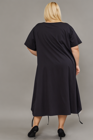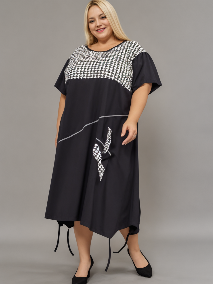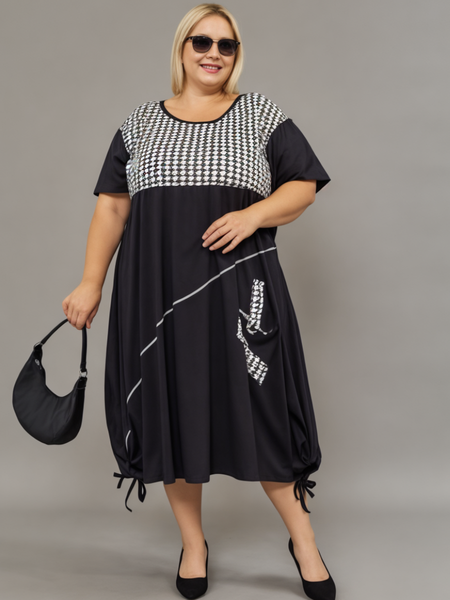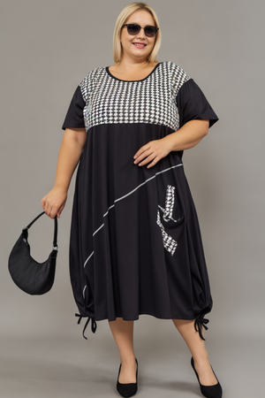 Представляем вам уютное домашнее платье больших размеров созданное для комфорта и стиля в каждый день. Это хлопковое платье свободного кроя с расклешенной юбкой миди идеально подойдет для женщин plus size, обеспечивая свободу движений и ощущение легкости. Черный цвет с классическим рисунком "гусиная лапка" придает ему элегантный вид, а округлый вырез горловины и рукава 3/4 добавляют женственности. Наличие накладных карманов - практичный бонус для хранения мелочей. Свободный покрой и мягкий ивановский трикотаж из 100% хлопка подарят вам максимальный комфорт в течение дня. Это платье станет незаменимым спутником для отдыха дома, создавая атмосферу уюта и расслабленности.