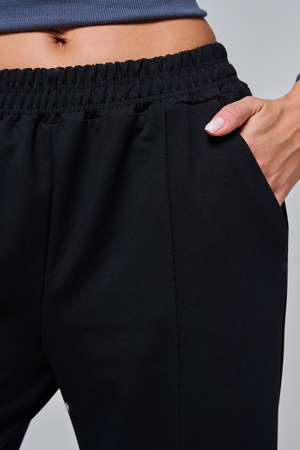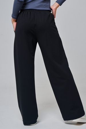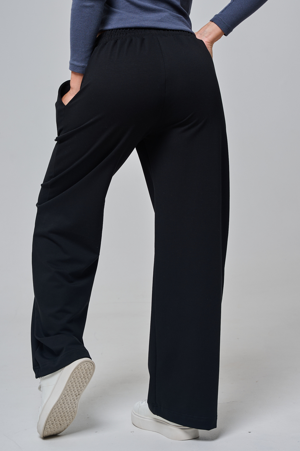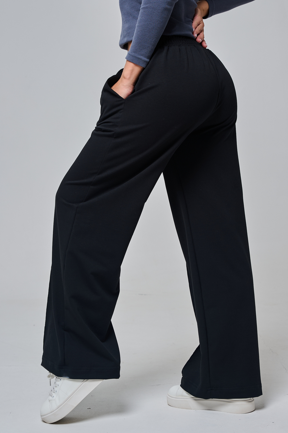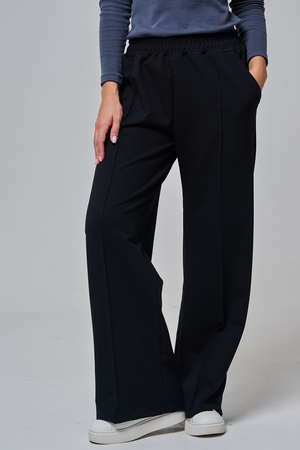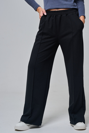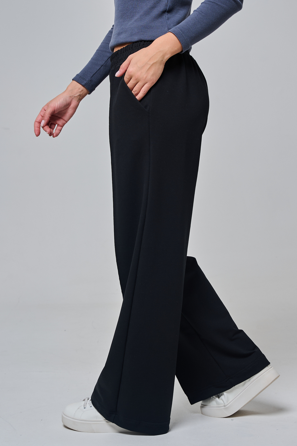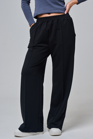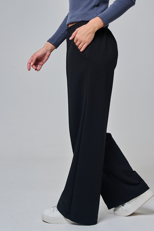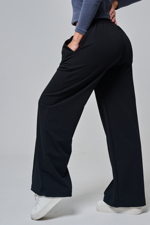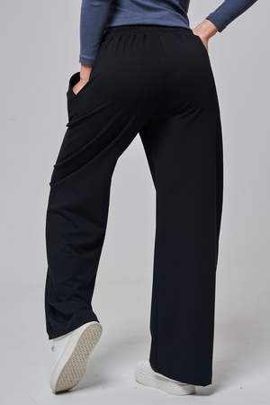 Дизайн подчеркивает женственность: высокая посадка с удобным эластичным поясом на шнуровке позволяет легко регулировать посадку, а объемные, струящиеся штанины от бедра до щиколотки создают эффектный силуэт, визуально удлиняющий ноги. Практичные боковые карманы добавляют функциональности, не нарушая минималистичный вид.