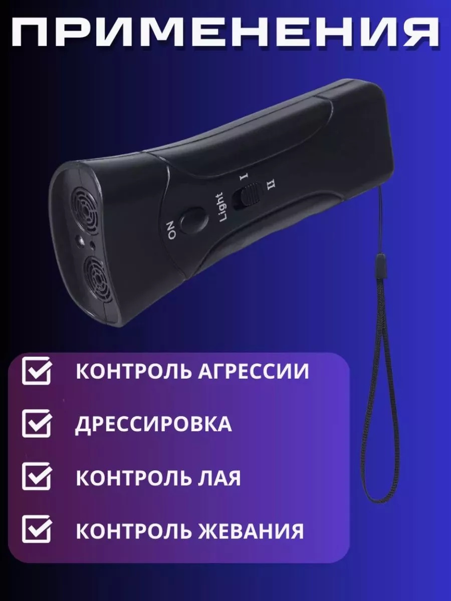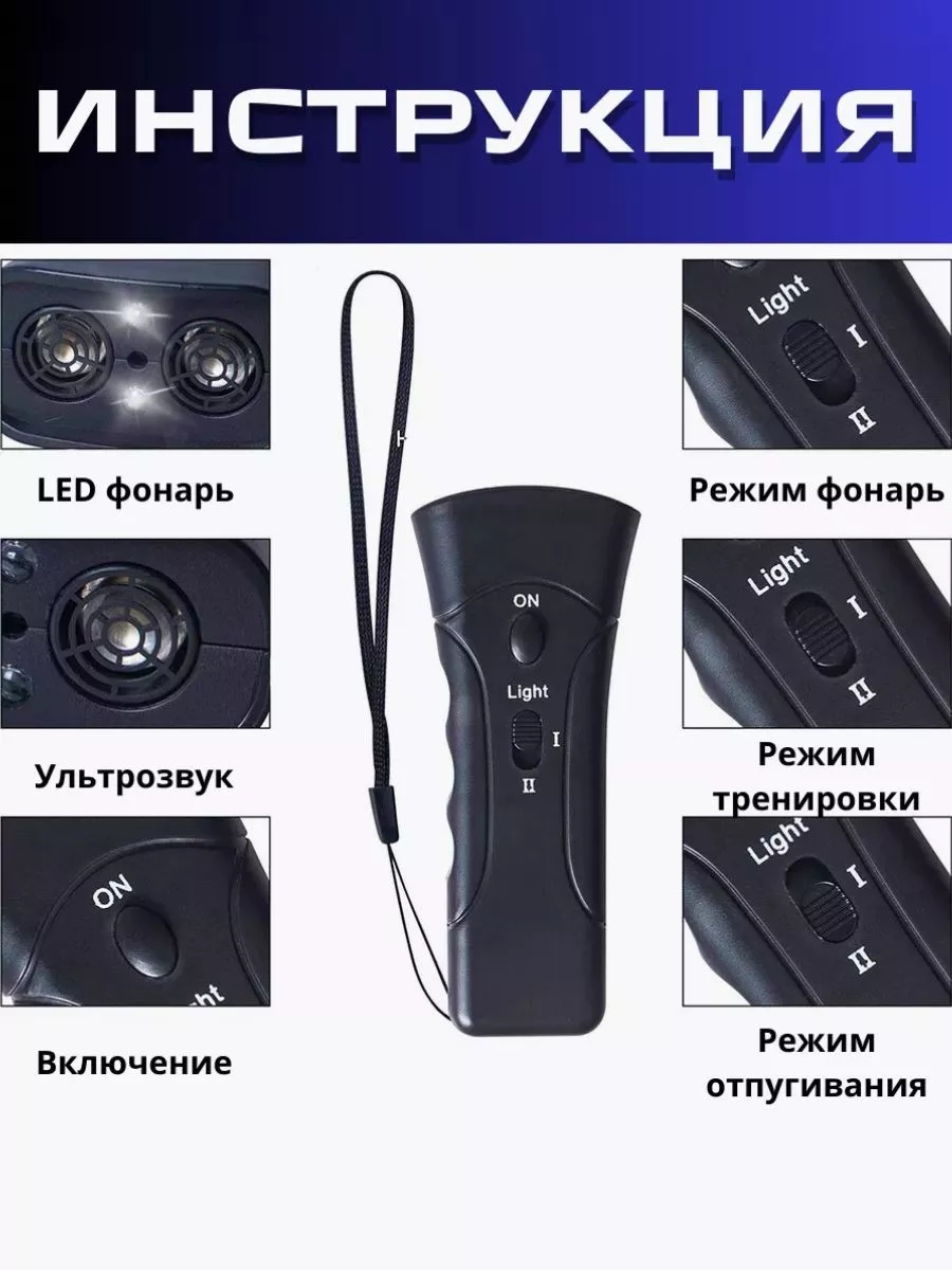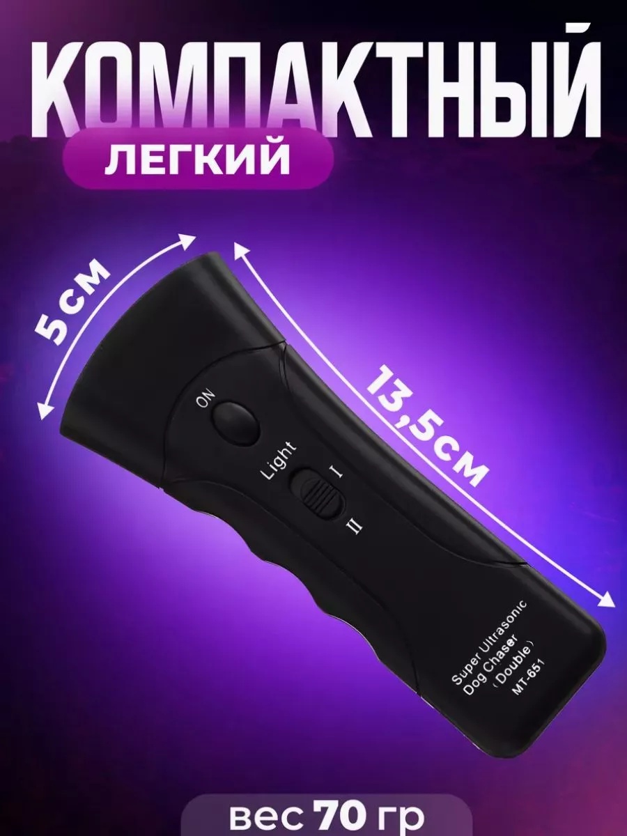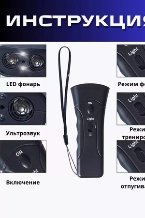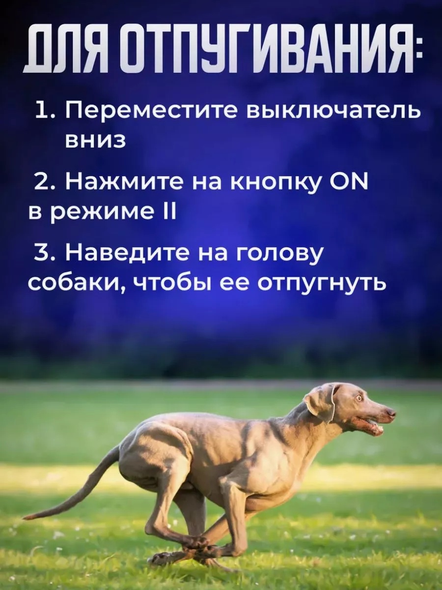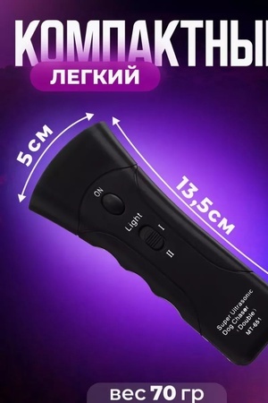 Ультразвуковой мощный отпугиватель собак предназначен для отпугивания и тренировки. Средство защиты от собак работает в двух режимах: дрессировка и отпугивание. Эффект будет максимальным на расстоянии до 10 метров при нацеливании в голову. Отпугиватель собак ультразвуковой одинаково эффективен для дрессировки мелких, средних и крупных пород собак. Средство самообороны пригодится пешеходам, бегунам, велосипедистам, почтальонам, заводчикам, подойдет для детей и взрослых. Ультразвуковой отпугиватель собак безвреден для животных и безопасен для людей. Луч лазера поможет вам направить воздействие в сторону головы собаки, а яркие диоды стробоскопа усилят эффект отпугивателя. Ультразвук вызывает дискомфорт и тревогу, поможет остановить лай и подавляет агрессию, благодаря чему животные будут держаться на расстоянии от вас или убегут. Отпугиватель собак для ребенка так же можно использовать как антилай или LED фонарик. Батарейка в комплект входит. Отпугиватель собак ультразвуковой карманный нельзя использовать как шокер или электрошокер..