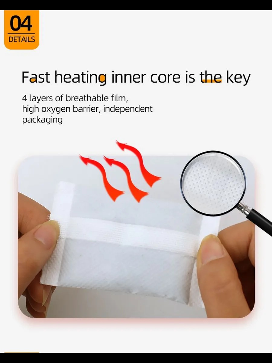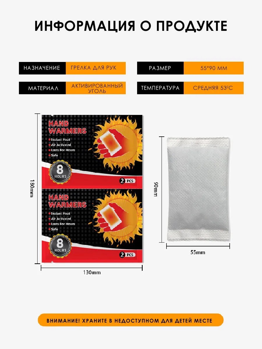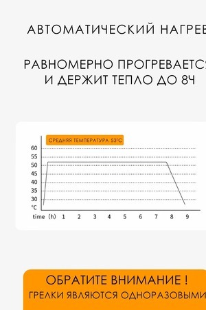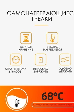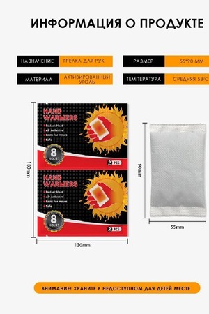 Забудьте о неприятном холоде и дискомфорте! Представляем вам идеальное решение для зимних прогулок и работы на свежем воздухе — одноразовые грелки для рук и тела. Саморазогревающаяся грелка в зимние дни обеспечит вам тепло и комфорт в любых условиях. Она компактна и удобно помещается в кармане, что делает её незаменимым аксессуаром для путешествий и активного отдыха. Самонагревающаяся грелка для рук и тела представляет собой -пакетик, которое используется для согревания конечностей или определенных участков тела. Грелка содержит внутри себя натуральные ингредиенты, такие как уголь, соль или другие химические соединения, которые активируются при контакте с воздухом и начинают выделять тепло. Самонагревающиеся грелки обычно используются для обогрева в холодное время года, для уменьшения болевого синдрома, расслабления и разогрева мышц, а также для улучшения кровообращения, так же может применяться как грелка для новорожденных от коликов. Сфера применения грелки очень разнообразна, и она точно не подведет вас в любых жизненных ситуациях. Грелка имеет клейкий слой, с помощью которого можно закрепить грелку на внутренней стороне куртки, закрепить на варежках и обогреться на природе, так же можно положить в коляску. Подарите себе и своим близким комфорт и тепло с нашей грелкой! Закажите сейчас и наслаждайтесь уютом и теплом в любой непогоде!