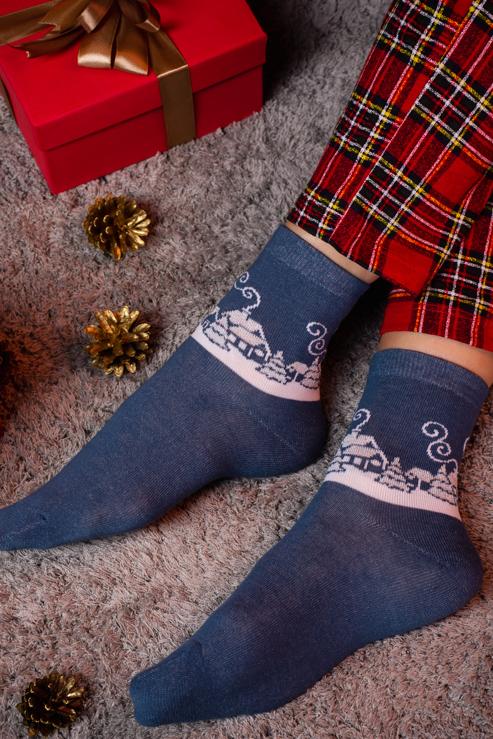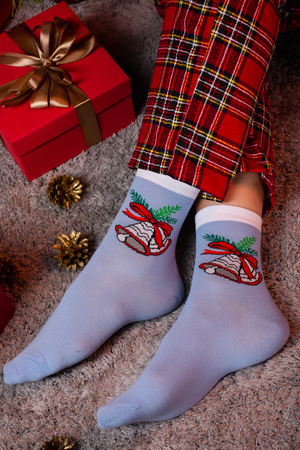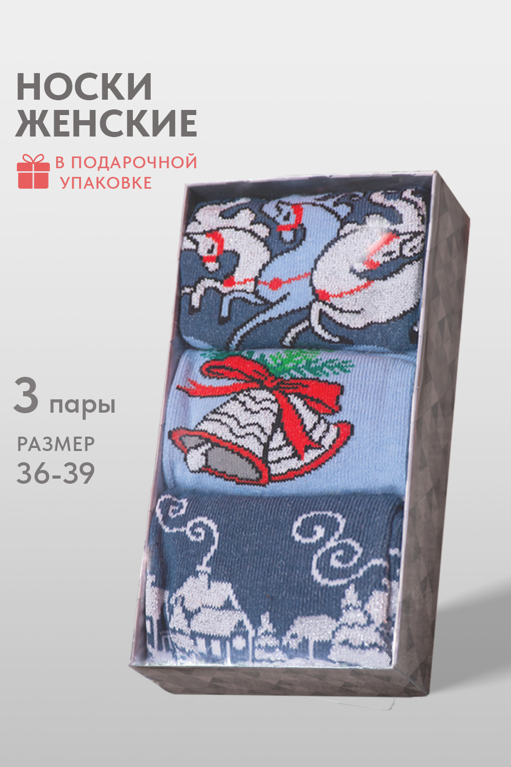 Новогодний подарочный набор женских носков с изображением тройки лошадей, зимнего пейзажа и новогодних колокольчиков. В комплекте 3 пары в красивой картонной упаковке