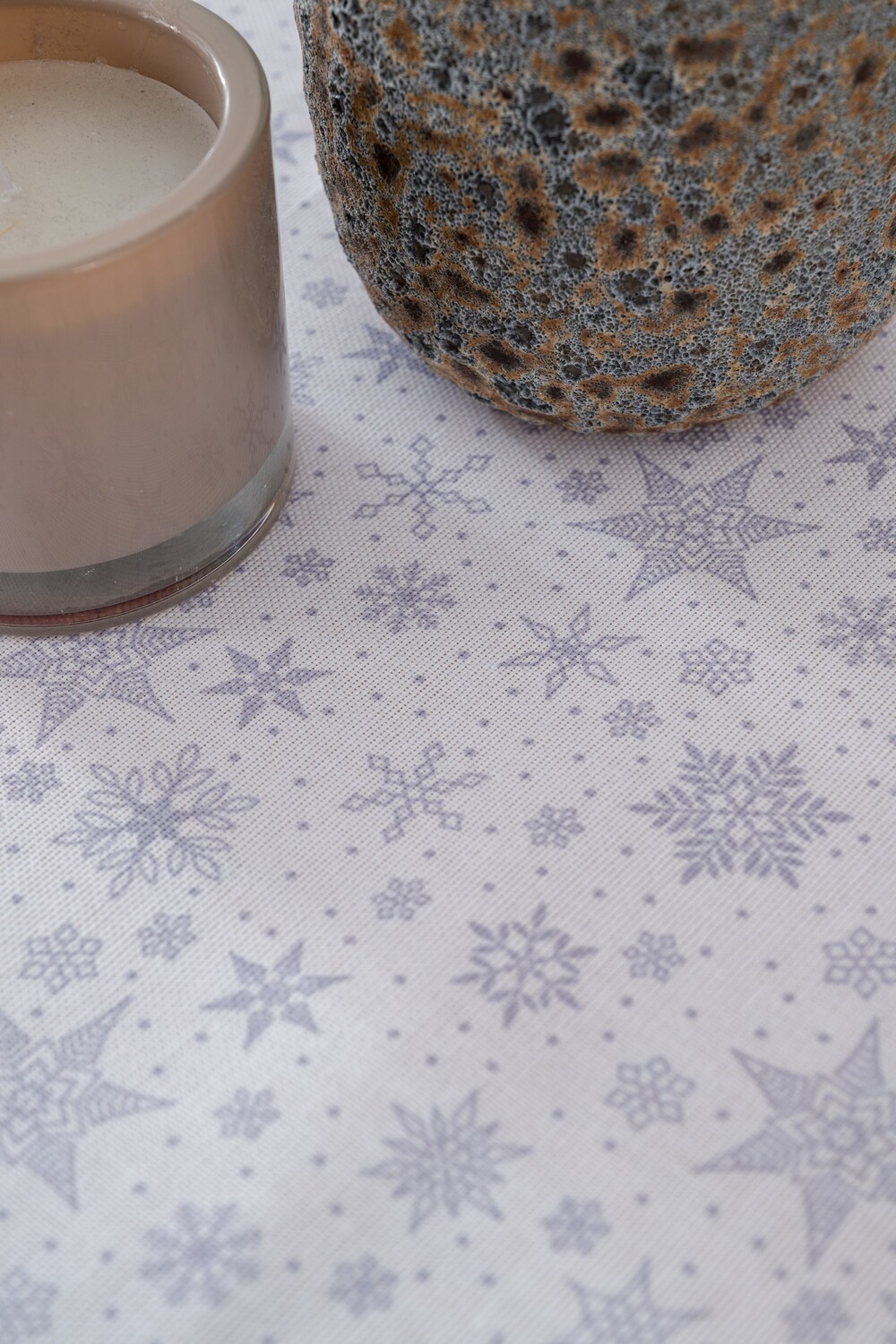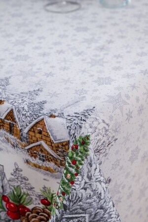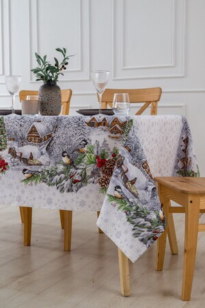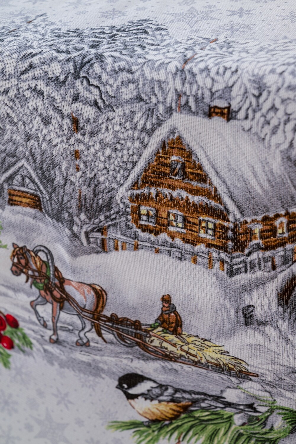 Изысканный дизайн: Белоснежная основа скатерти украшена деликатными серыми снежинками, создающими ощущение легкого морозного узора. В центре композиции – очаровательные изображения лошадок, несущихся по заснеженным полям, и сцены веселых зимних забав. Этот узор пробуждает самые теплые воспоминания о детстве и дарит ощущение праздника.