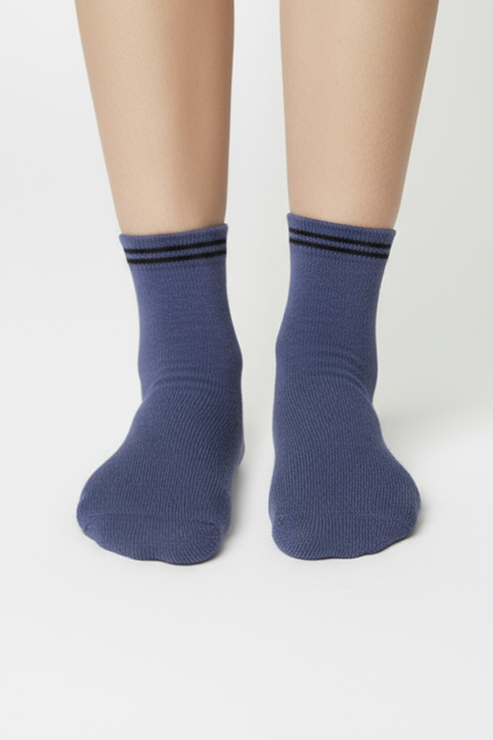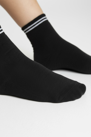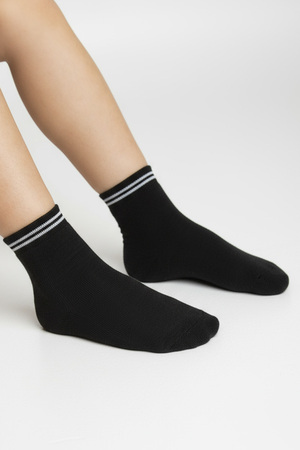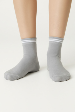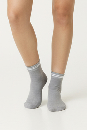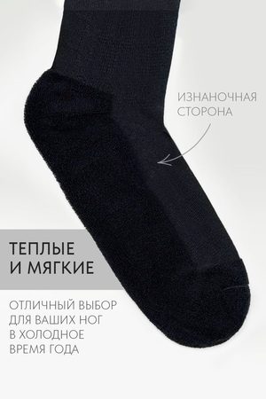 Набор спортивных подростковых носков. В комплекте 3 пары: черный, индиго и серый. Сверху вывязаны полоски, длина средняя. С изнаночной стороны плюшевые по длине стопы. В продаже имеются аналогичные мужские носки Сезон.