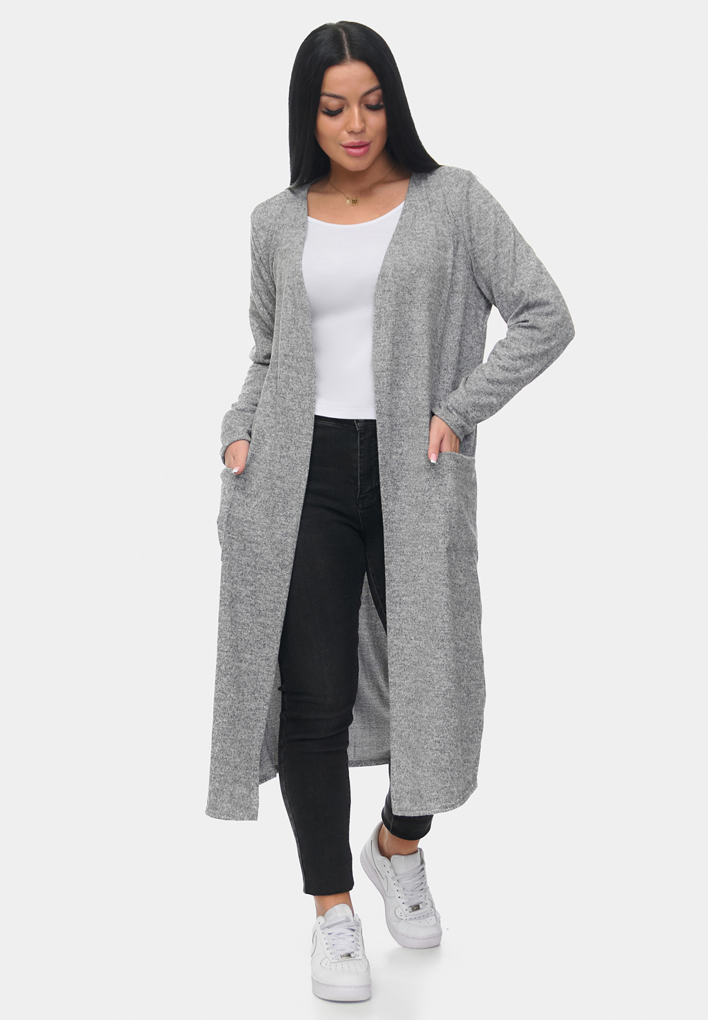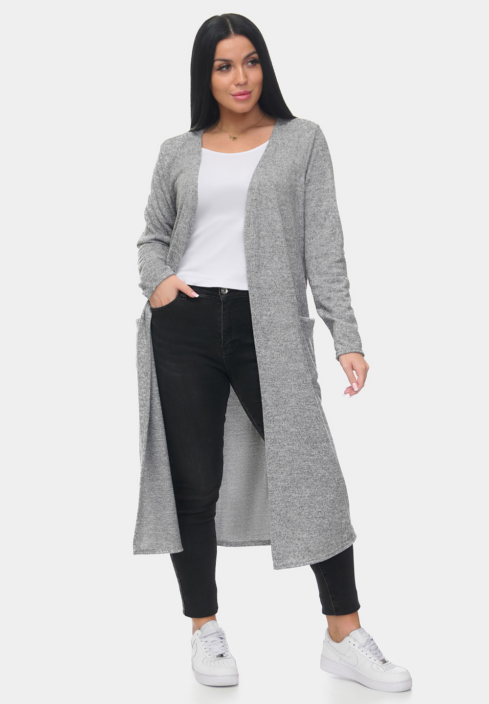 Стильный и уютный длинный кардиган из мягкой ангоры софт. Модель прямого кроя с удобными накладными карманами и открытой линией переда. Приятный на ощупь материал обеспечивает комфорт и тепло, идеально подходит для повседневных образов. Отлично сочетается с джинсами и брюками.