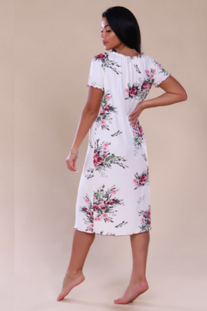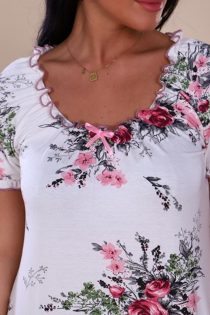 Домашнее платье с коротким рукавом не стесняет движений, удобный А-силуэт отлично смотрится на девушках с любым типом фигуры. Платье выполнено в насыщенном синем и молочном цвете и украшено нежным цветочным принтом. Горловина и рукава сорочки собраны на резинку, благодаря чему создается эффект рюши. Маленький атласный бантик добавляет кокетства. Трикотажное платье на каждый день просто создано для комфортного сна и отдыха.