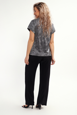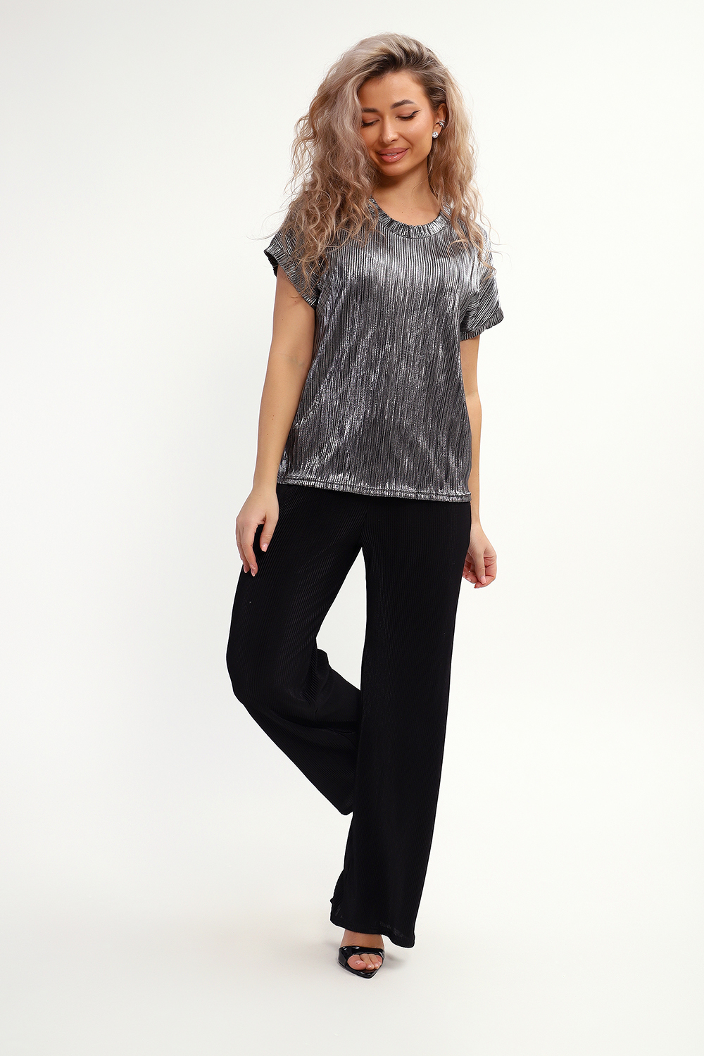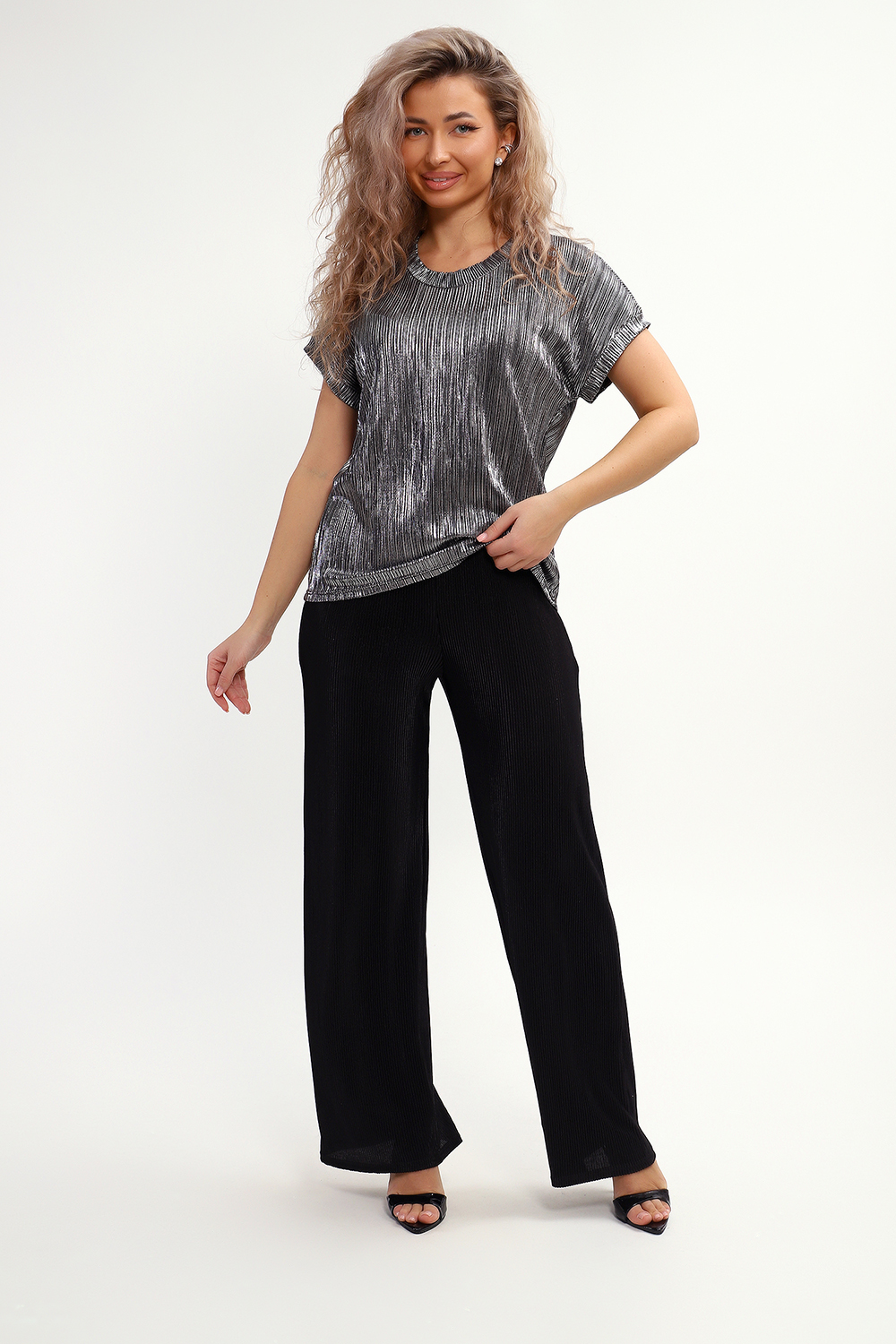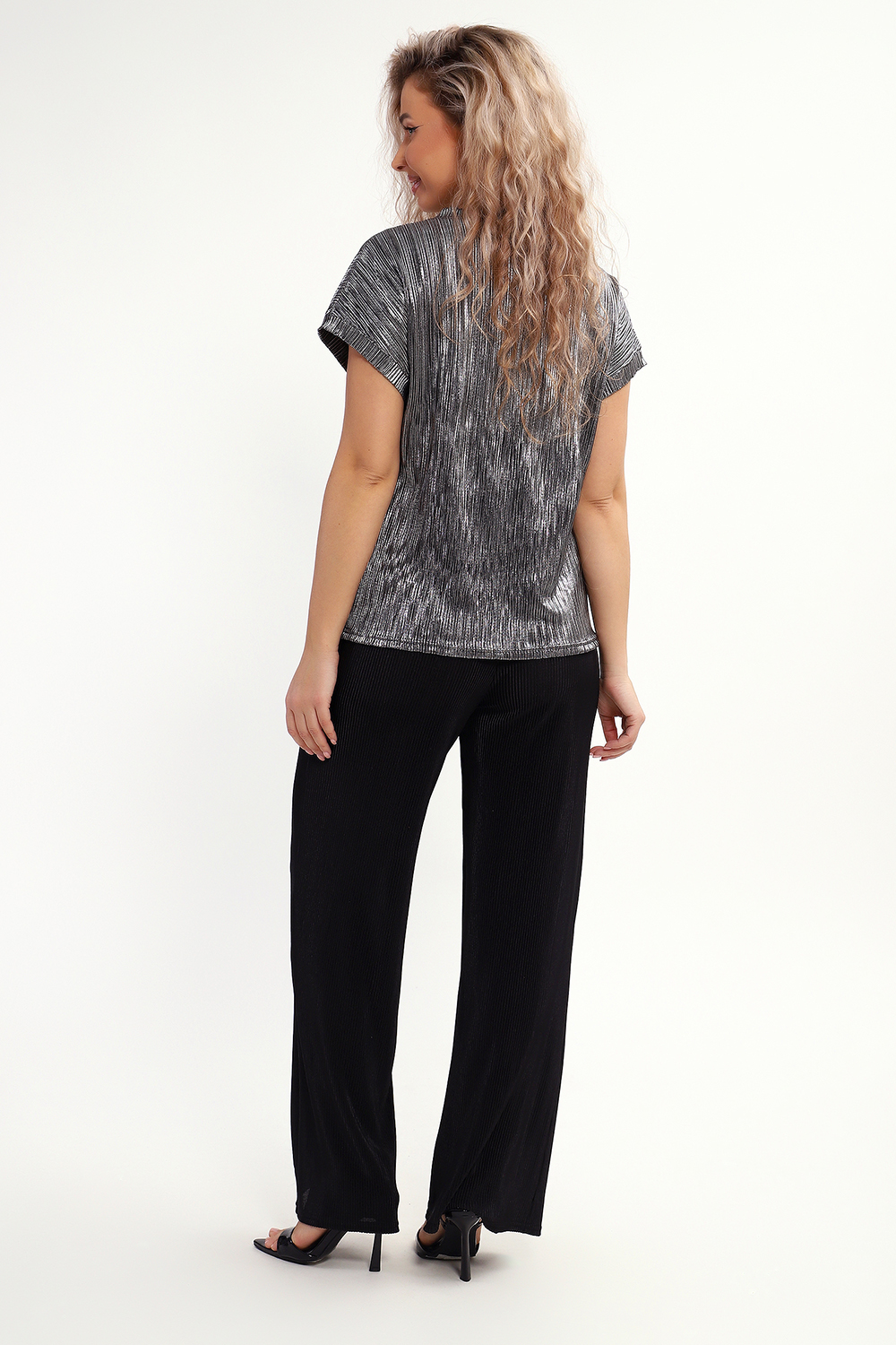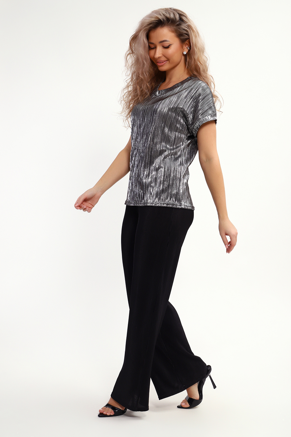 Блузка представлена в трех базовых расцветках, к которым легко подобрать юбку или брюки. На модели брюки 32827, которые изготовлены из такой же ткани, только без блестящего напыления.