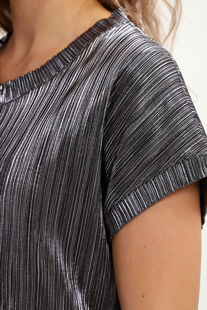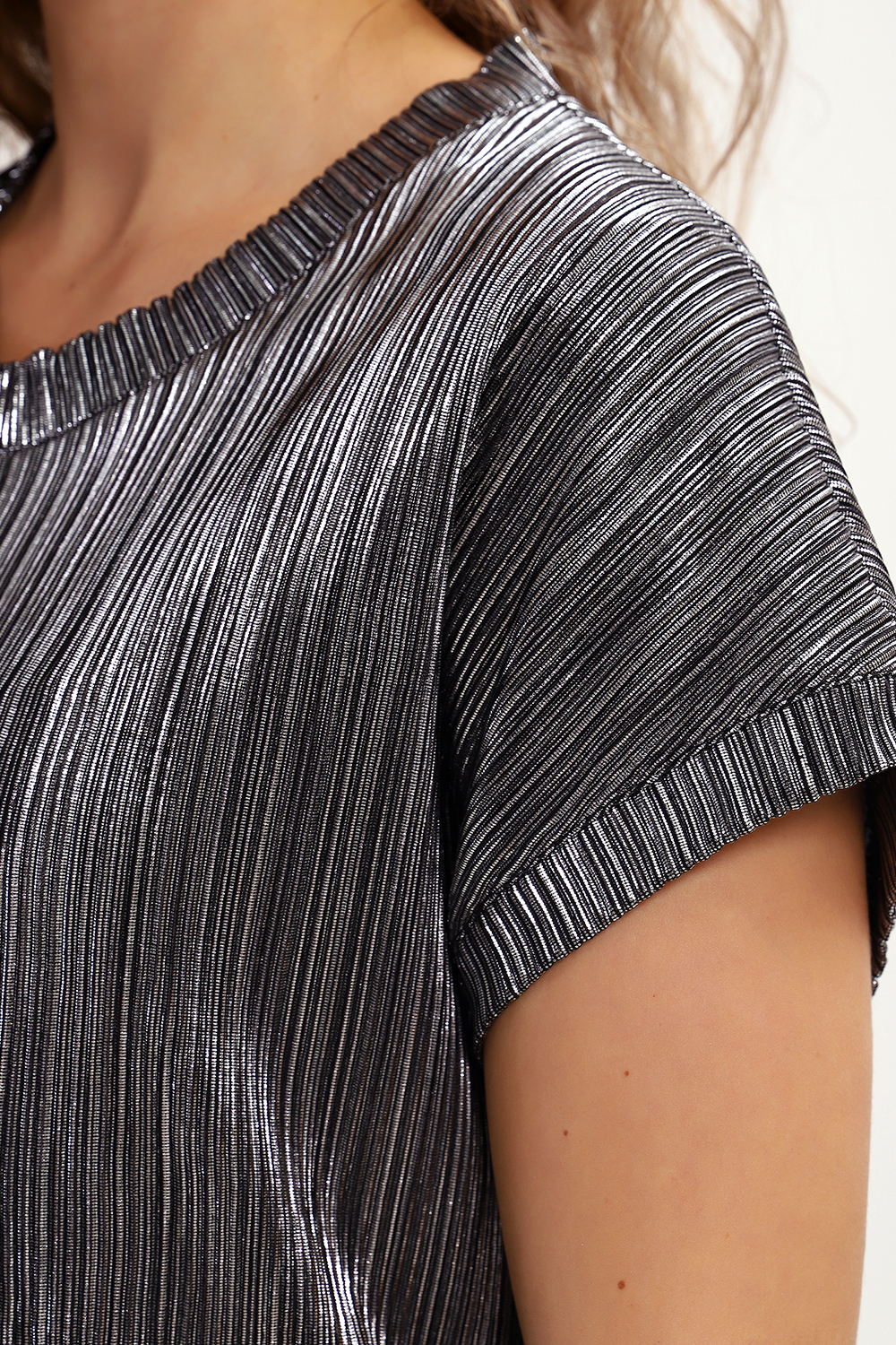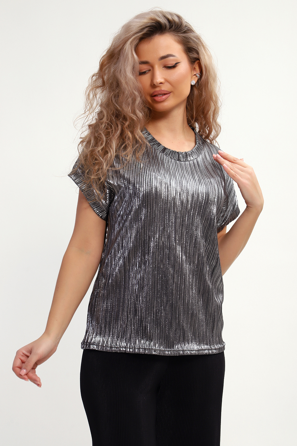 Стильная нарядная блузка, сочетающая в себе комфорт и элегантность. Благодаря свободному крою, блузка создает легкий силуэт и деликатно скрывает особенности фигуры. Добавляет изюминку изделию блестящая ткань с прочным напылением фойл, которое отлично держится на ткани после стирки. Ткань атлас гофре приятна на ощупь, хорошо тянется, не мнется, держит форму. Блузка смотрится и как офисная, и как вечерняя модель, а также это отличный вариант для летнего наряда. Округлая горловина, обработанная обтачкой, подчеркивает женственность образа, спущенный рукав не стесняет движений.  Нарядная блузка позволит вам эффектно выглядеть не только на праздничных мероприятиях, но и в будни.