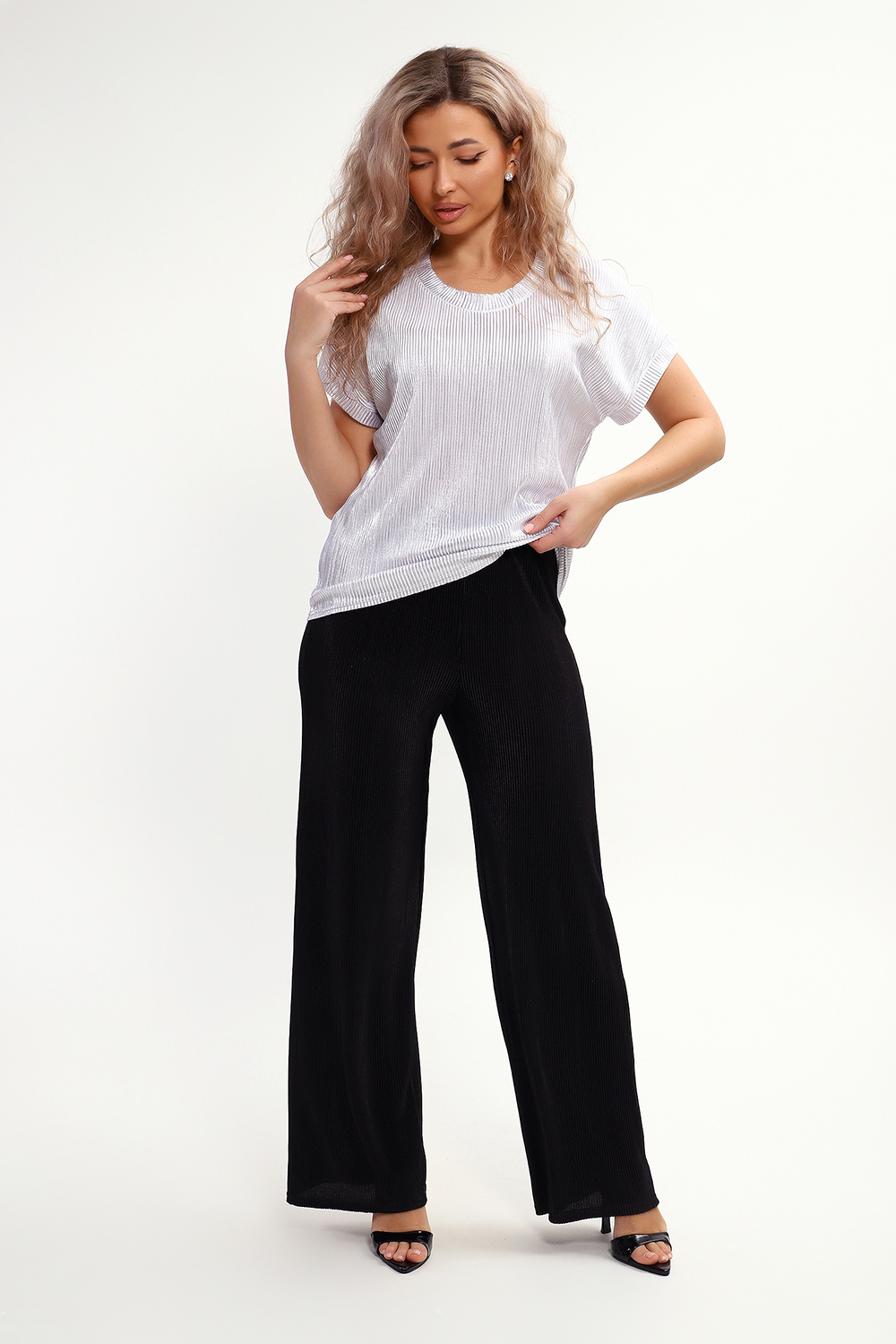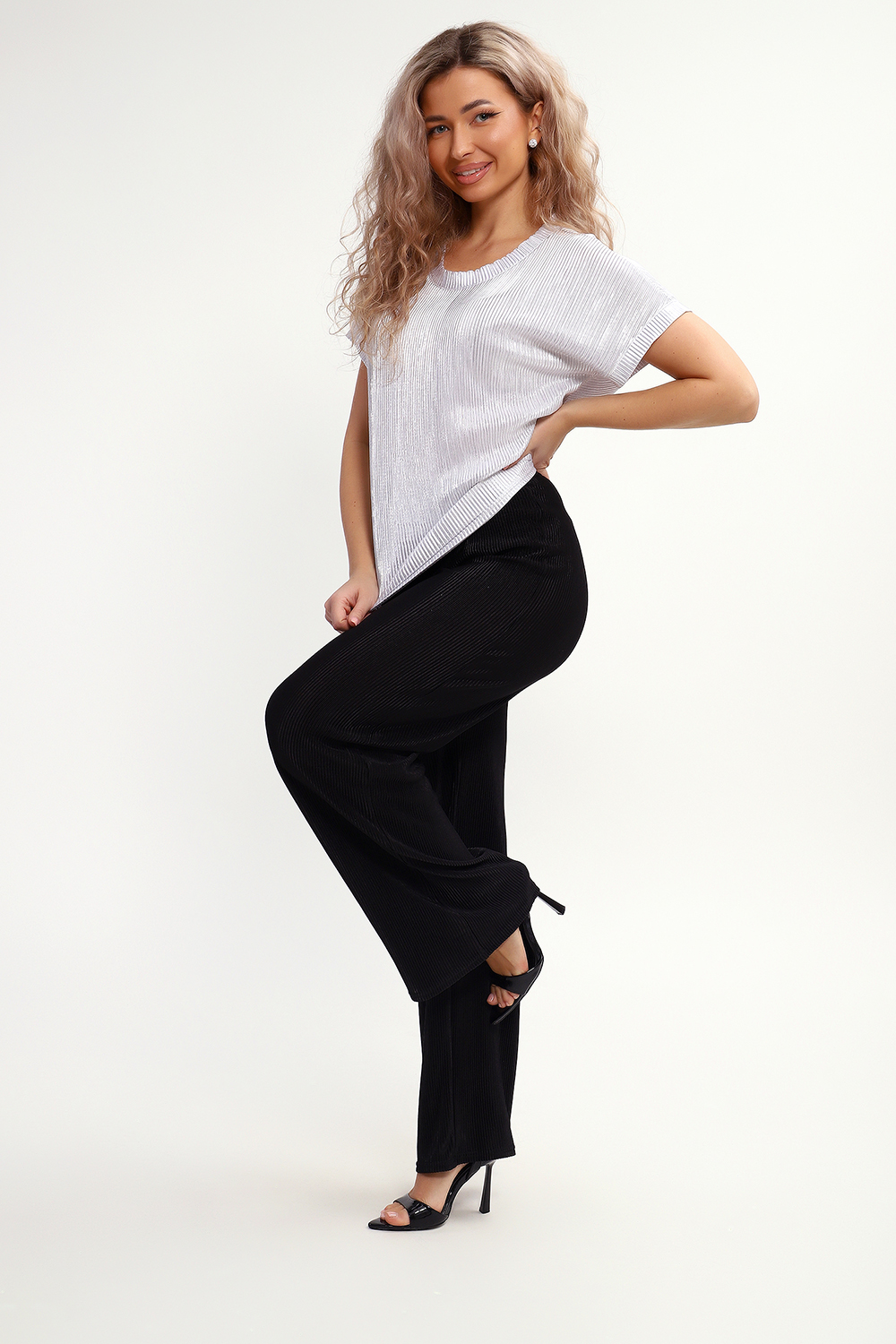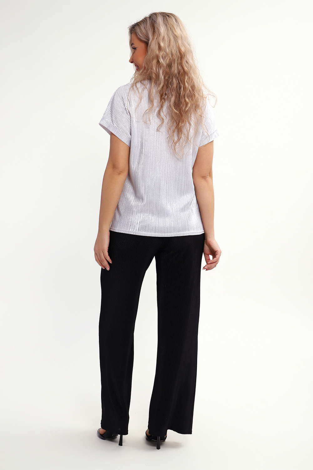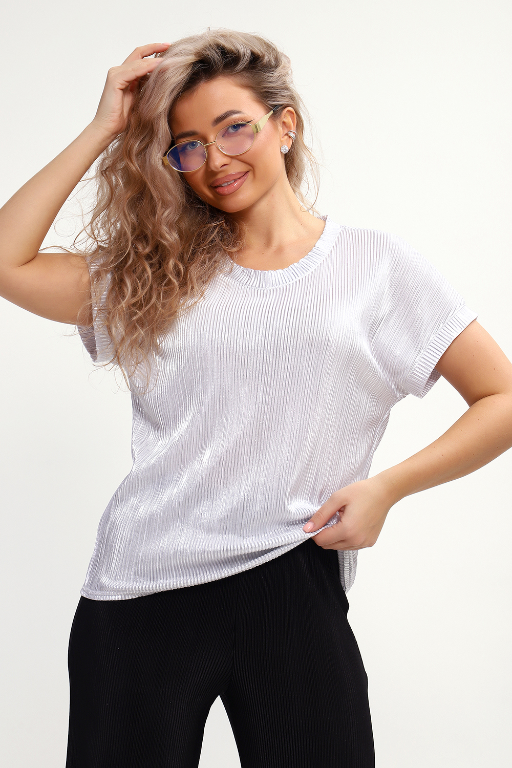 Блузка представлена в трех базовых расцветках, к которым легко подобрать юбку или брюки. На модели брюки 32827, которые изготовлены из такой же ткани, только без блестящего напыления.
