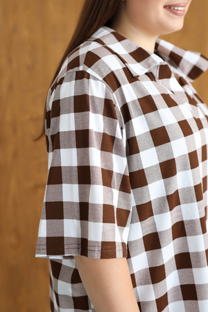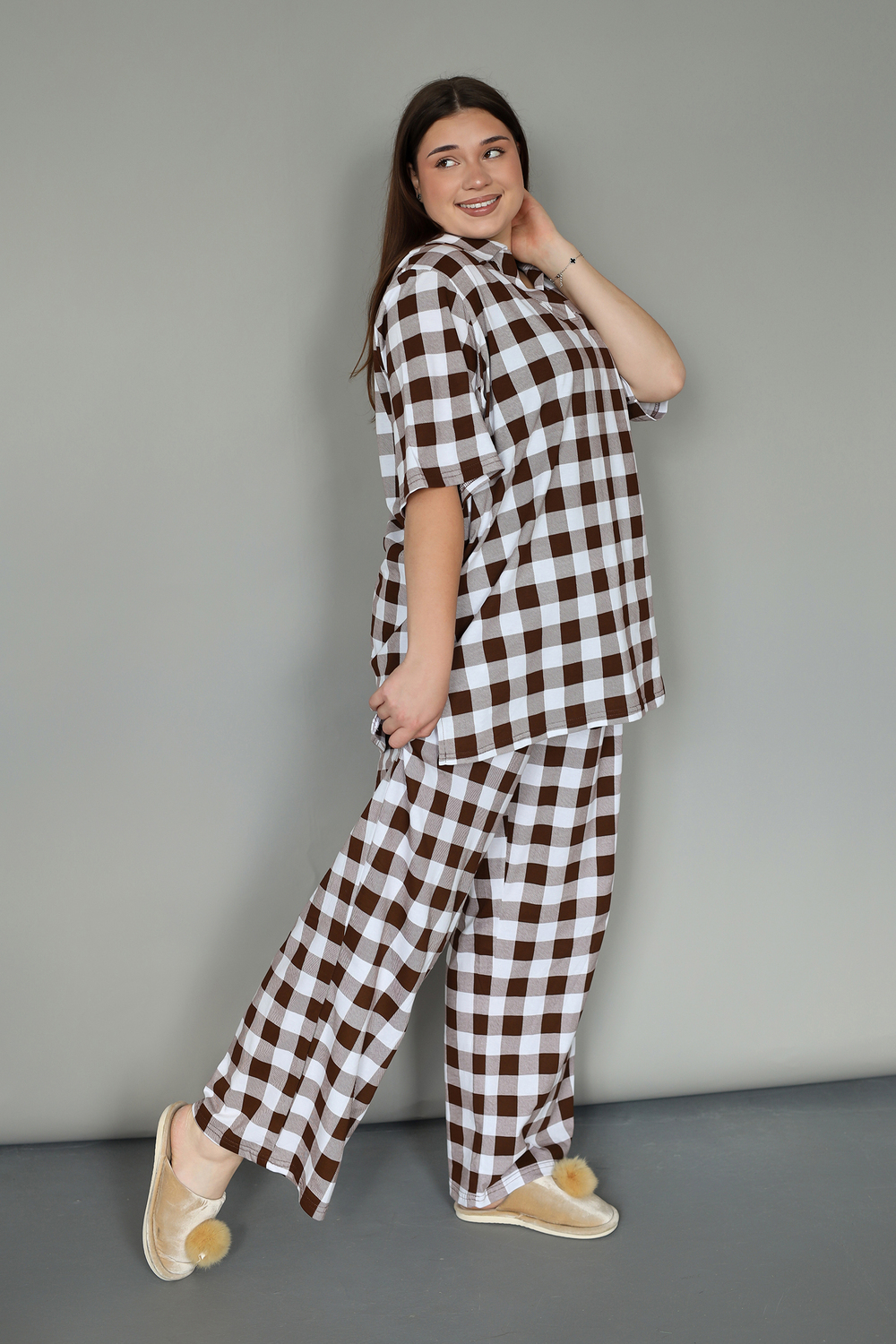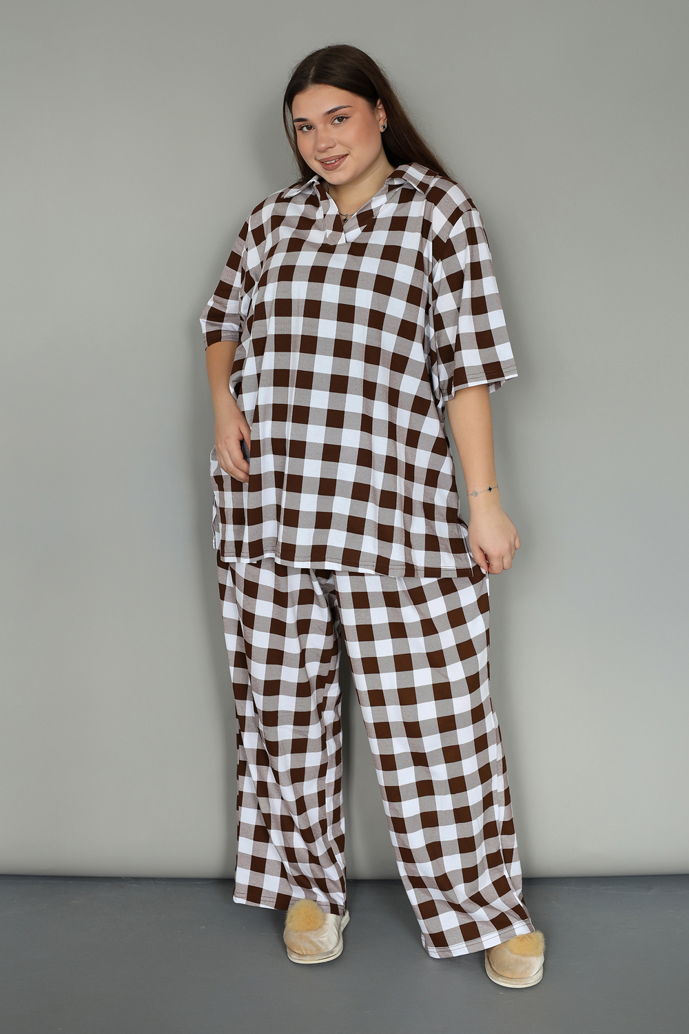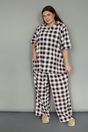 Костюм домашний с брюками больших размеров от ВРазмере – это идеальный выбор для комфортного отдыха дома. Этот трикотажный комплект, выполненный из 100% хлопка, подарит вам ощущение нежности и мягкости на коже. Модель представлена в красивом принте в клетку бордового цвета, который всегда актуален и придает образу стильный вид. Футболка поло с коротким рукавом и V-образным вырезом горловины обеспечивает удобство и свободу движений. Широкие брюки палаццо с высокой посадкой подчеркнут вашу фигуру и создадут элегантный силуэт. Этот костюм станет прекрасным подарком на любой праздник, будь то Новый год или день рождения. Он подойдет женщинам больших размеров, а также беременным, так как его покрой разработан специально для комфорта и удобства. Благодаря своей универсальности, костюм можно носить круглый год, создавая уютные образы для дома. Легко ухаживать за костюмом: достаточно стирать его при температуре не более 40°C. Выбирайте комфорт и стиль с костюмом домашним от ВРазмере!