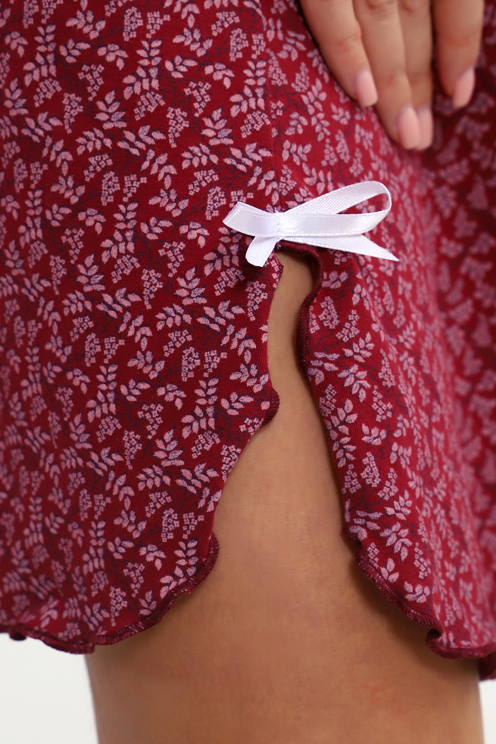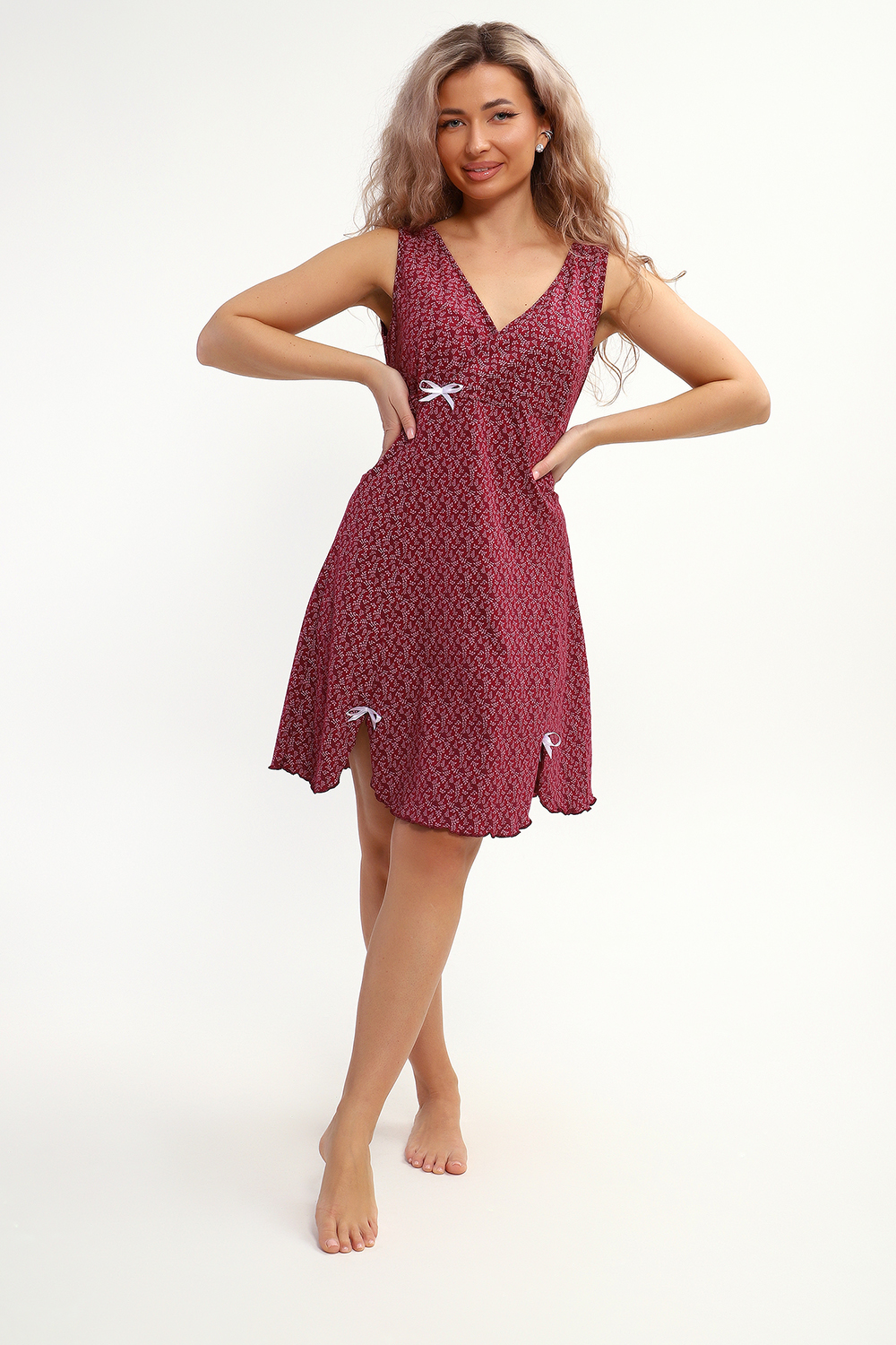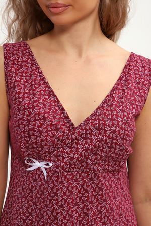 Сорочка с V образным вырезом. Полочка отрезная под грудью. Юбка с рельефами. Нашиты бантики. Подходит для беременных.