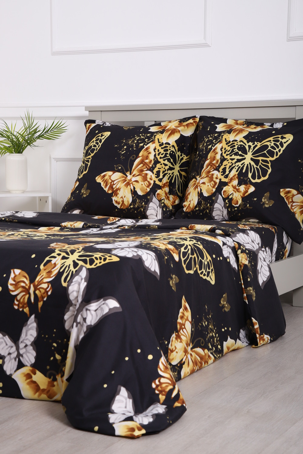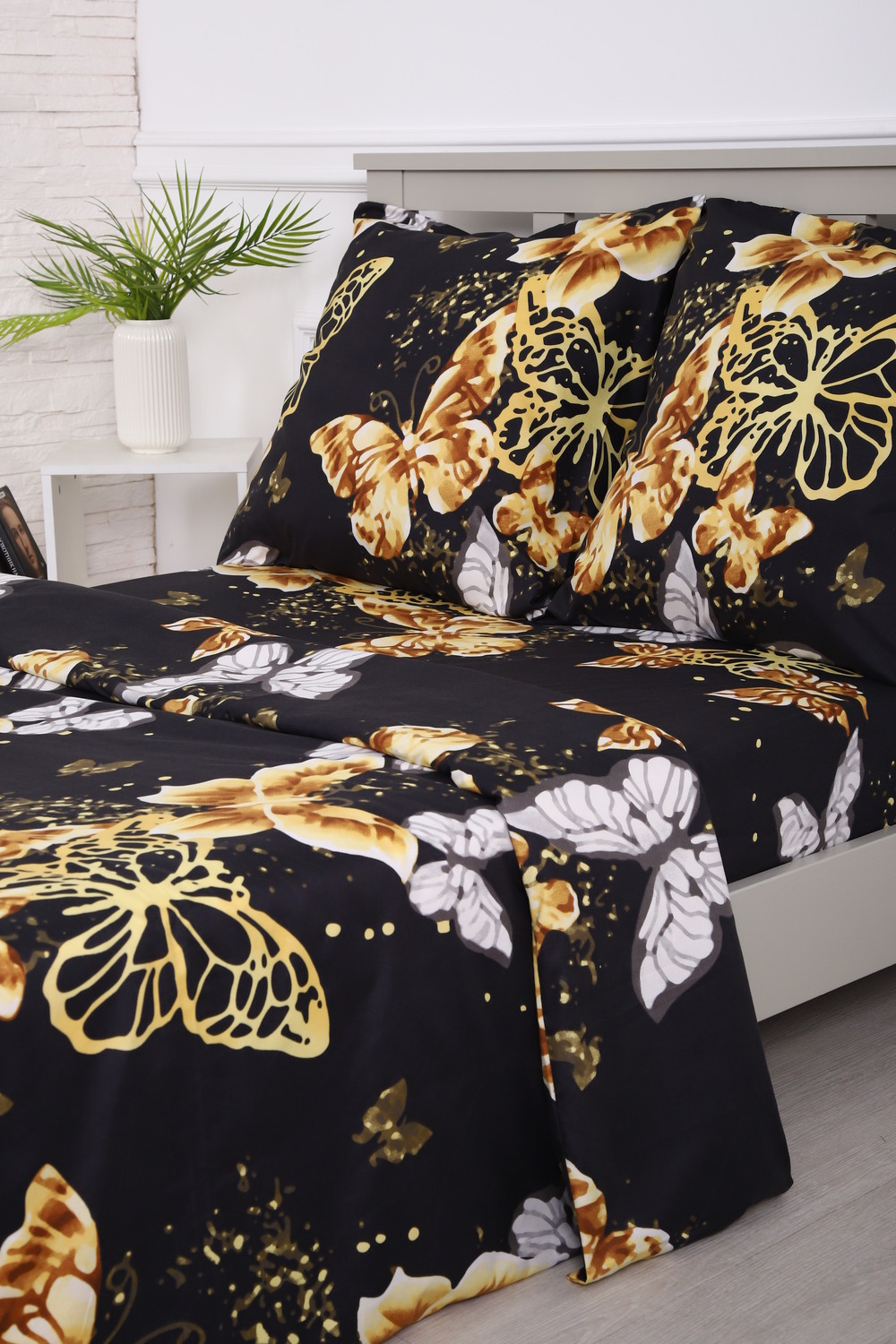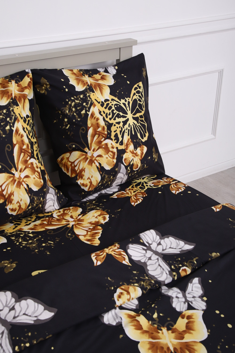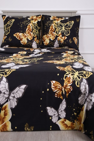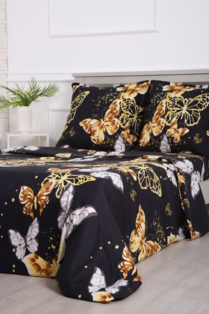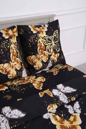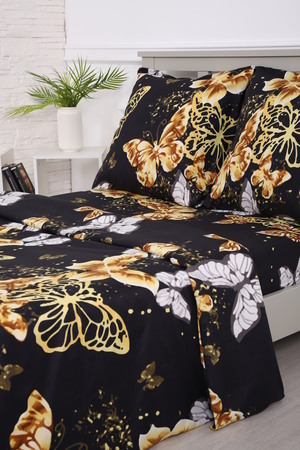 Комплект постельного белья с золотыми бабочками на черном фоне - современный дизайн, создающий уютную свежесть и комфорт в вашей спальне.