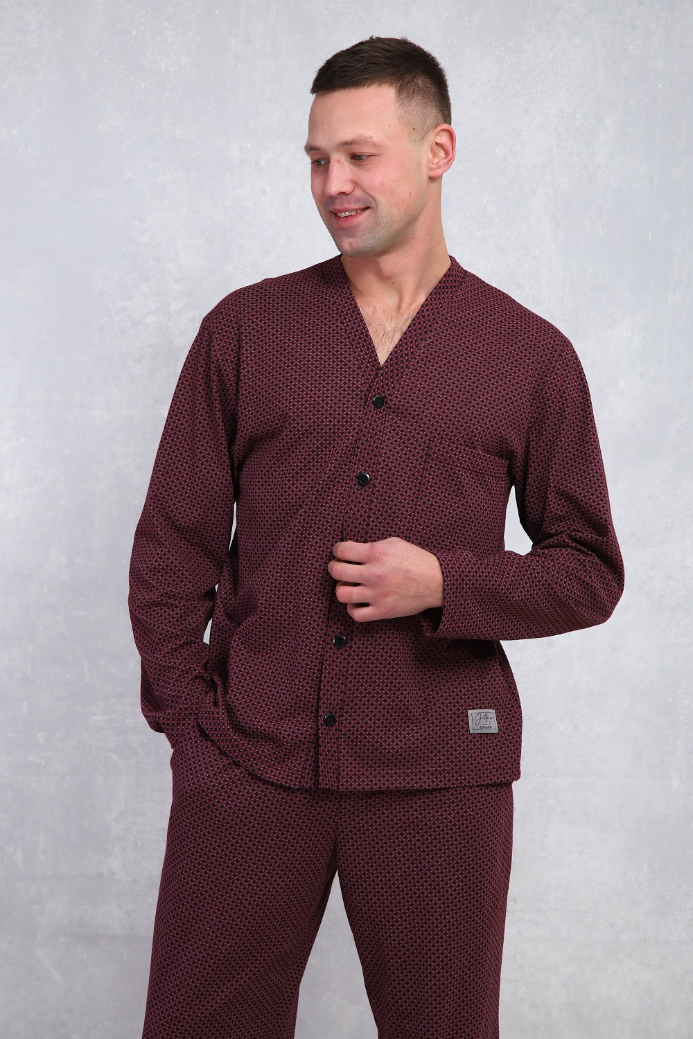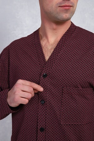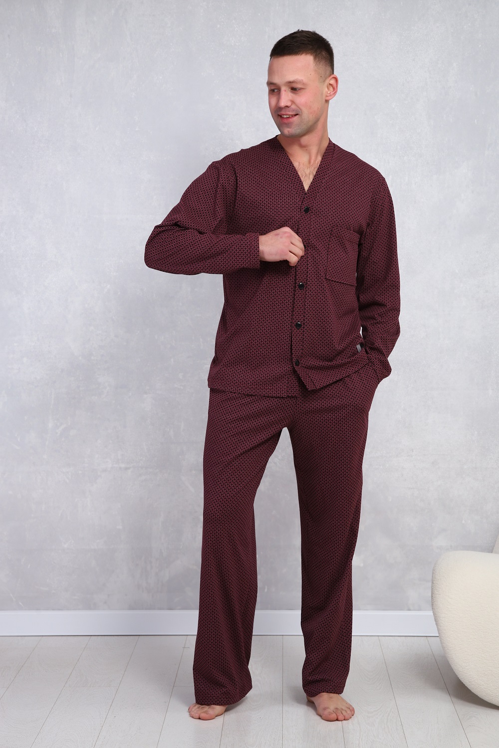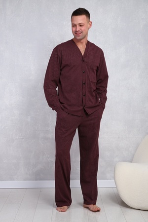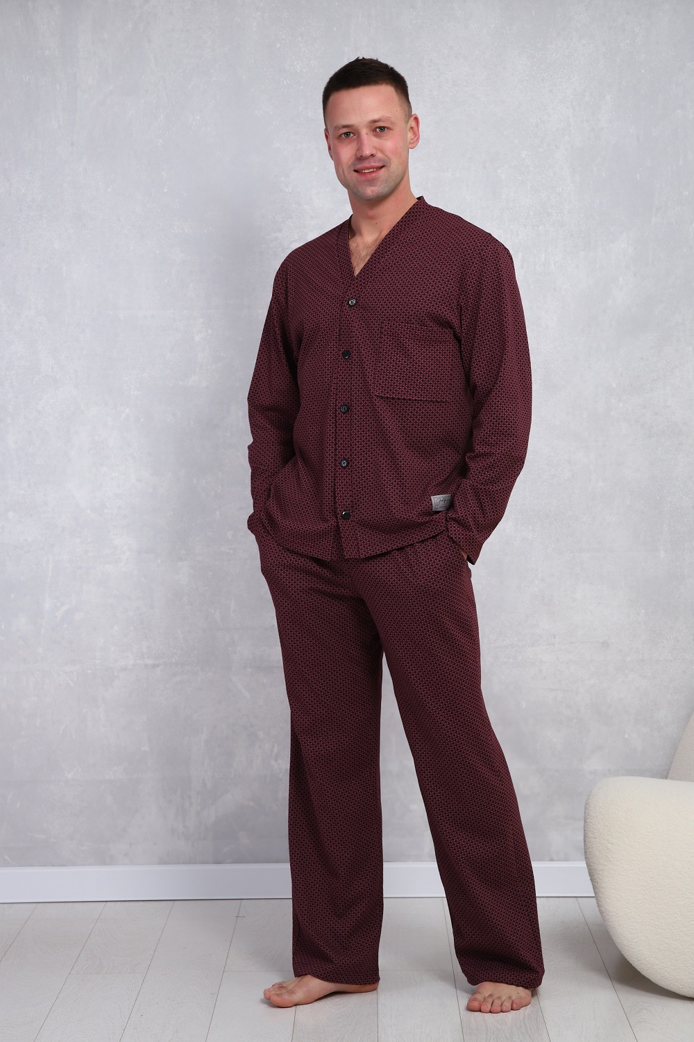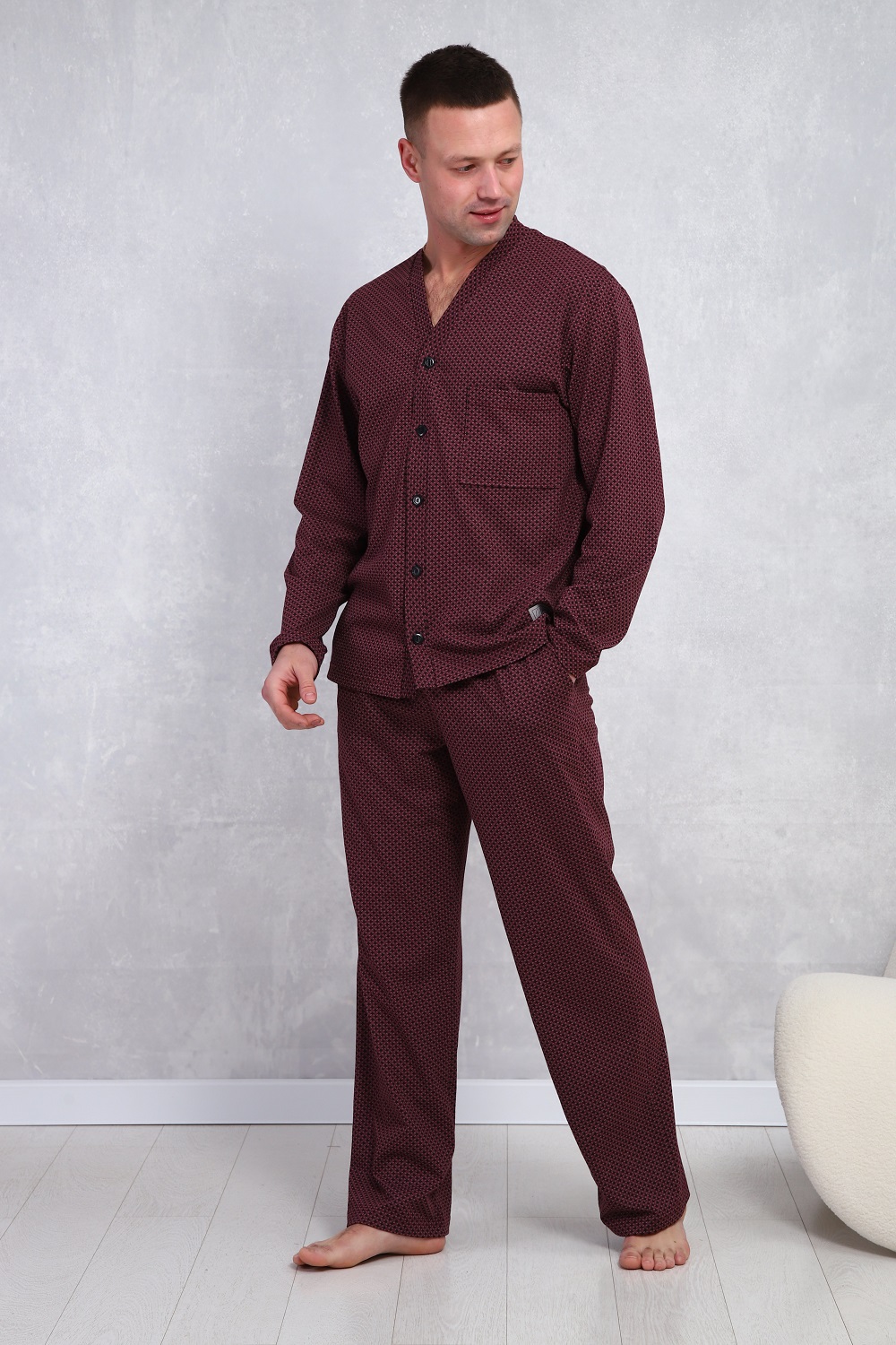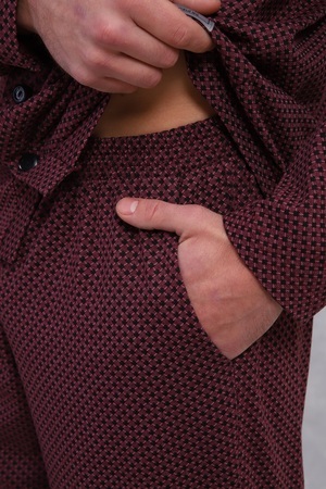 Пижама мужская в элегантном респектабельном стиле: сдержанный рисунок и классический крой. Брюки на эластичном поясе с боковыми карманами и верх с длинными рукавами и карманом на левой полочке. Хлопок 100%, обеспечит комфорт и уют.