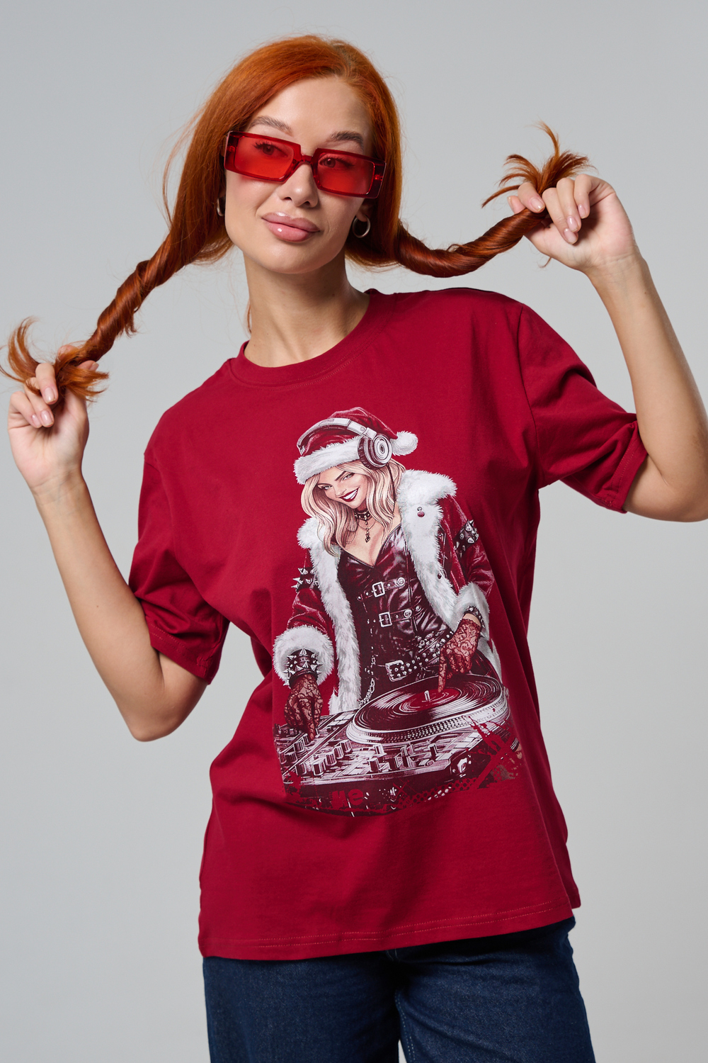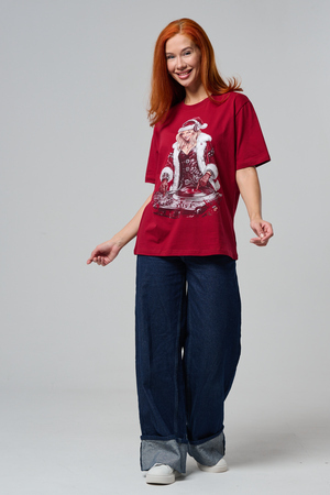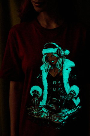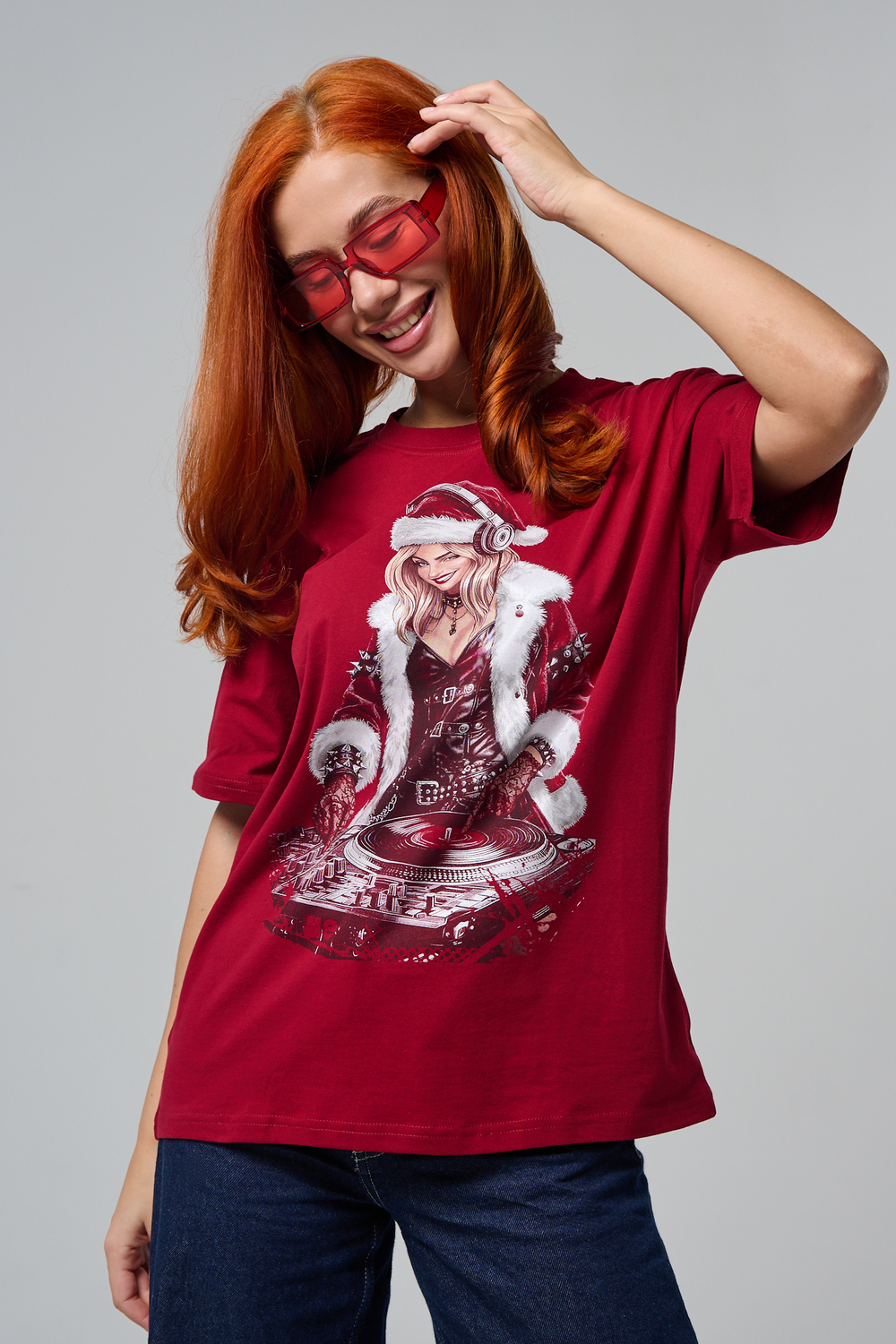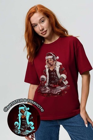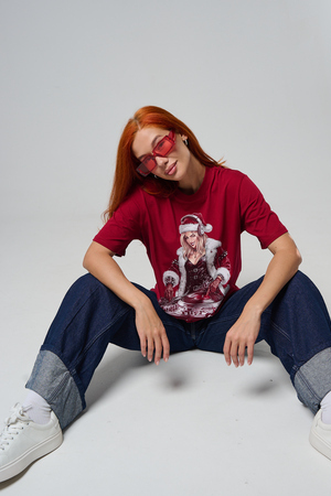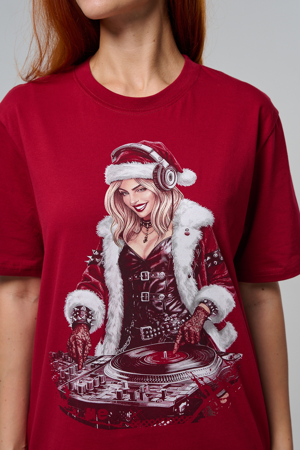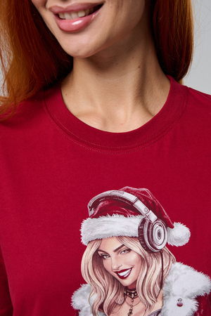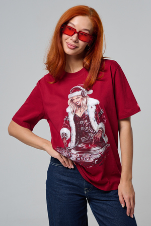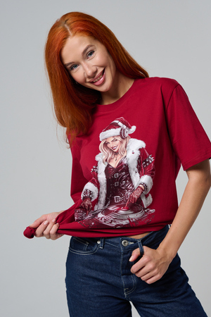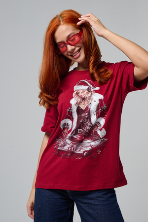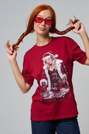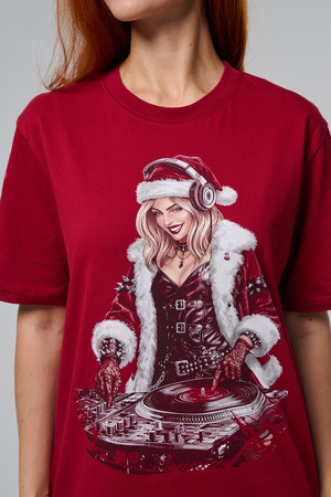Погрузитесь в магию праздника с нашей стильной oversize-футболкой "Санта-Диджей"! Эта яркая красная футболка создана для тех, кто любит миксовать новогоднюю атмосферу с ритмом музыки. Главная героиня принта — соблазнительная Санта в меховой накидке, с красной шапкой и наушниками, уверенно стоящая за диджейским пультом. Её образ сочетает классический рождественский стиль с современным уличным вайбом: белый мех, чёрная кожаная одежда и динамичная поза, полная энергии.