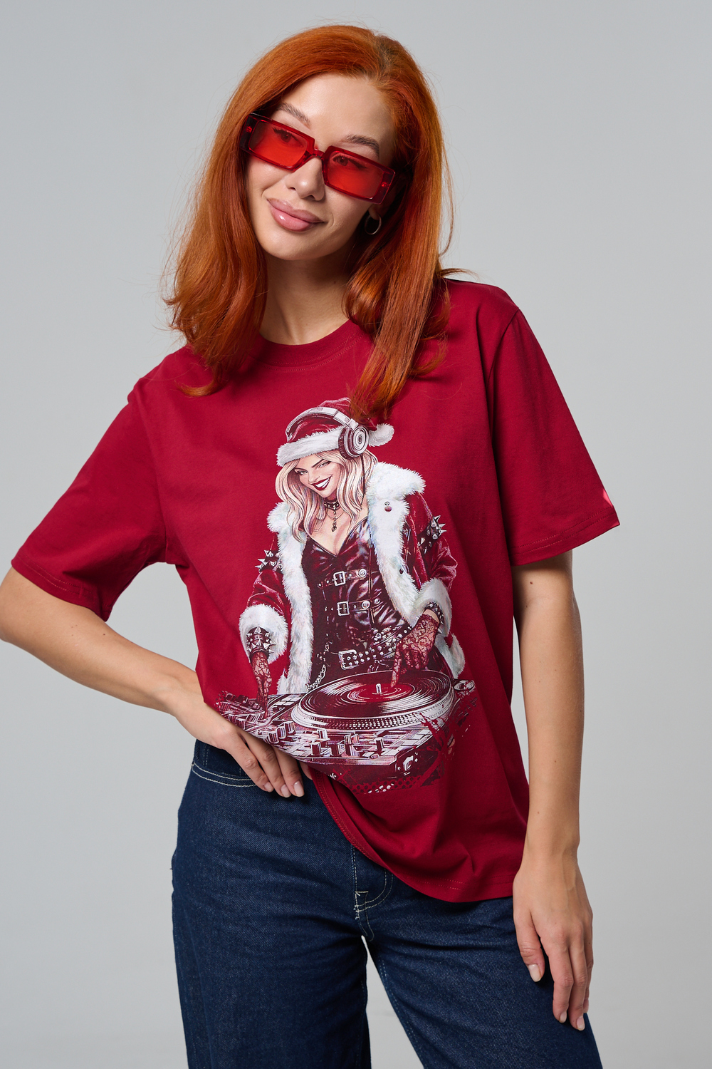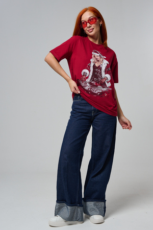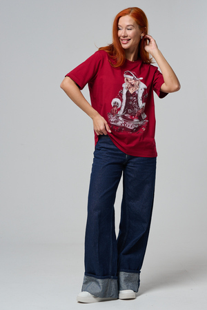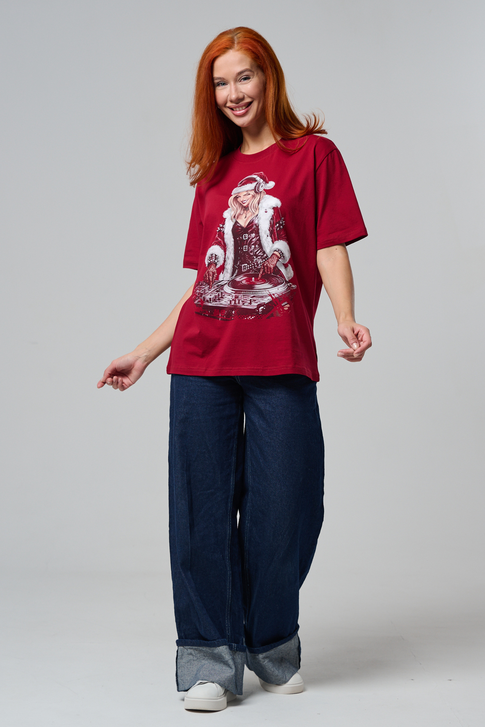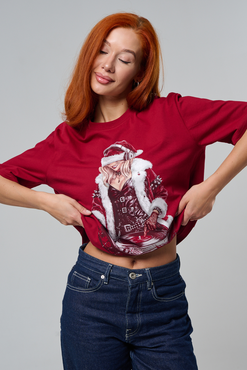 Погрузитесь в магию праздника с нашей стильной oversize-футболкой "Санта-Диджей"! Эта яркая красная футболка создана для тех, кто любит миксовать новогоднюю атмосферу с ритмом музыки. Главная героиня принта — соблазнительная Санта в меховой накидке, с красной шапкой и наушниками, уверенно стоящая за диджейским пультом. Её образ сочетает классический рождественский стиль с современным уличным вайбом: белый мех, чёрная кожаная одежда и динамичная поза, полная энергии.
