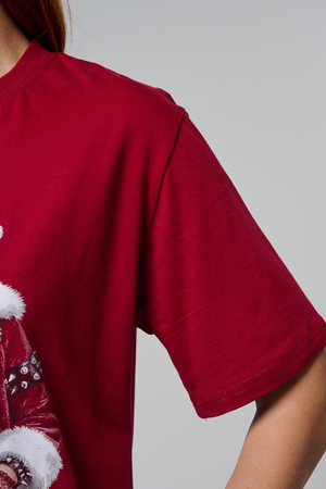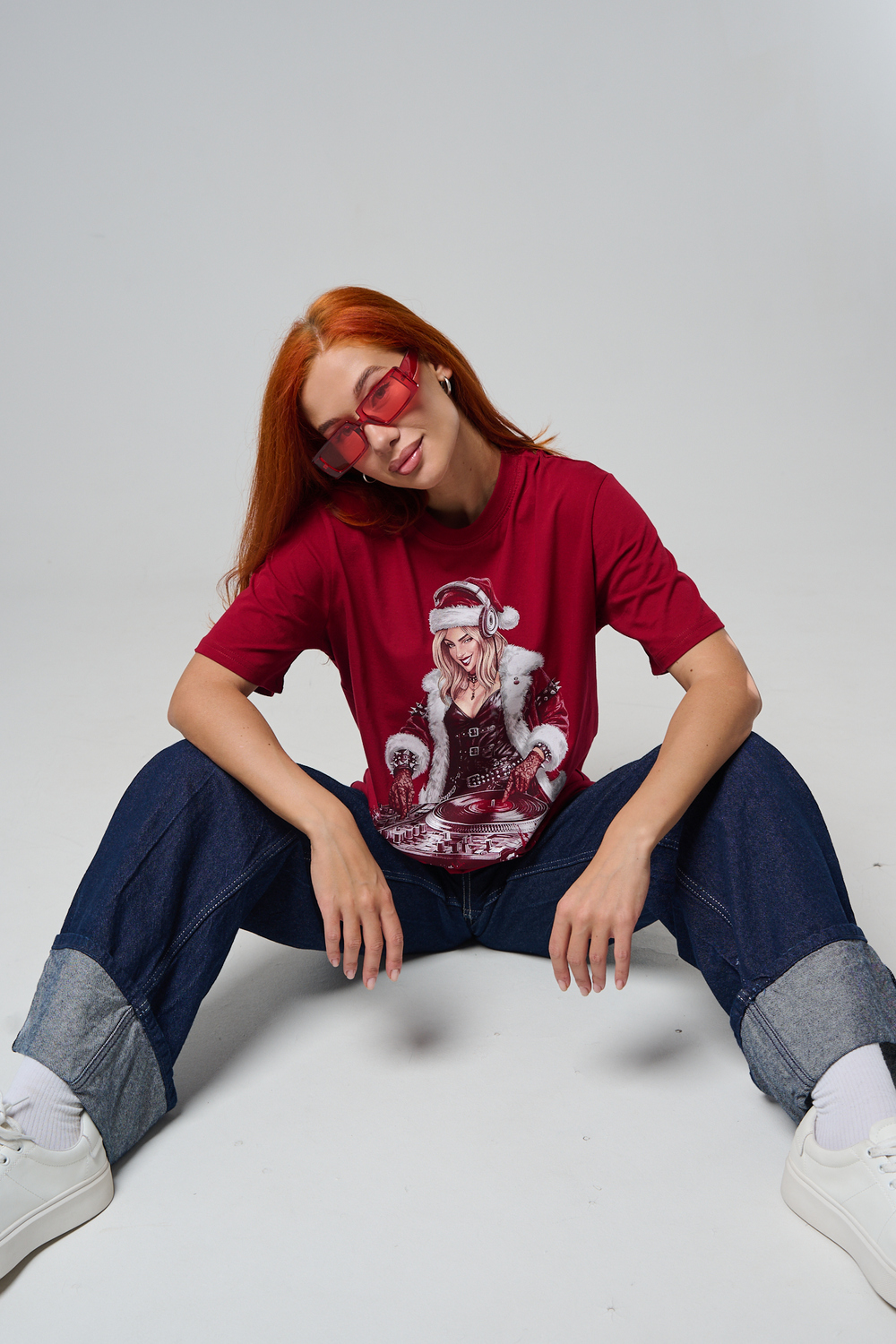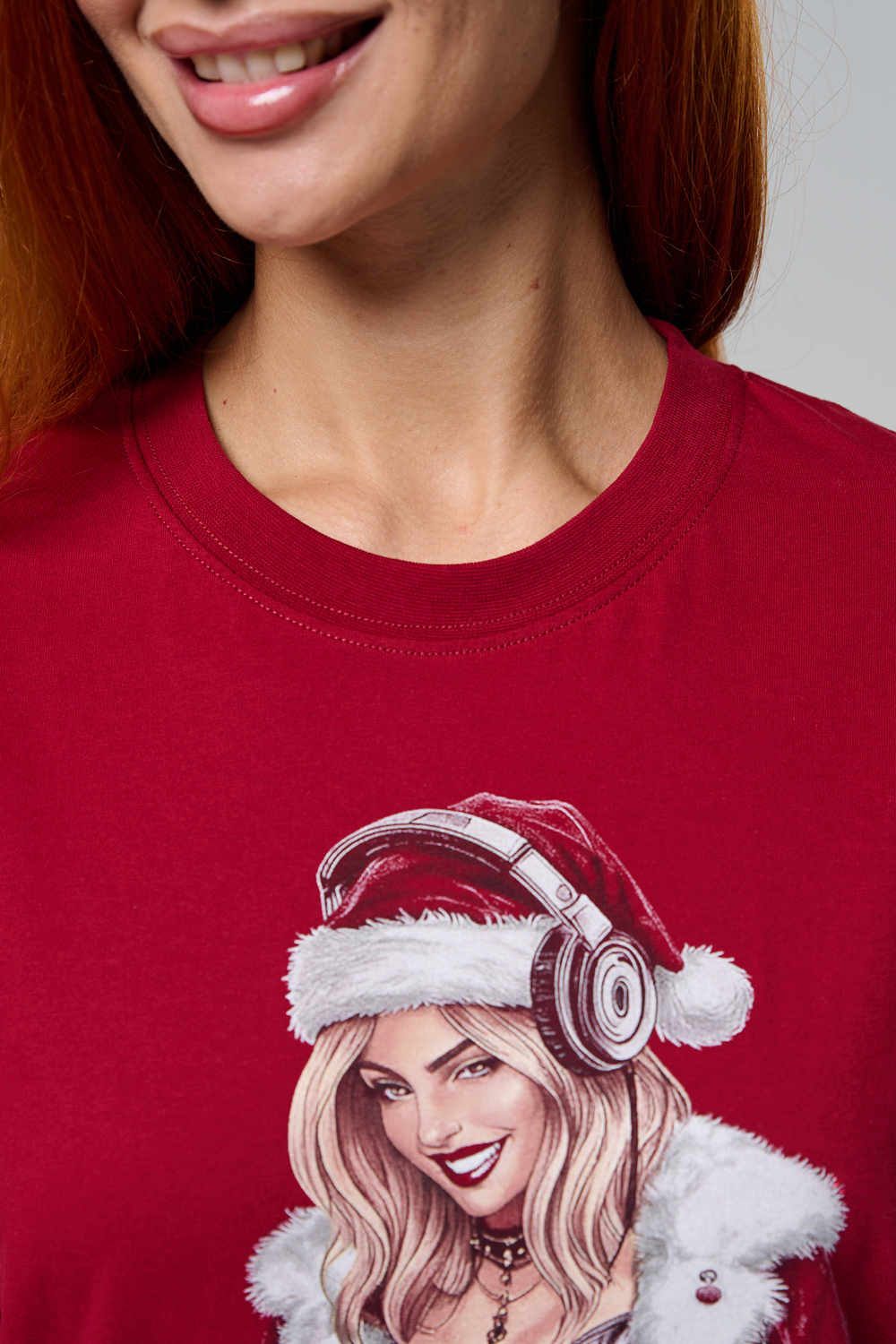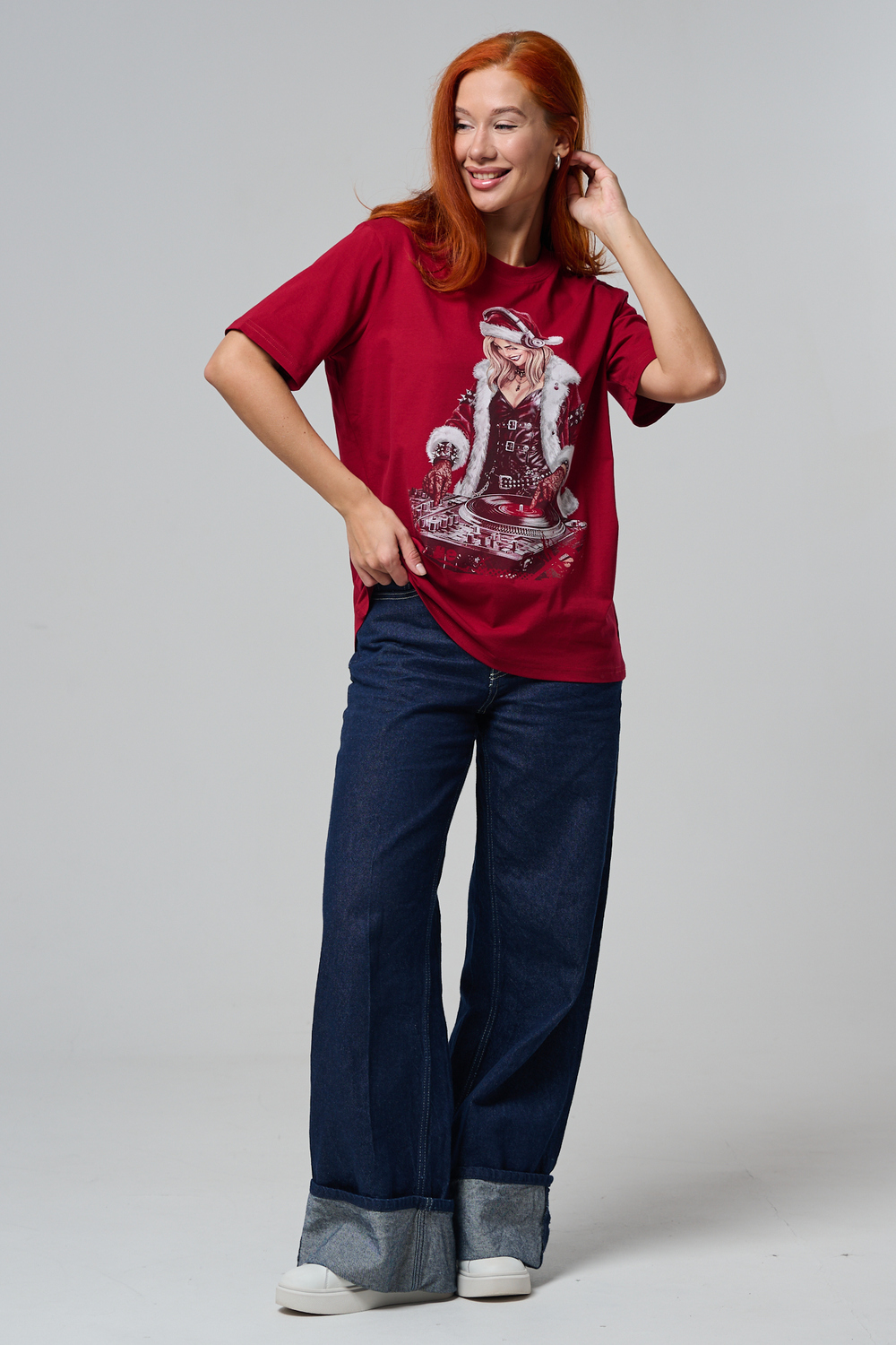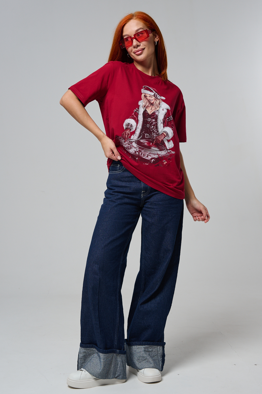 Погрузитесь в магию праздника с нашей стильной oversize-футболкой "Санта-Диджей"! Эта яркая красная футболка создана для тех, кто любит миксовать новогоднюю атмосферу с ритмом музыки. Главная героиня принта — соблазнительная Санта в меховой накидке, с красной шапкой и наушниками, уверенно стоящая за диджейским пультом. Её образ сочетает классический рождественский стиль с современным уличным вайбом: белый мех, чёрная кожаная одежда и динамичная поза, полная энергии.