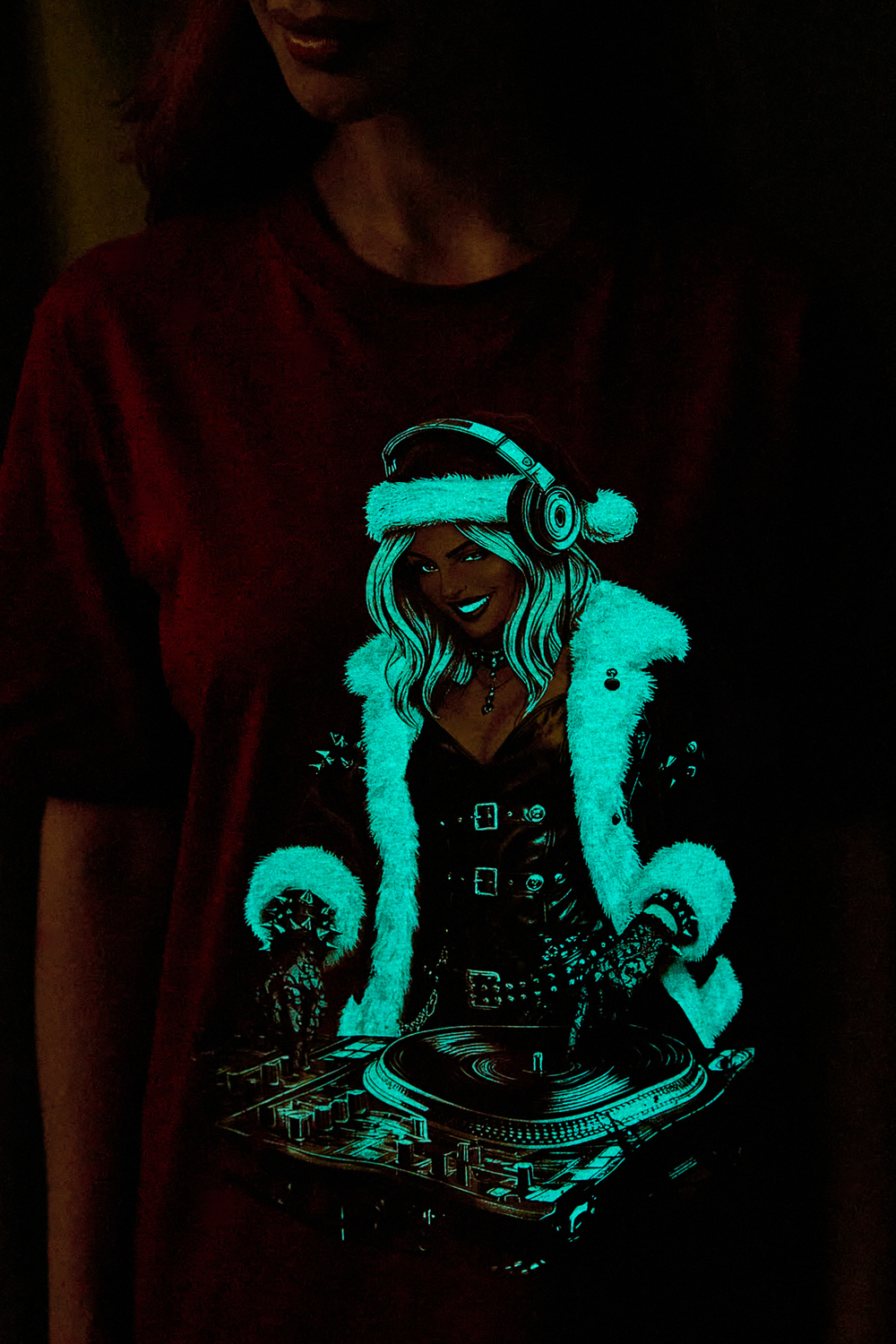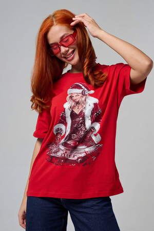 Погрузитесь в магию праздника с нашей стильной oversize-футболкой "Санта-Диджей"! Эта яркая красная футболка создана для тех, кто любит миксовать новогоднюю атмосферу с ритмом музыки. Главная героиня принта — соблазнительная Санта в меховой накидке, с красной шапкой и наушниками, уверенно стоящая за диджейским пультом. Её образ сочетает классический рождественский стиль с современным уличным вайбом: белый мех, чёрная кожаная одежда и динамичная поза, полная энергии.