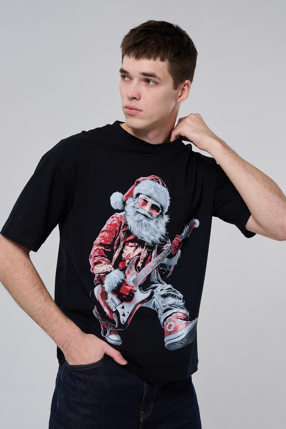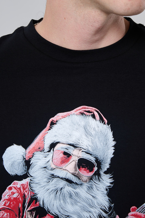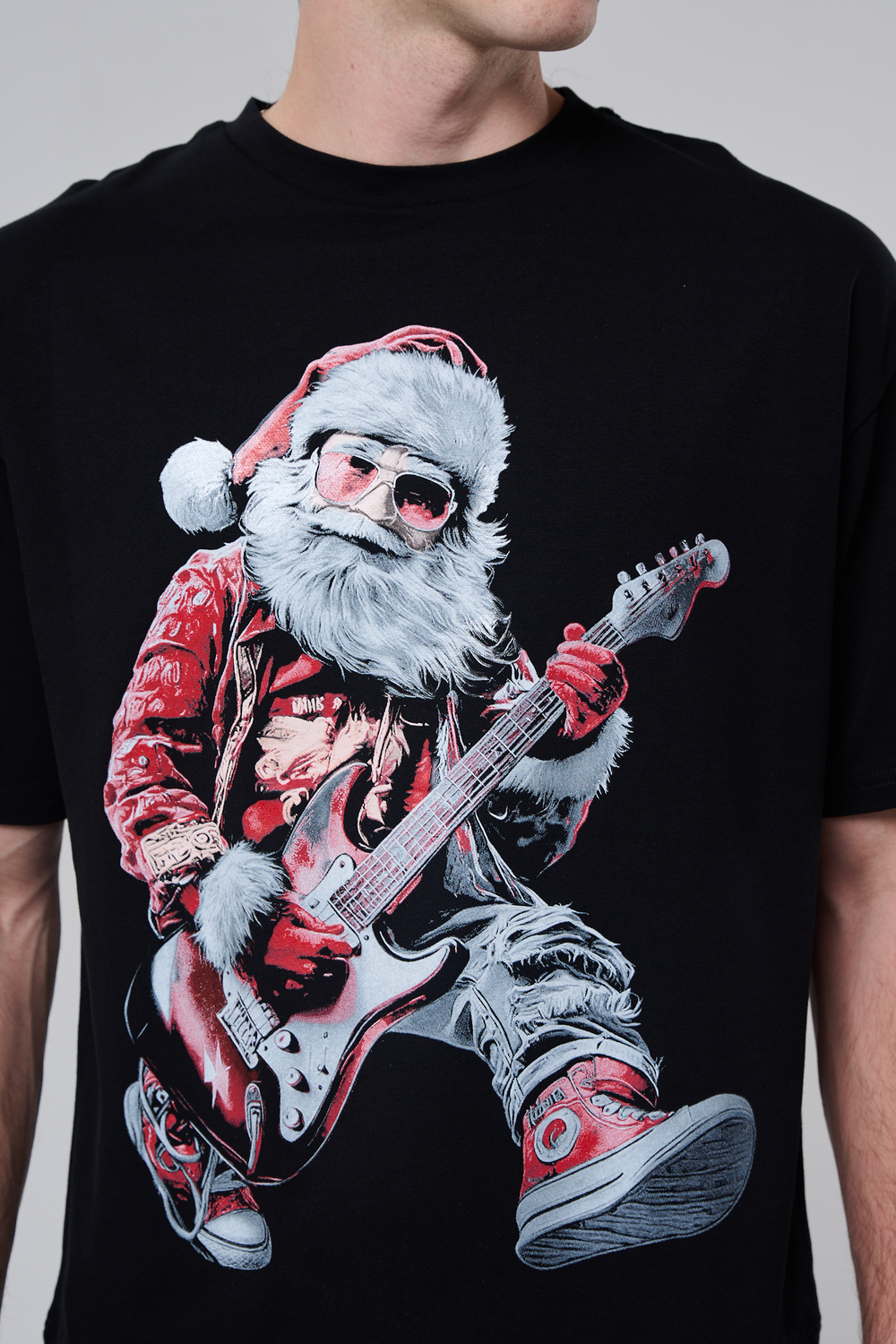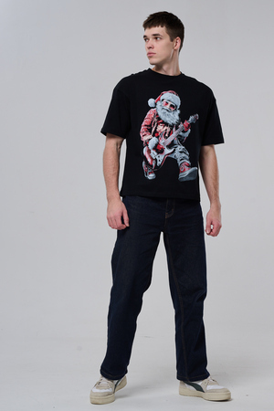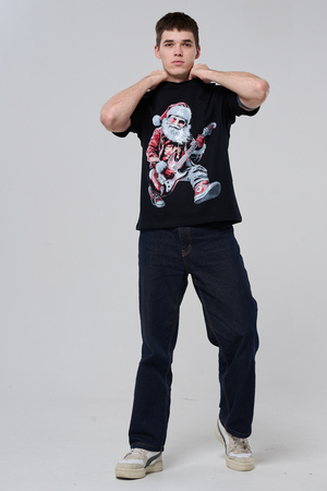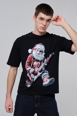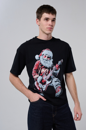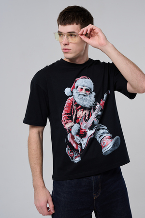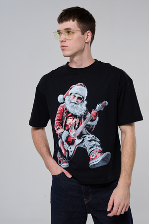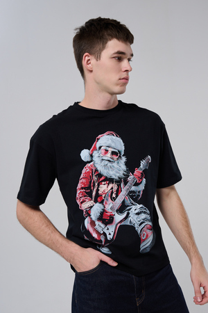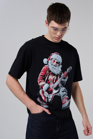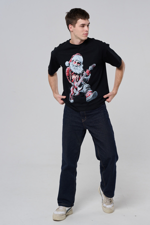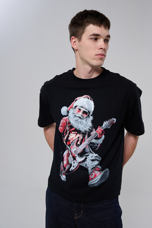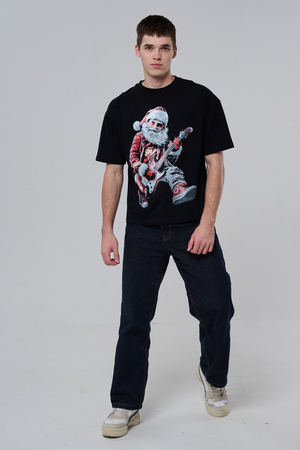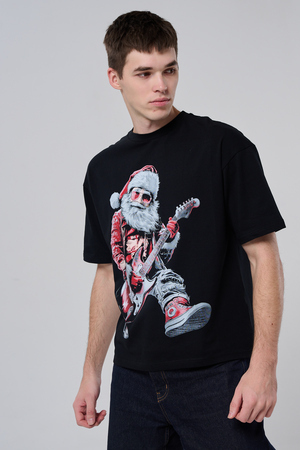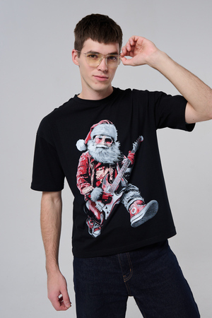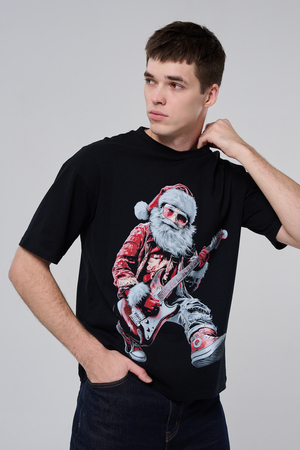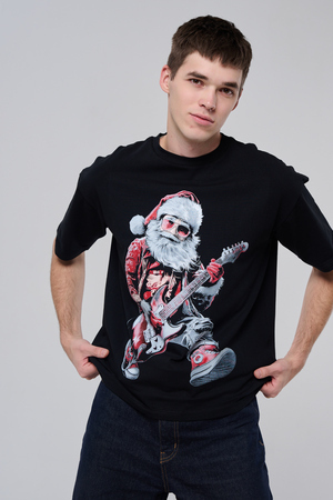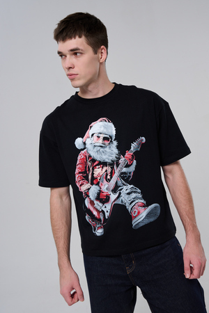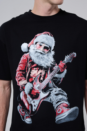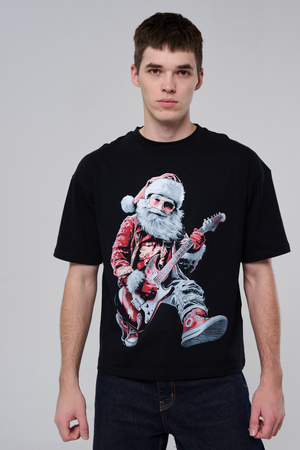 Погрузитесь в атмосферу праздничного рока с этой стильной чёрной футболкой! Главный герой — Санта-Клаус в образе крутого гитариста: красный костюм с меховой оторочкой, белая борода, озорная улыбка и электрогитара в руках. Он стоит в динамичной позе, готовый зажечь сцену, а на ногах — модные кеды. Дизайн выполнен в контрастных чёрно-красных тонах с детализированными элементами, включая татуировки на руках.