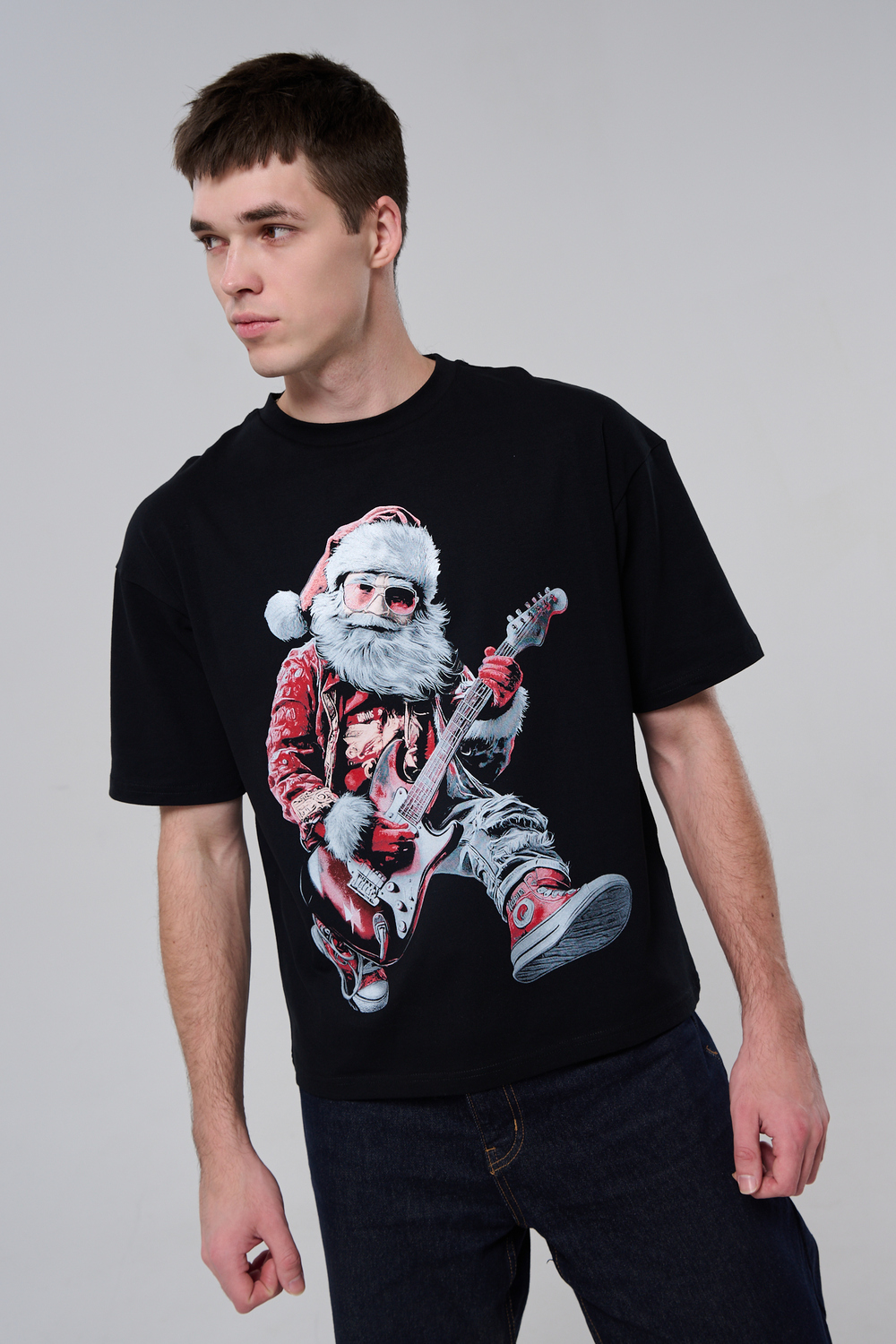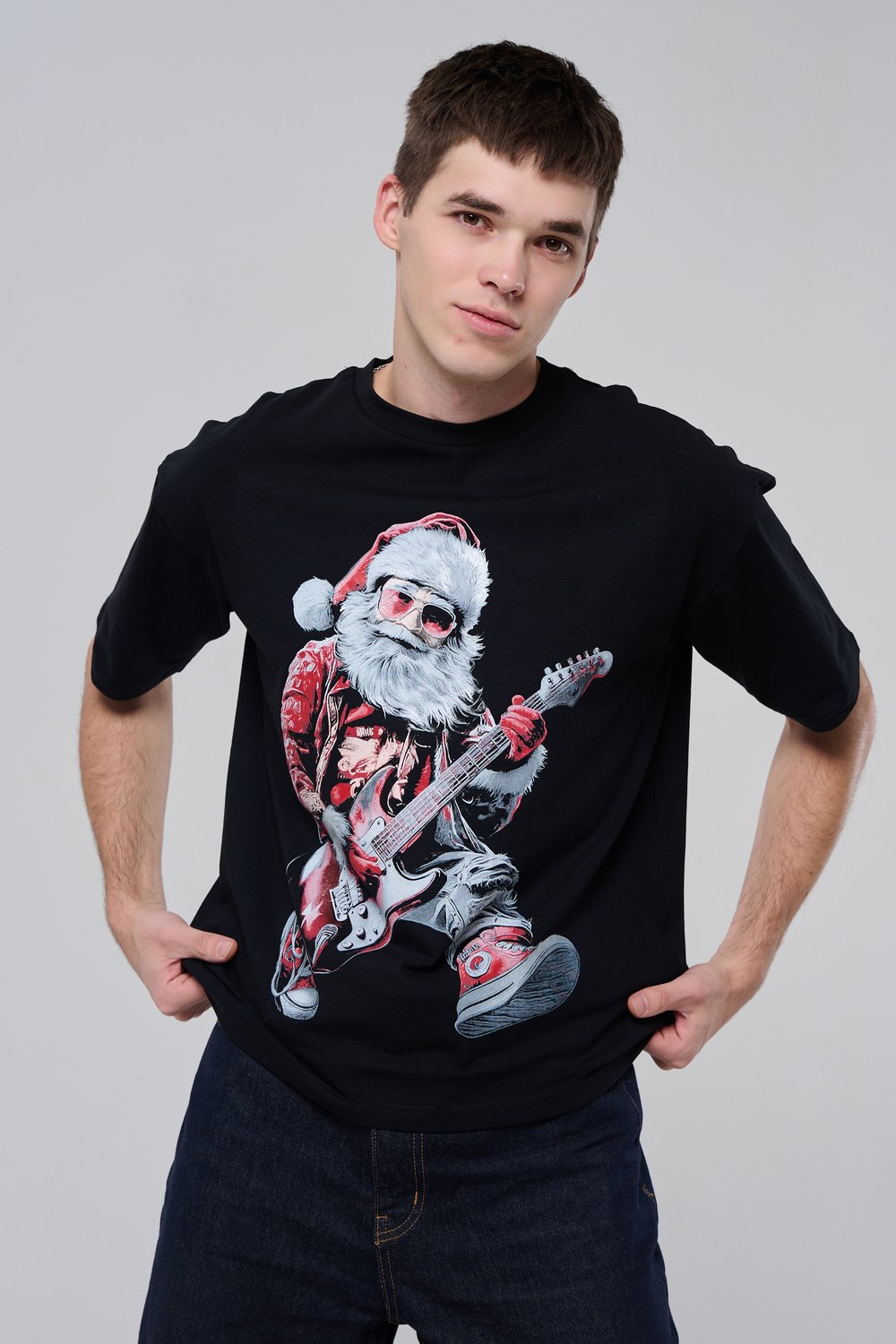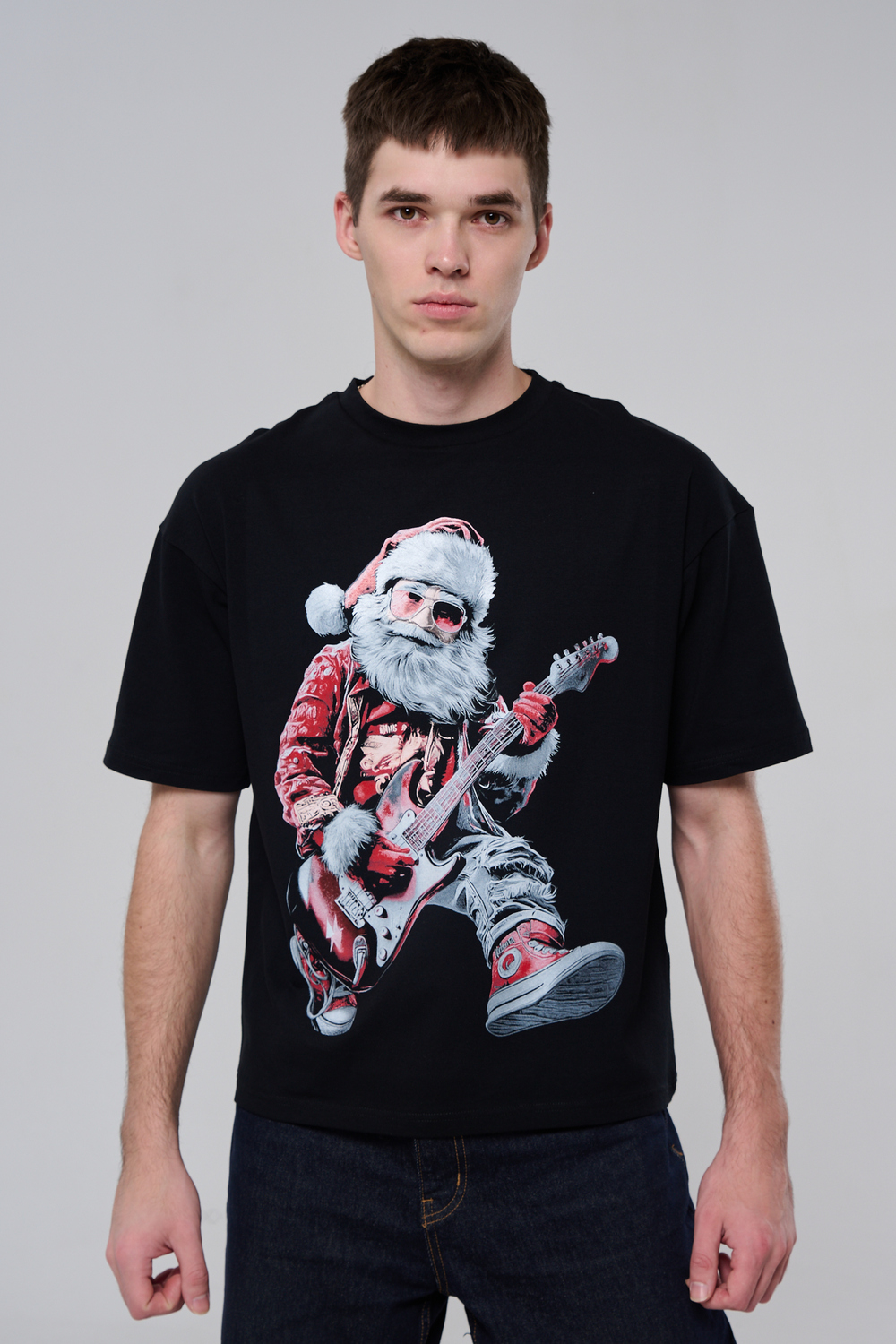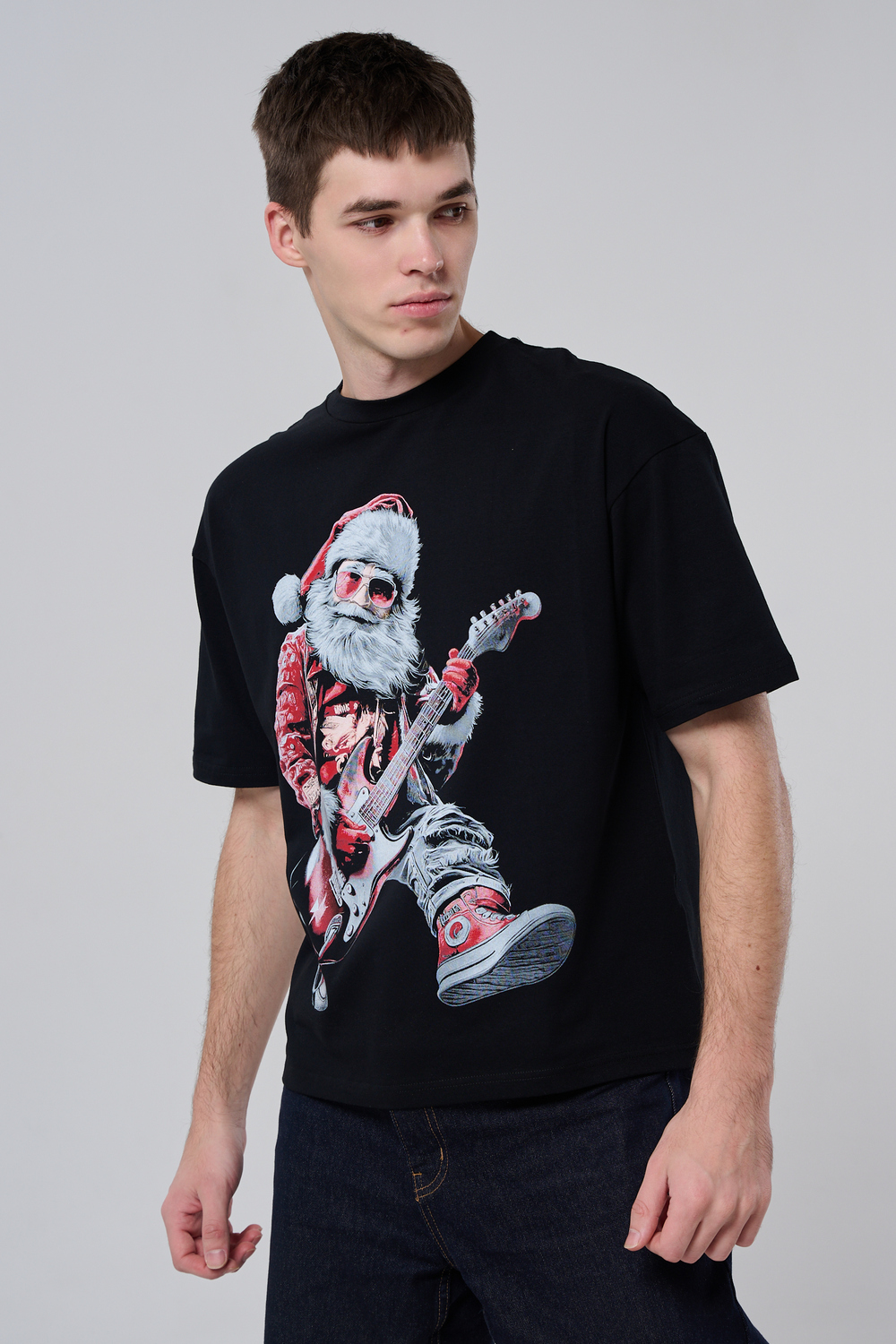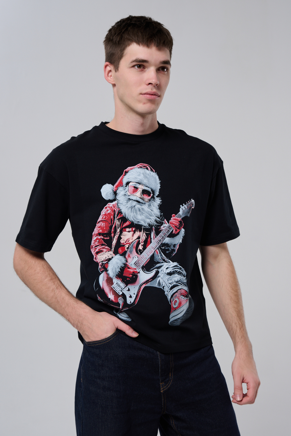Погрузитесь в атмосферу праздничного рока с этой стильной чёрной футболкой! Главный герой — Санта-Клаус в образе крутого гитариста: красный костюм с меховой оторочкой, белая борода, озорная улыбка и электрогитара в руках. Он стоит в динамичной позе, готовый зажечь сцену, а на ногах — модные кеды. Дизайн выполнен в контрастных чёрно-красных тонах с детализированными элементами, включая татуировки на руках.