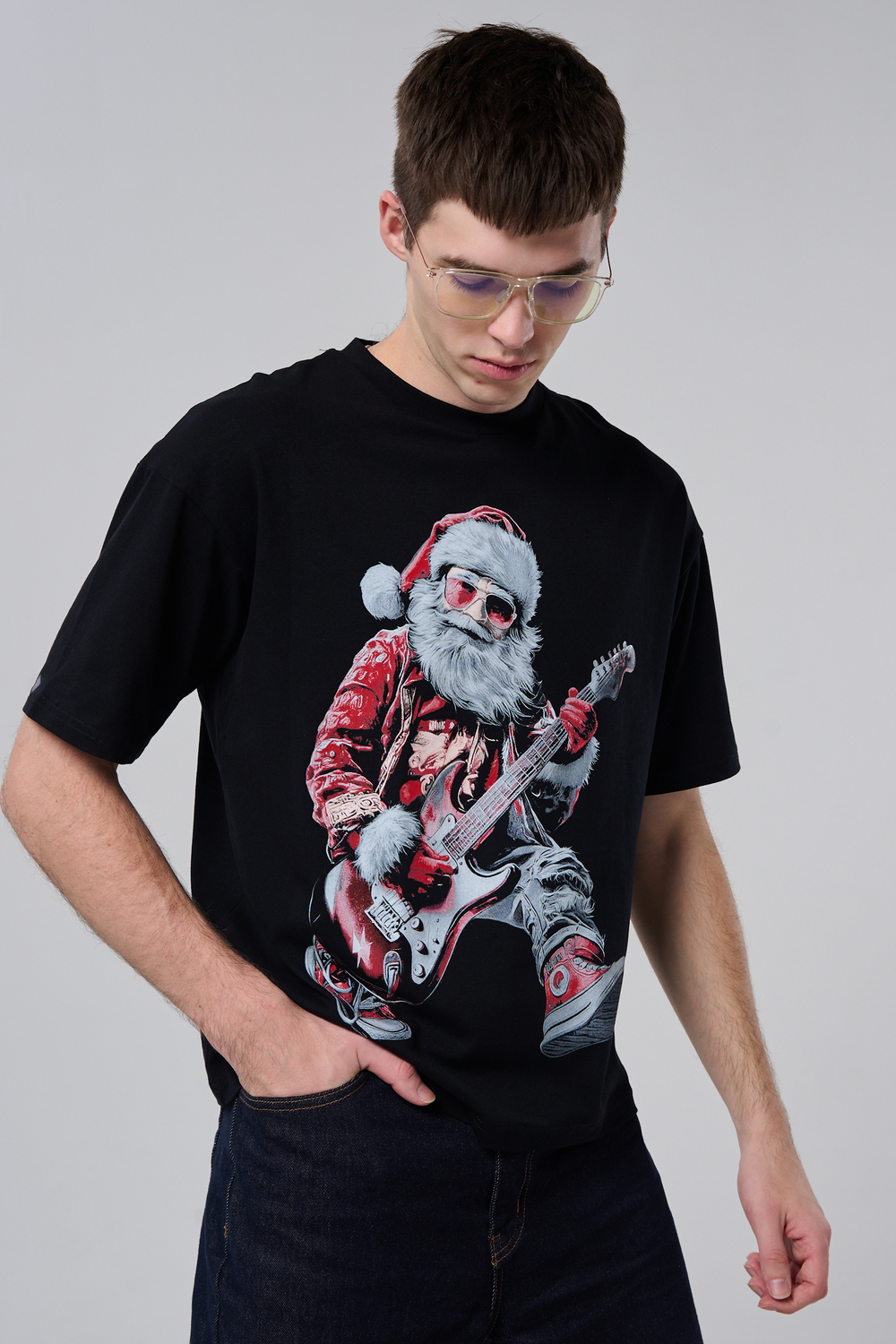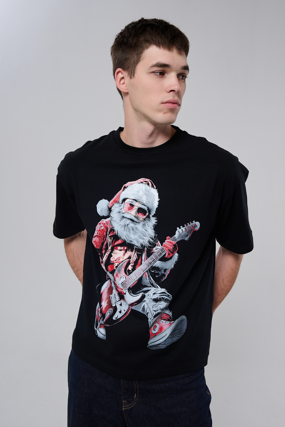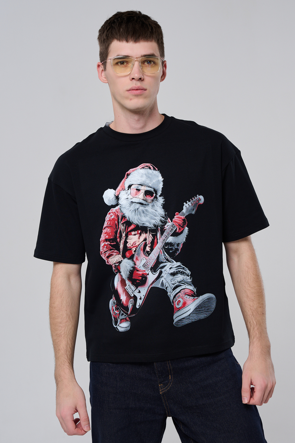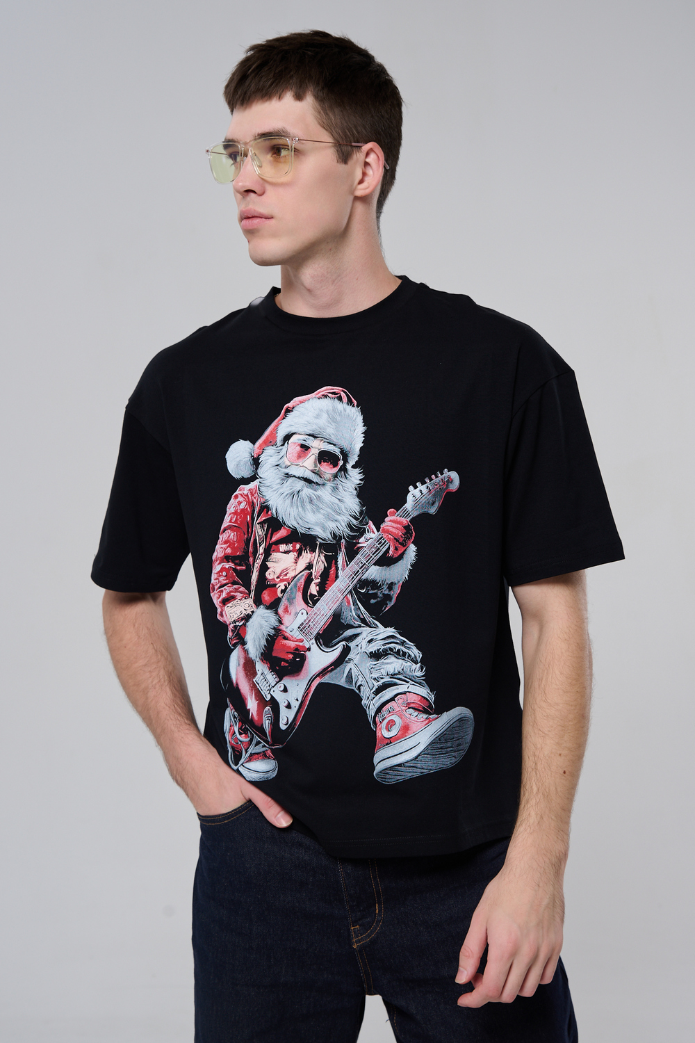 Погрузитесь в атмосферу праздничного рока с этой стильной чёрной футболкой! Главный герой — Санта-Клаус в образе крутого гитариста: красный костюм с меховой оторочкой, белая борода, озорная улыбка и электрогитара в руках. Он стоит в динамичной позе, готовый зажечь сцену, а на ногах — модные кеды. Дизайн выполнен в контрастных чёрно-красных тонах с детализированными элементами, включая татуировки на руках.