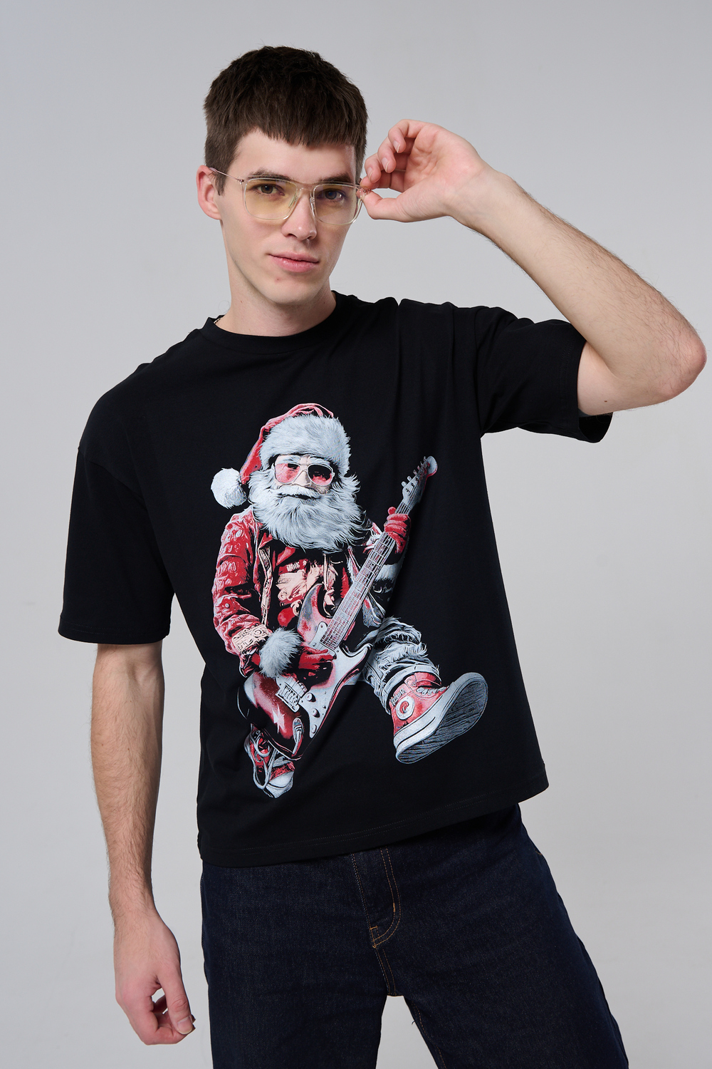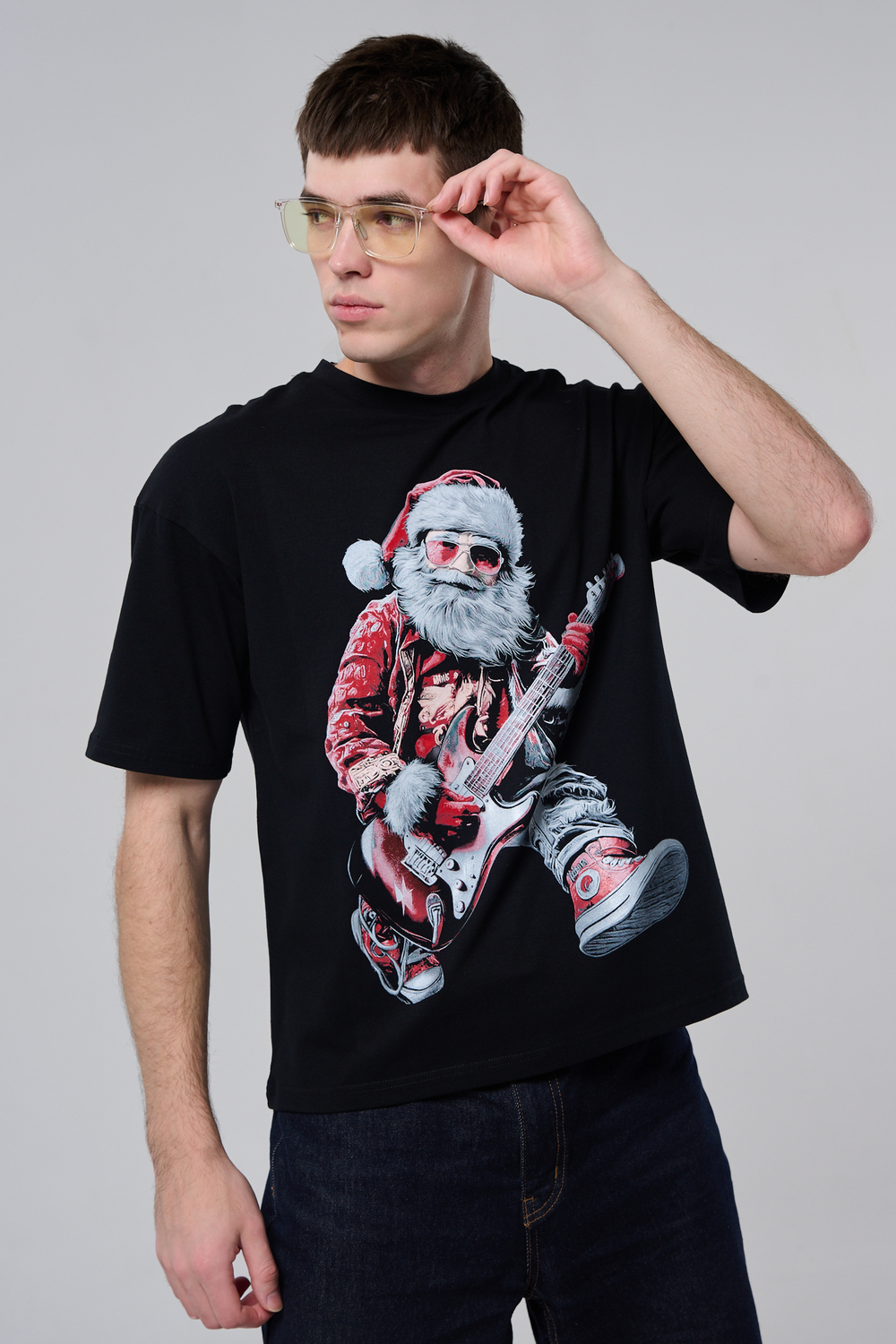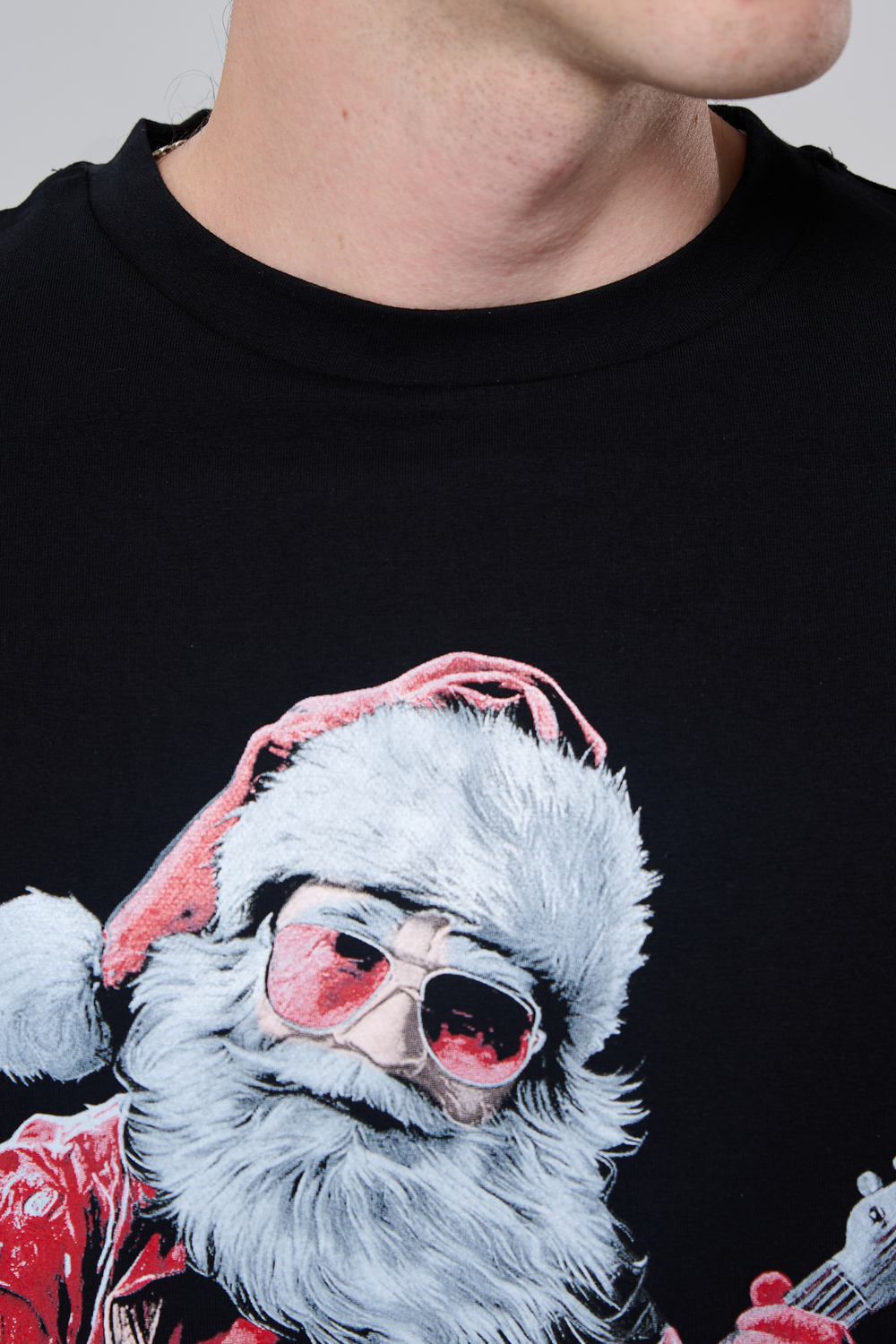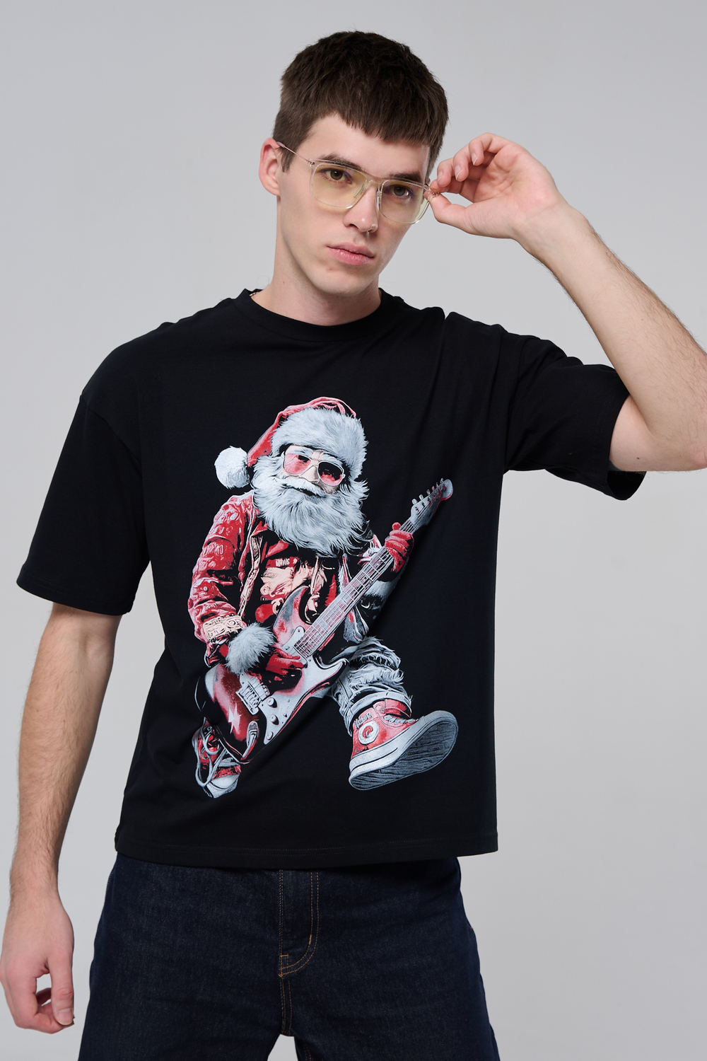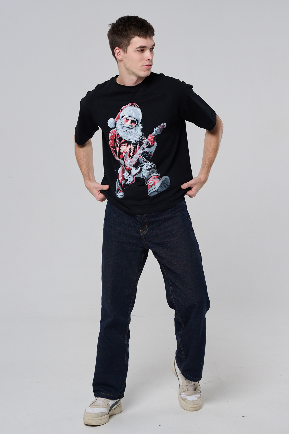 Погрузитесь в атмосферу праздничного рока с этой стильной чёрной футболкой! Главный герой — Санта-Клаус в образе крутого гитариста: красный костюм с меховой оторочкой, белая борода, озорная улыбка и электрогитара в руках. Он стоит в динамичной позе, готовый зажечь сцену, а на ногах — модные кеды. Дизайн выполнен в контрастных чёрно-красных тонах с детализированными элементами, включая татуировки на руках.