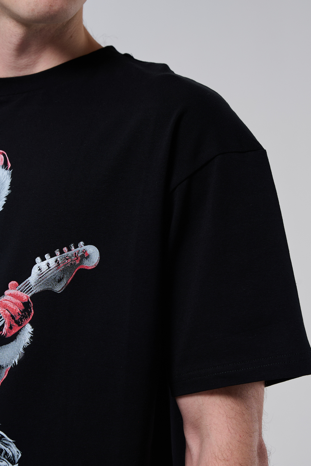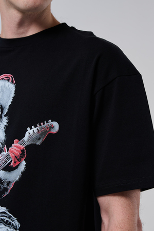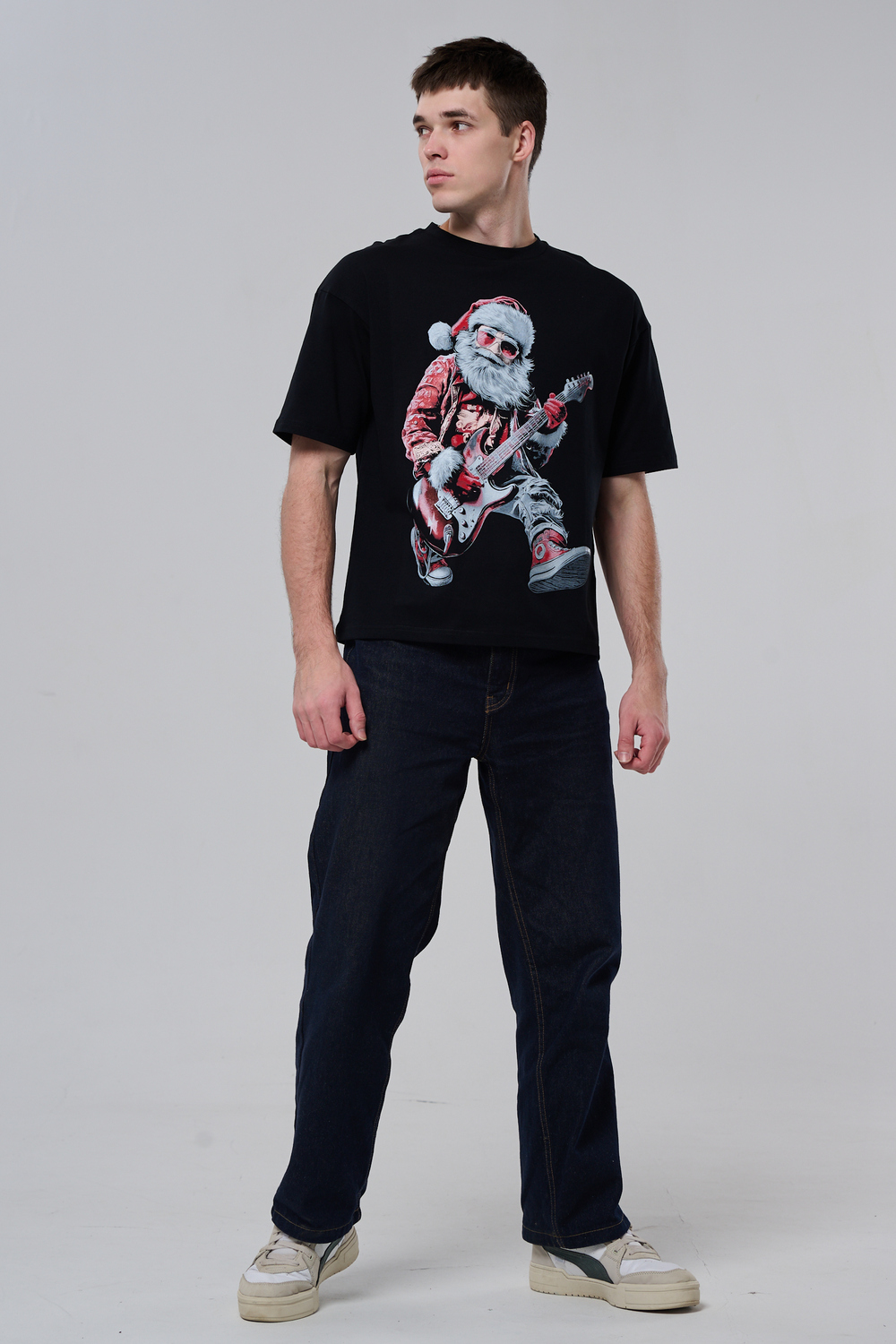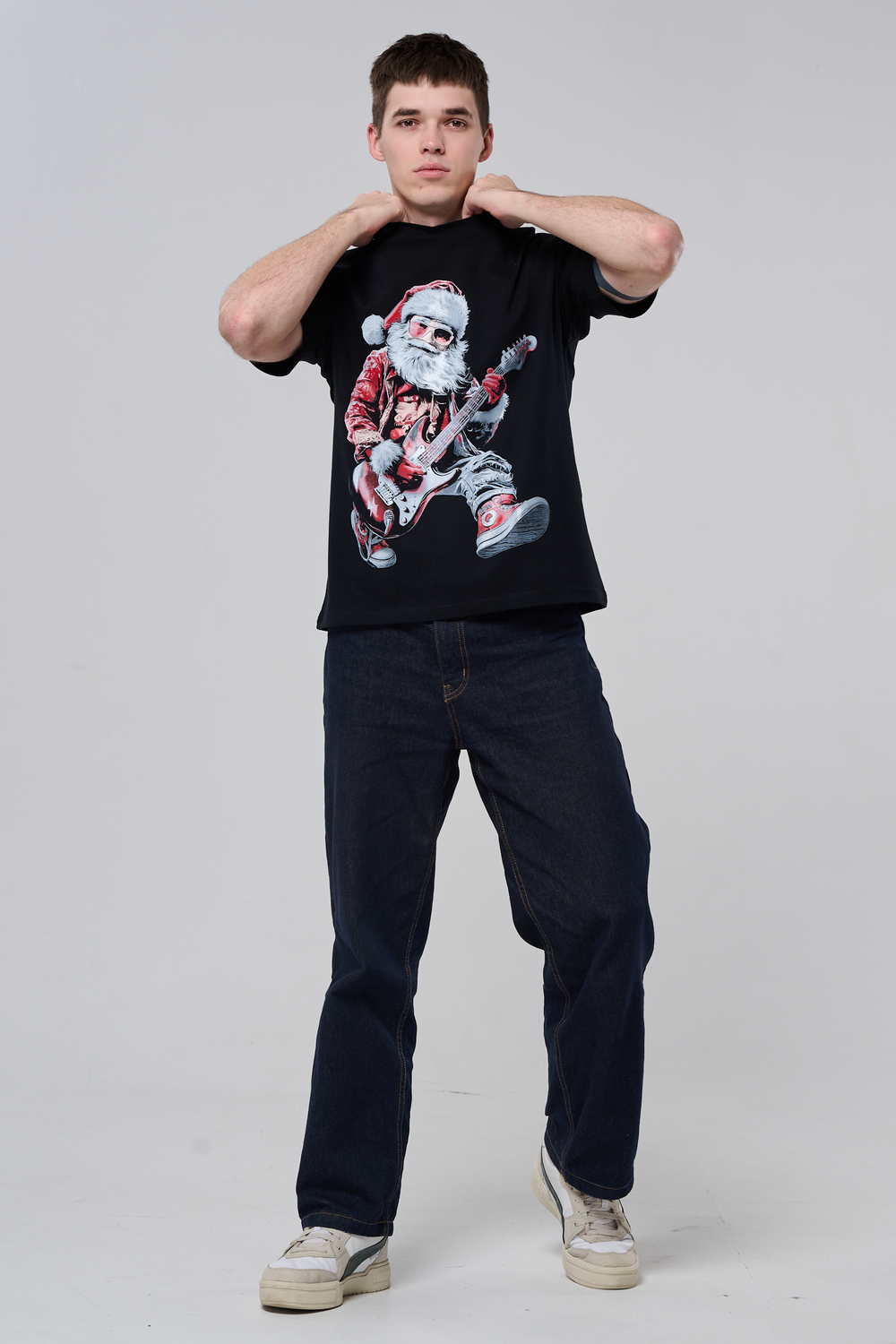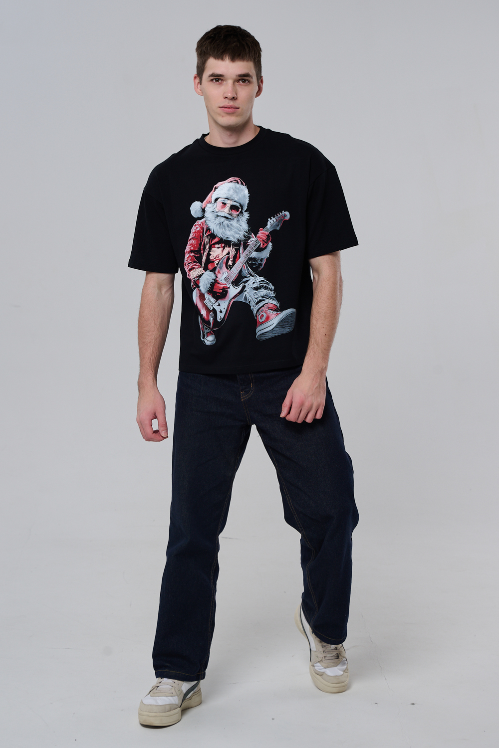 Погрузитесь в атмосферу праздничного рока с этой стильной чёрной футболкой! Главный герой — Санта-Клаус в образе крутого гитариста: красный костюм с меховой оторочкой, белая борода, озорная улыбка и электрогитара в руках. Он стоит в динамичной позе, готовый зажечь сцену, а на ногах — модные кеды. Дизайн выполнен в контрастных чёрно-красных тонах с детализированными элементами, включая татуировки на руках.