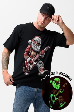 Особенность: принт светится в темноте! В ультрафиолетовом свете или полной темноте Санта засияет зелёным свечением — идеально для новогодних вечеринок, концертов или просто для wow-эффекта. Футболка из мягкого хлопкового трикотажа , oversize-крой для комфорта, круглый вырез. Размеры: 46-60. Подходит для casual-луков с джинсами или шортами.