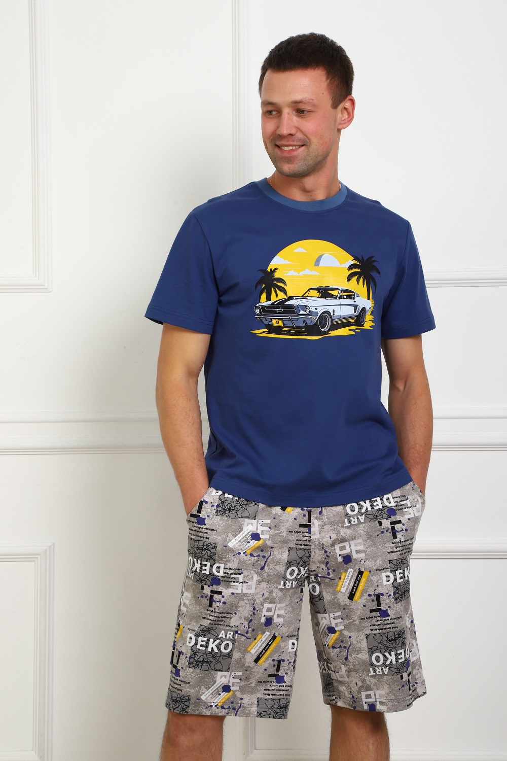 Костюм мужской: футболка с атмосферным принтом на груди, с короткими рукавами и шорты на эластичном поясе, с боковыми карманами. Комфорт 100% хлопка.